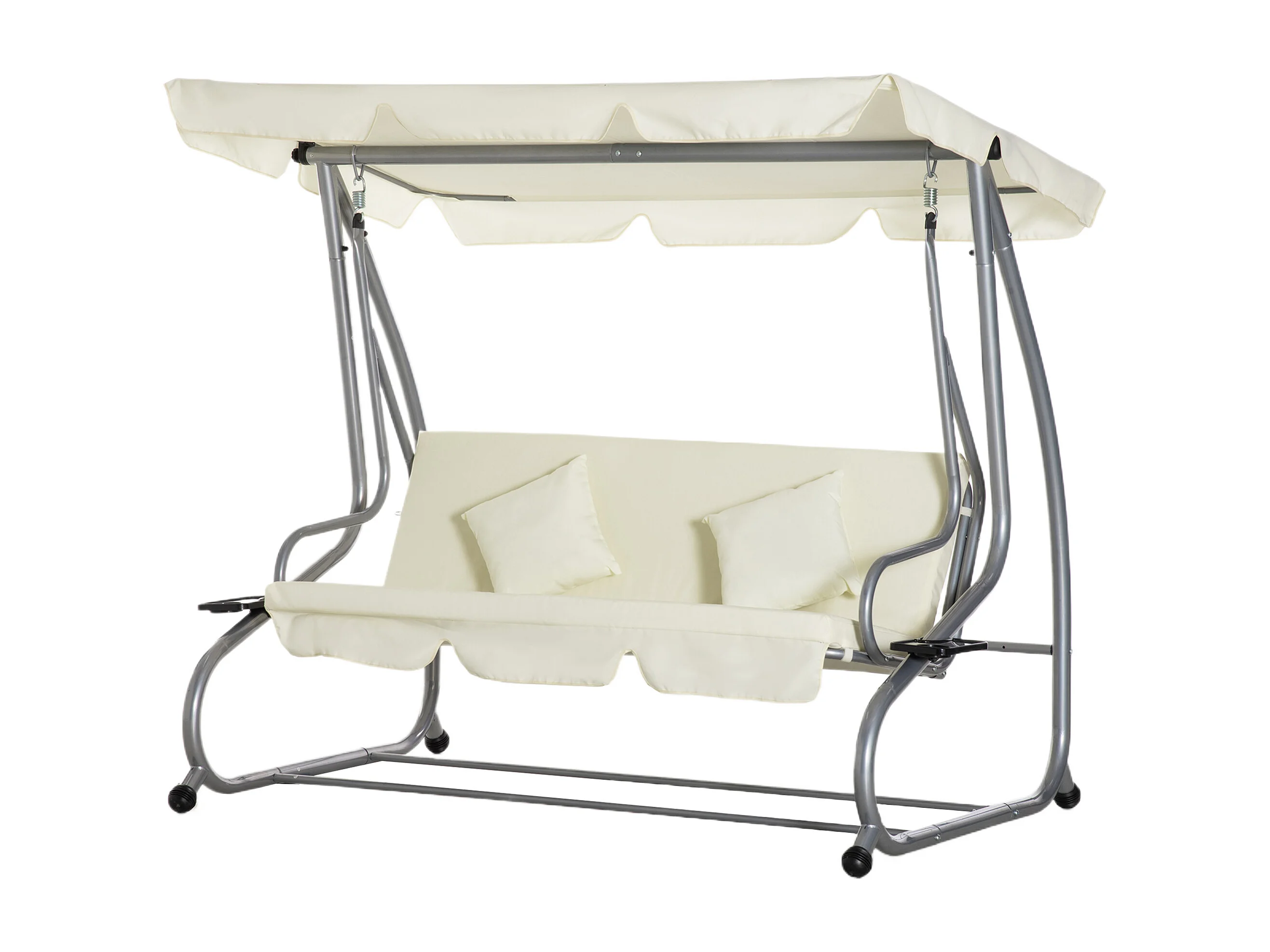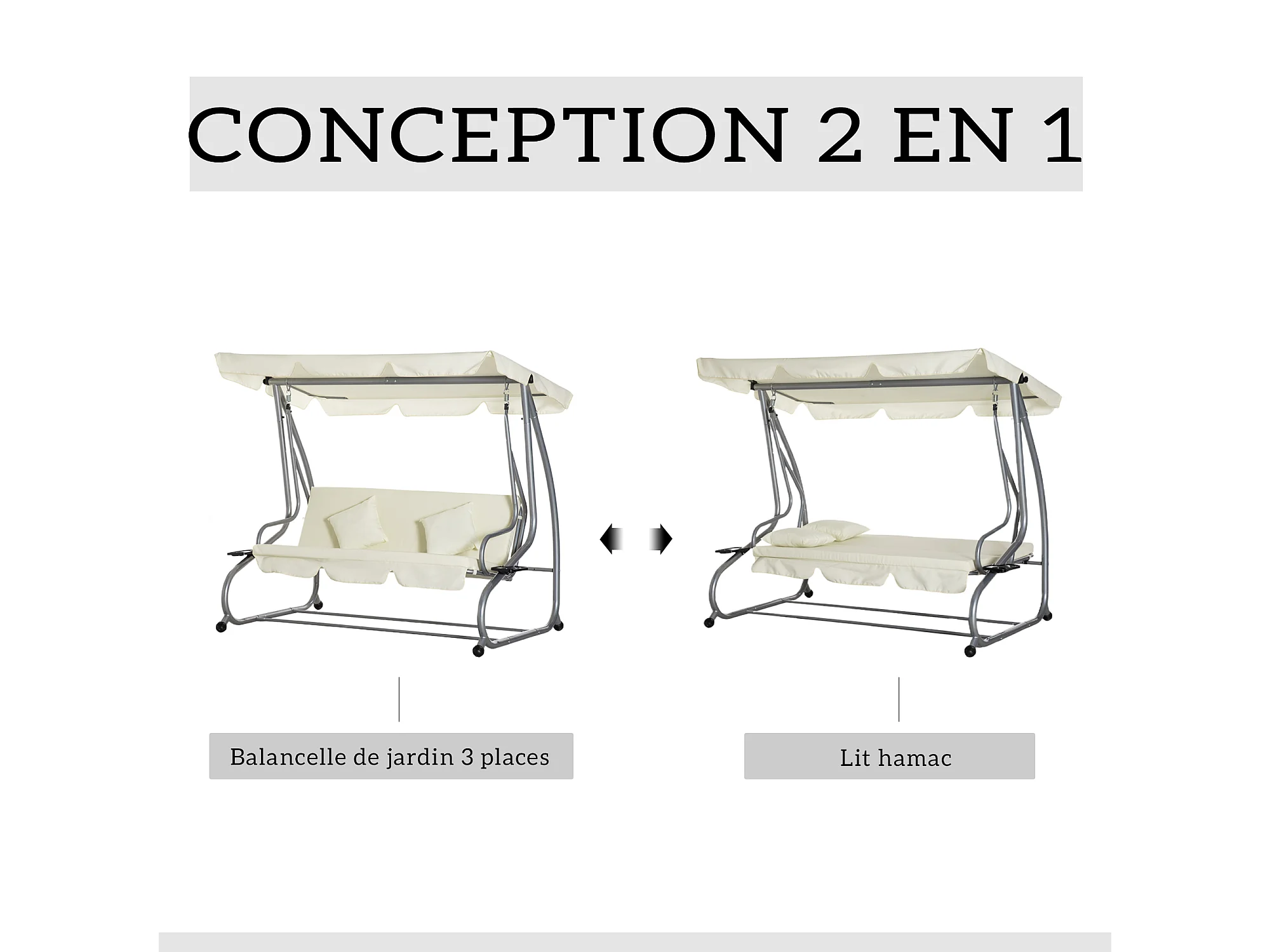 Balancelle de jardin 3 places convertible toit inclinaison réglable 2 tablettes support acier époxy gris polyester crème
