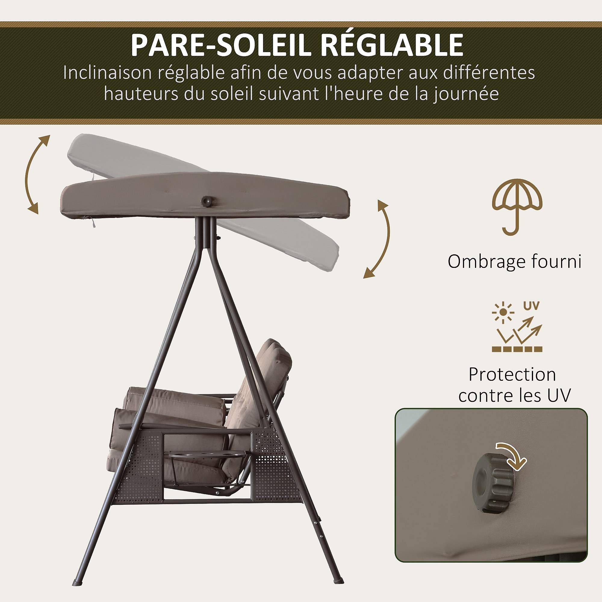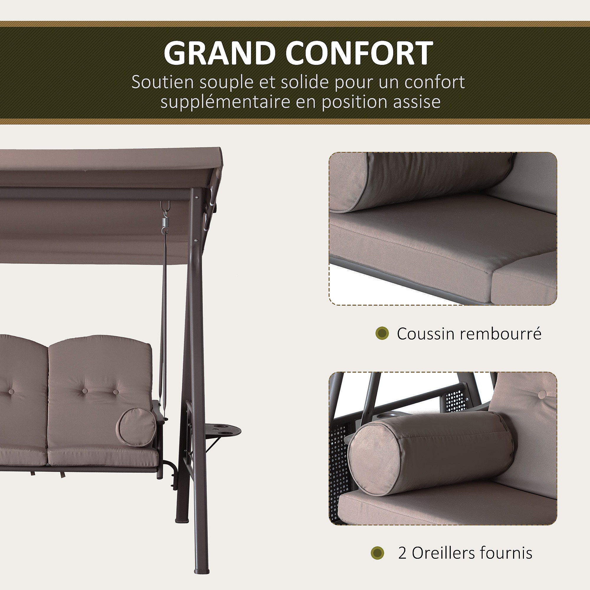 Balancelle de jardin 3 places grand confort toit inclinaison réglable coussins plateaux rétractables polyester filé marron