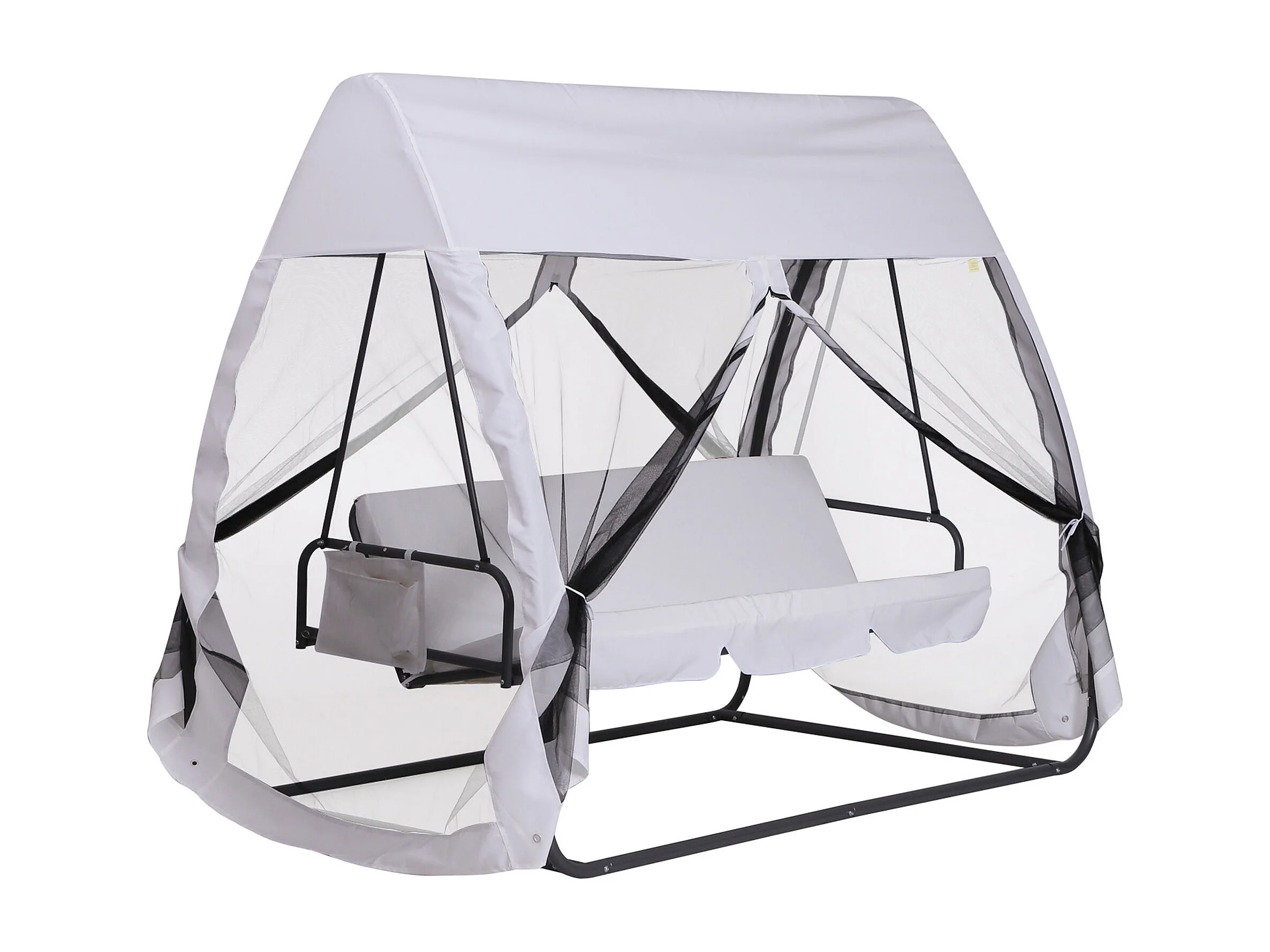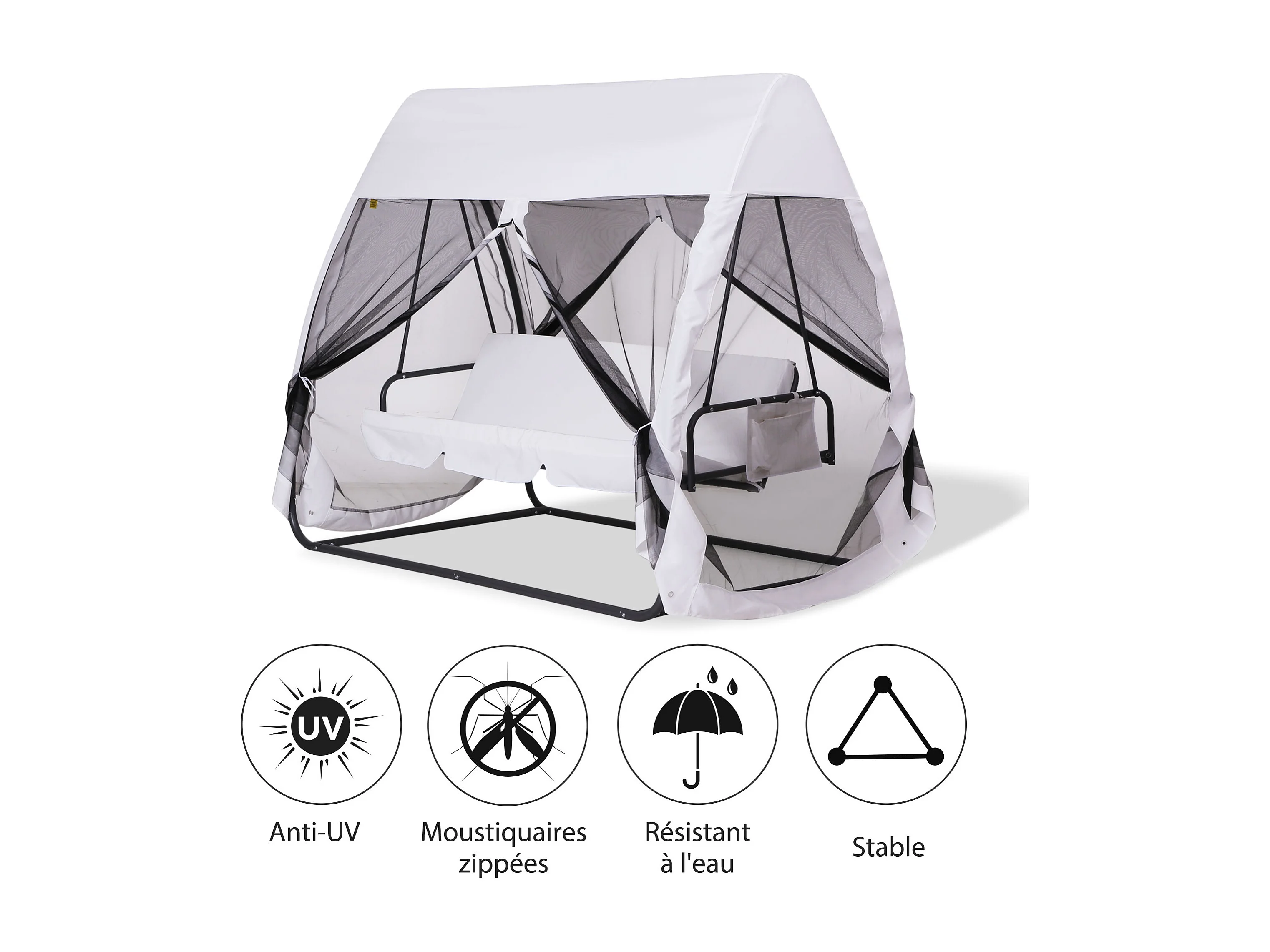Balancelle de jardin convertible 3 places grand confort : matelas assise dossier, moustiquaire intégrale zippée avec toit, pochette rangement métal époxy polyester