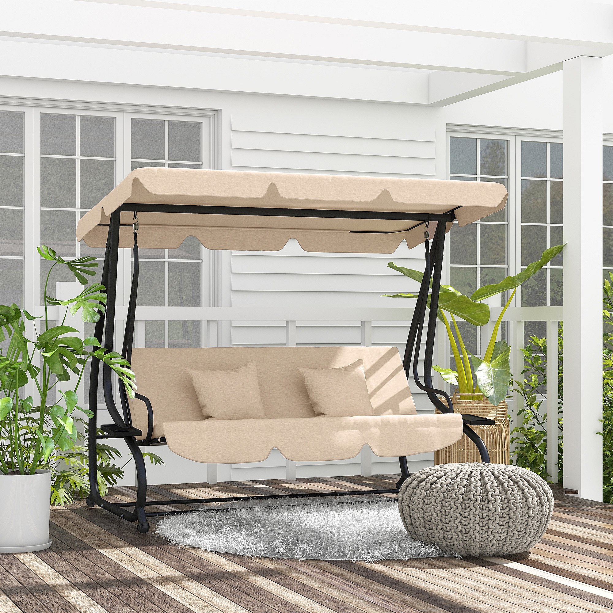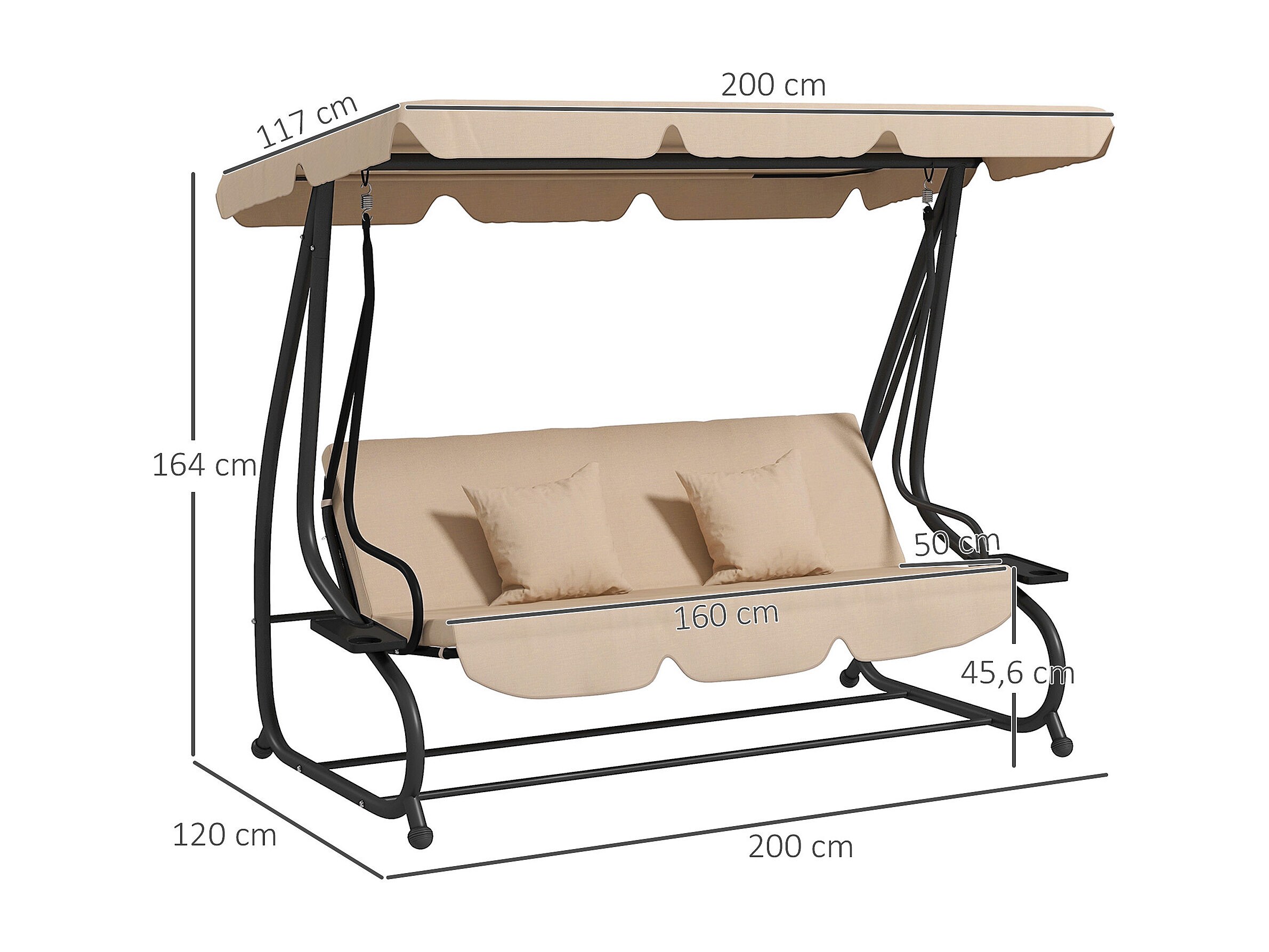 Balancelle de jardin convertible 3 places inclinaison toit réglable 2 tablettes + matelas 2L x 1,2l x 1,64H m métal époxy noir polyester sable
