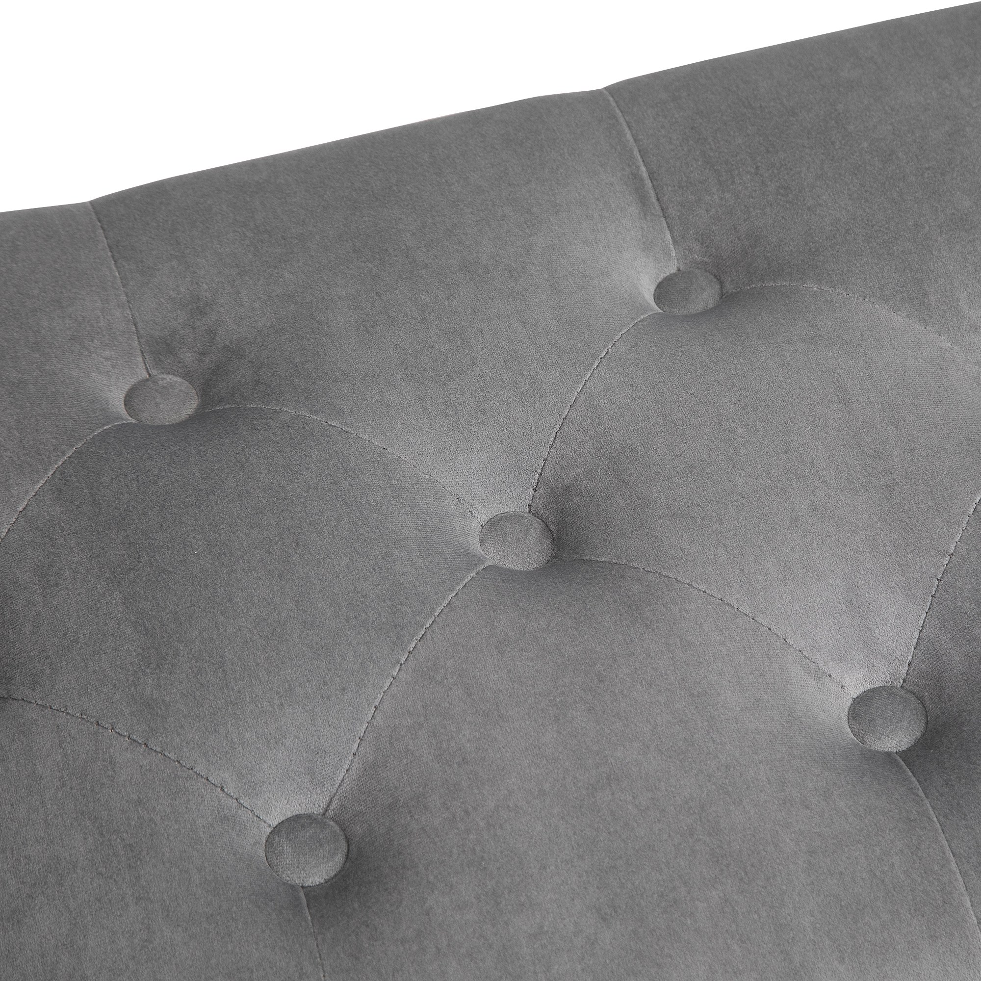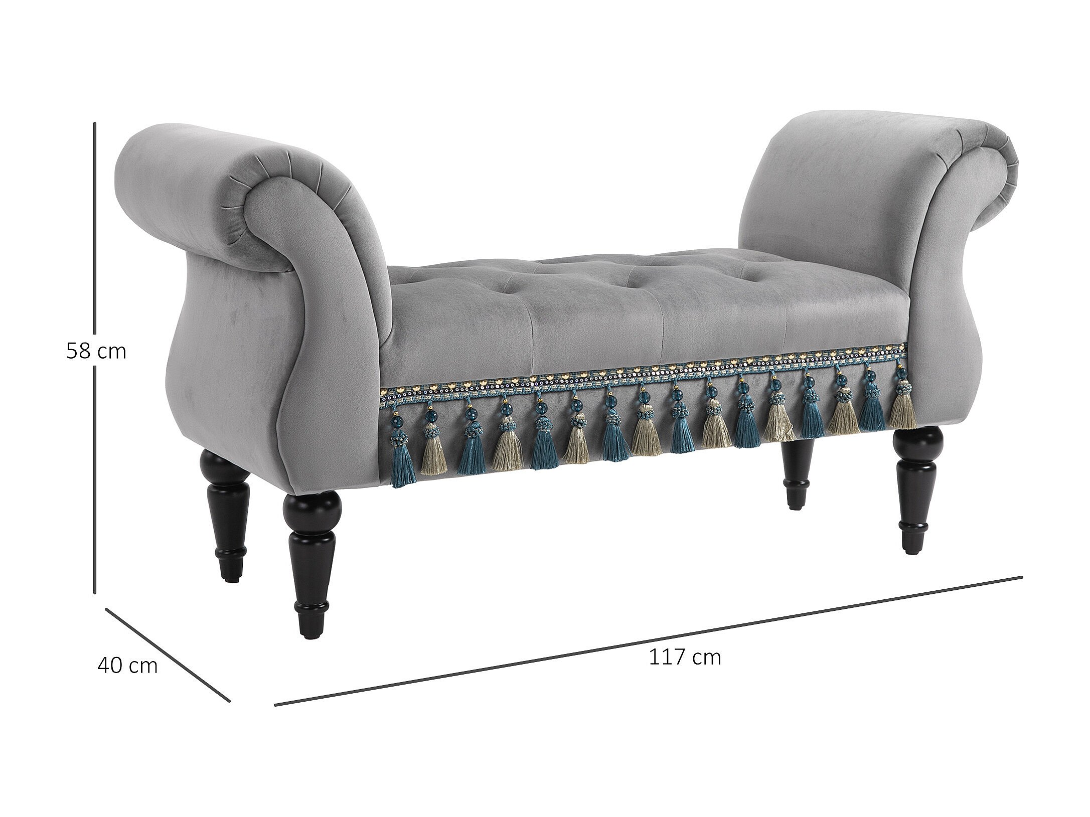 Banc banquette capitonnée design accoudoirs courbés pompons pieds bois hévéa revêtement velours gris