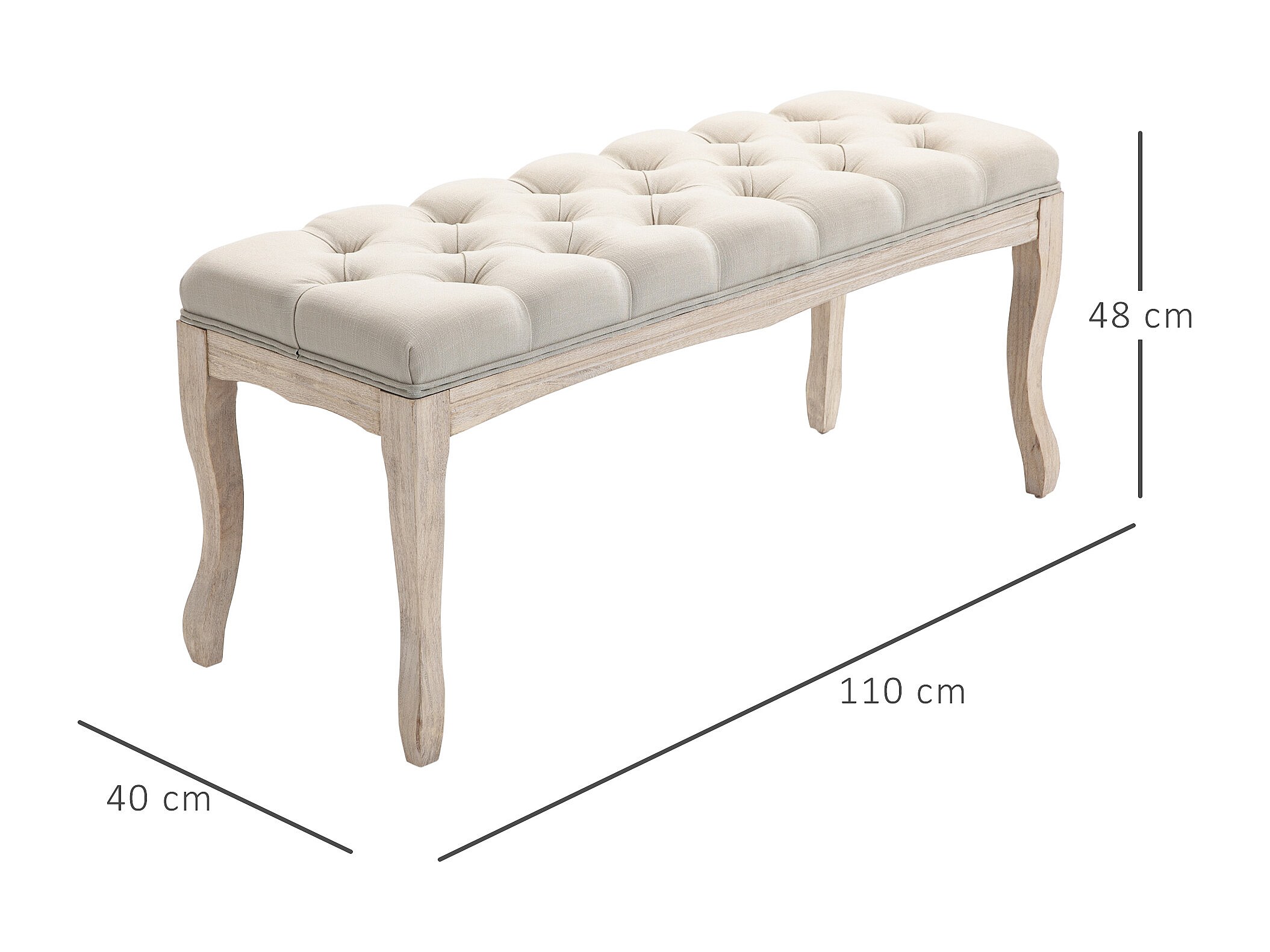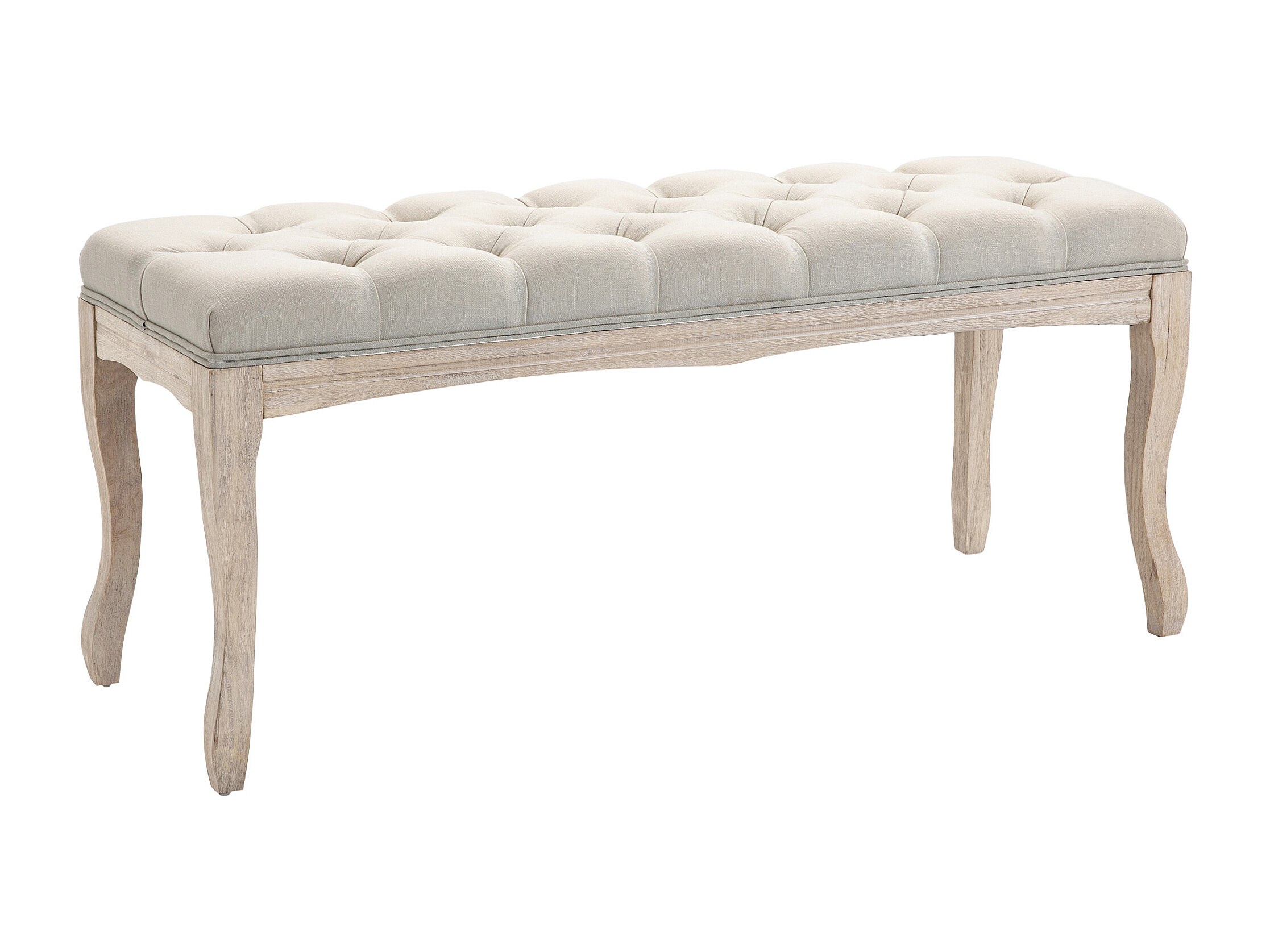 Banc banquette capitonnée style classique chic dim. 110L x 40l x 48H cm piètement bois hévéa sculpté lin beige