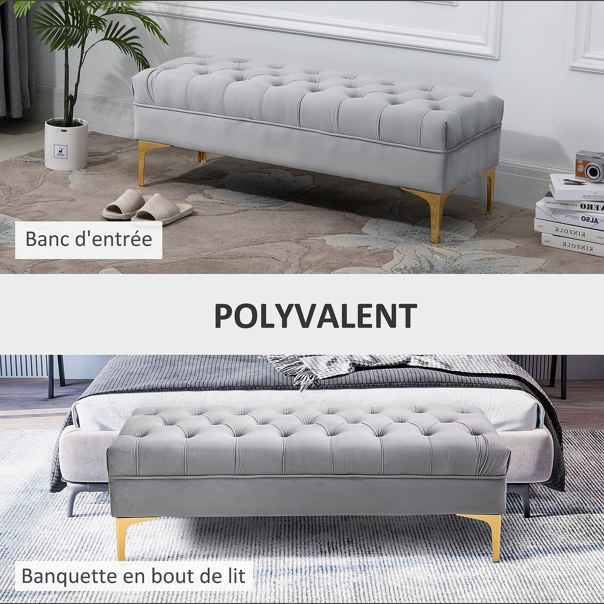 Banc banquette capitonnée style classique chic dim. 118L x 45l x 42H cm piètement métal doré velours gris clair