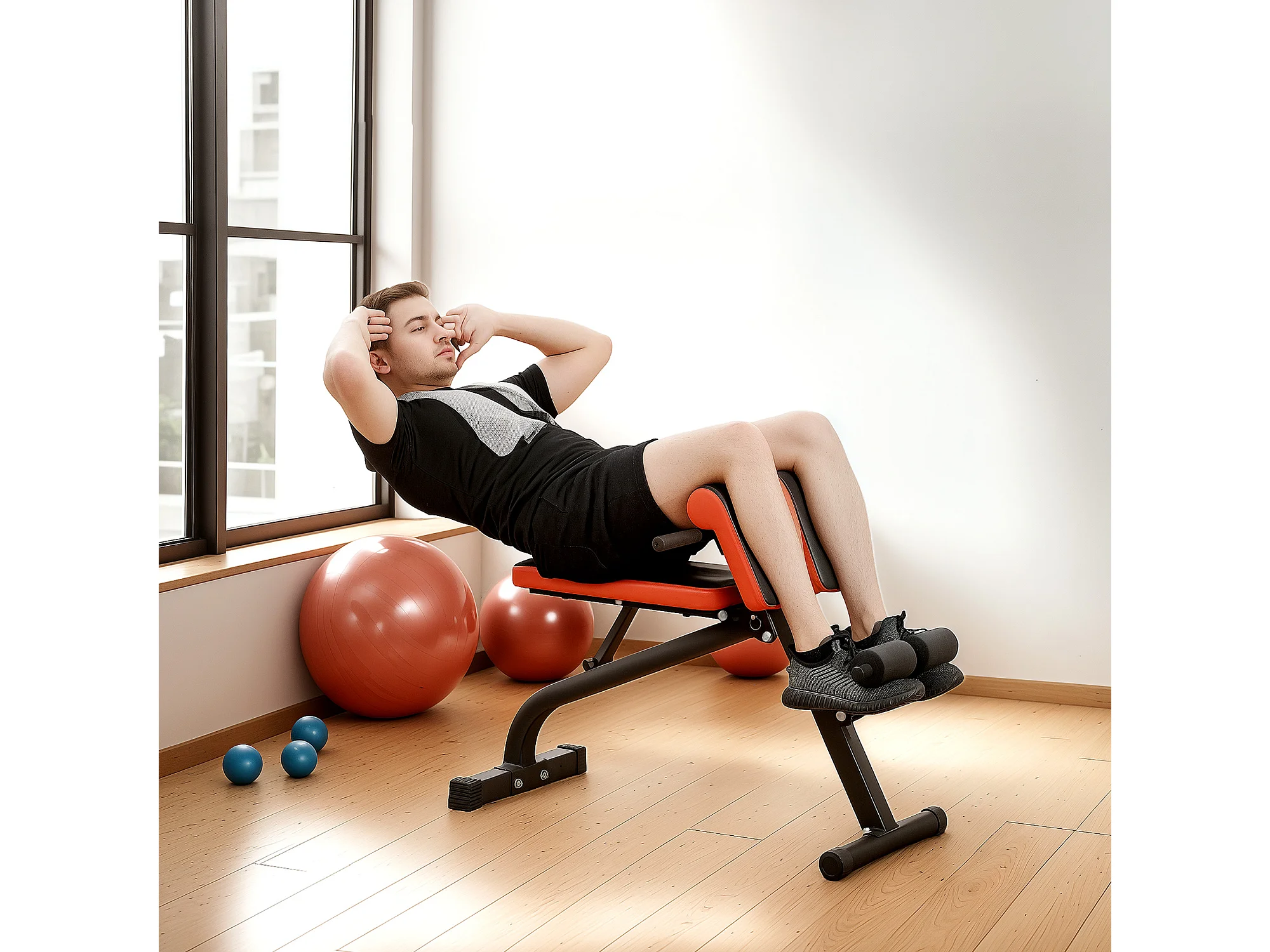 Banc de musculation 150L x 150l x 76H cm hauteur coussin abdominal réglable 7 niveaux dossier rembourré acier noir rouge