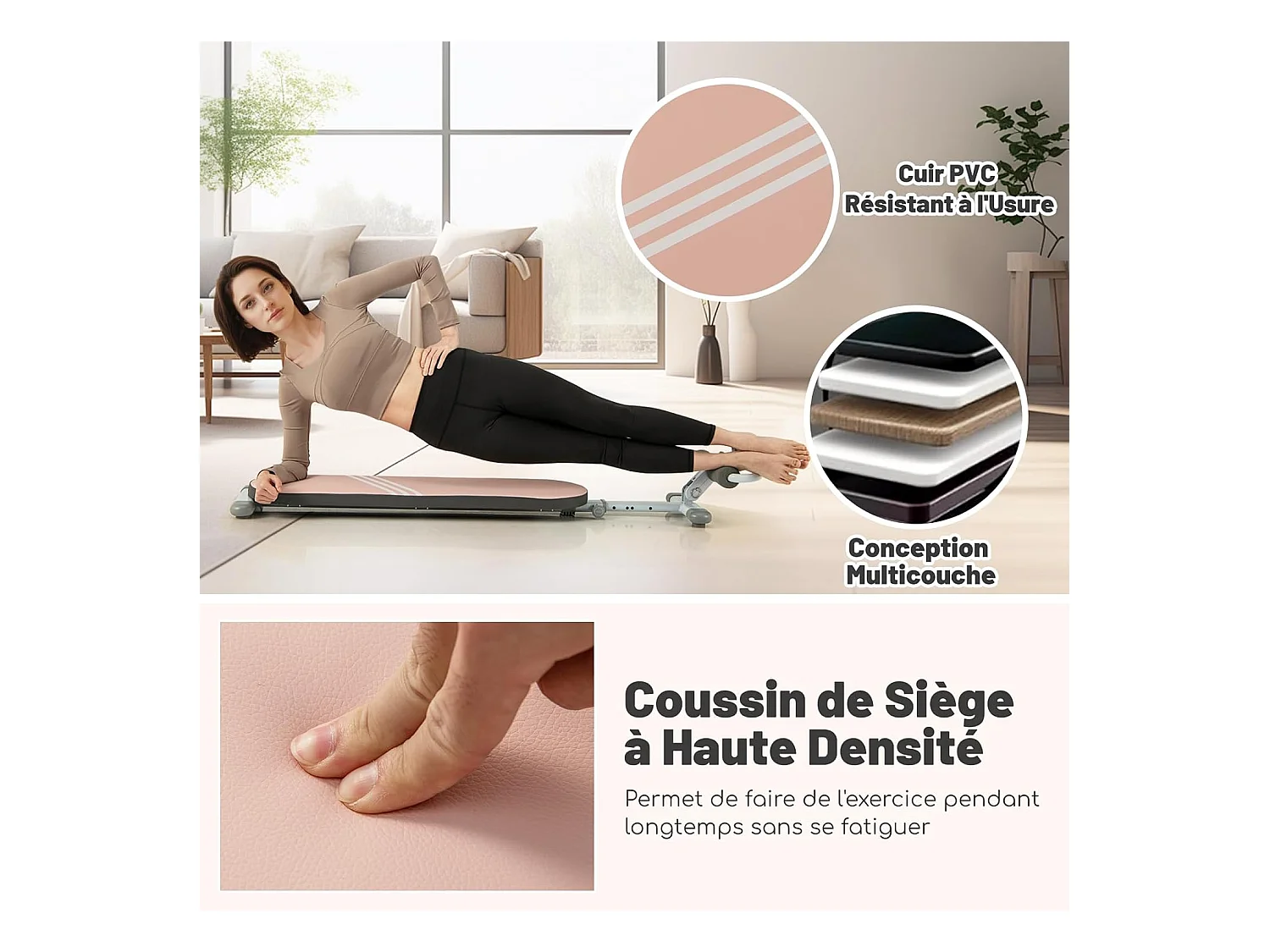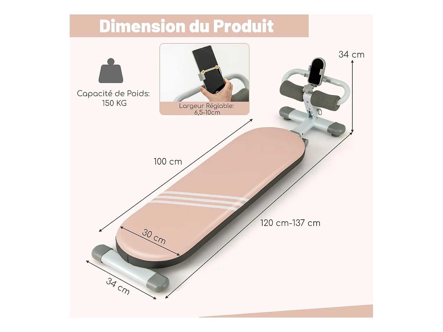 Banc de Musculation Multifonction avec 3 Angles et Longueur Réglable, Banc de Redressement Assis Pliable Charge 150KG, Plateforme d'Entraînement (Rose)