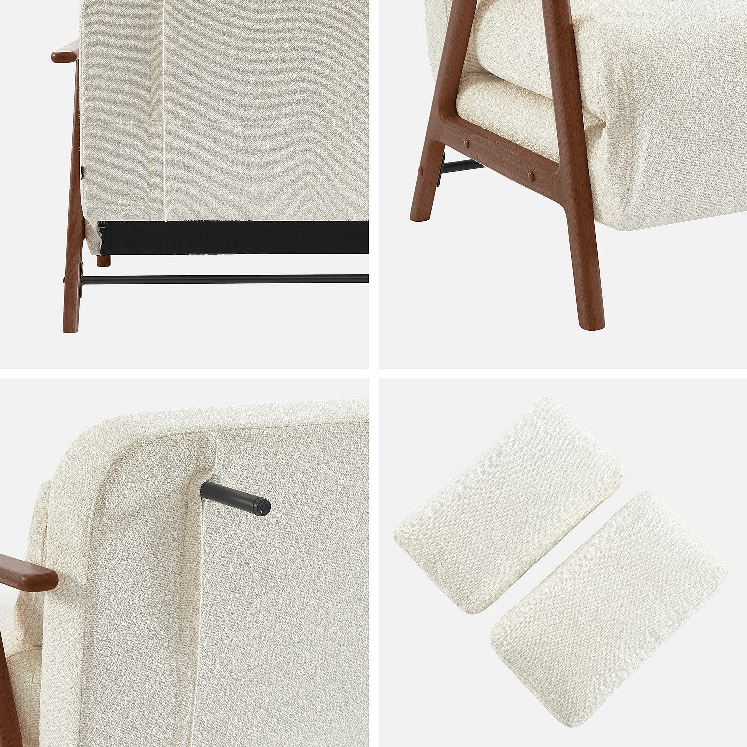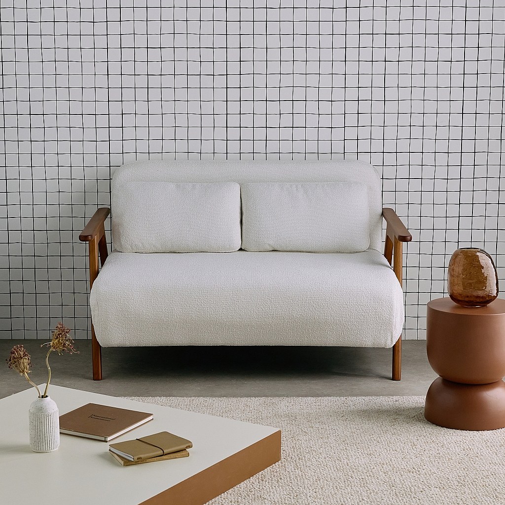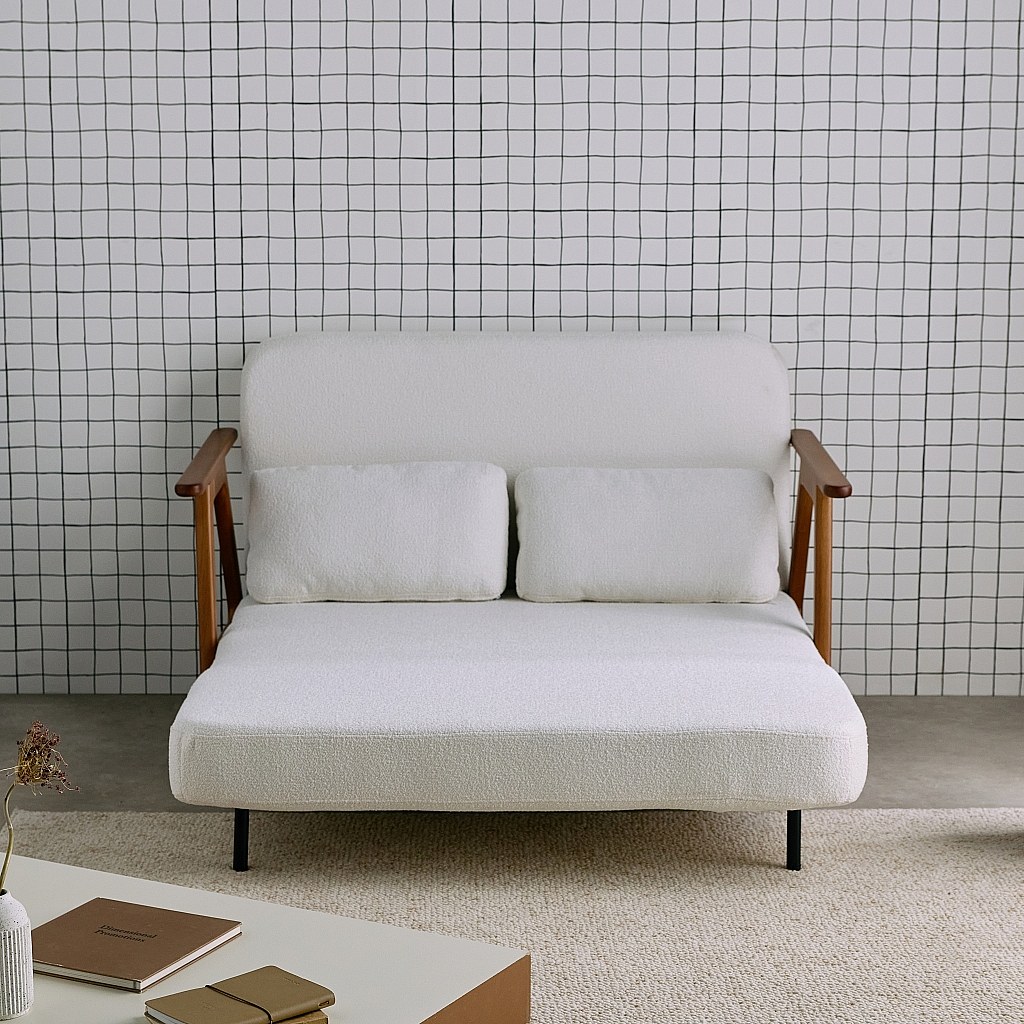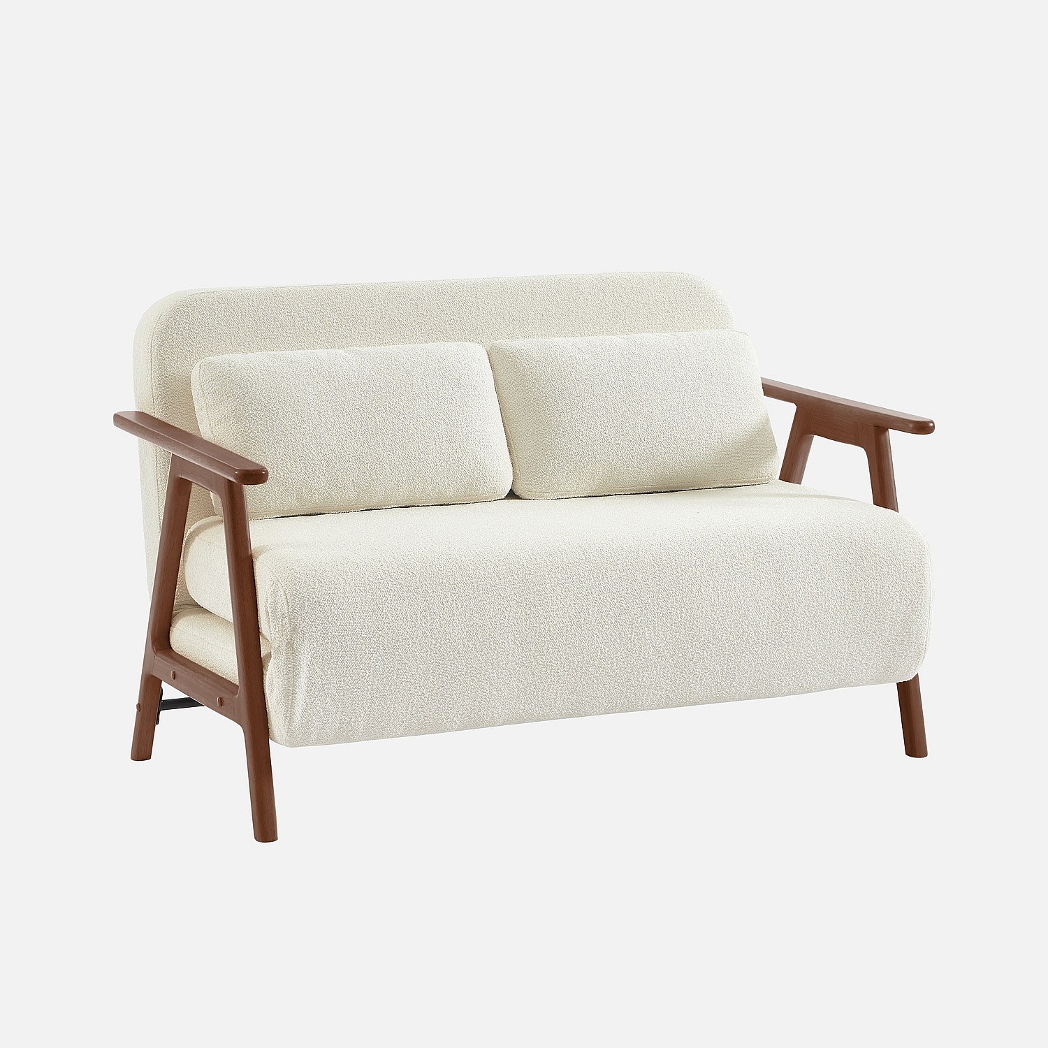 Banquette canapé convertible 2 places bois d'hévéa teinté noyer clair et bouclette texturée blanche L 133 x P 81 x 84cm - Sven