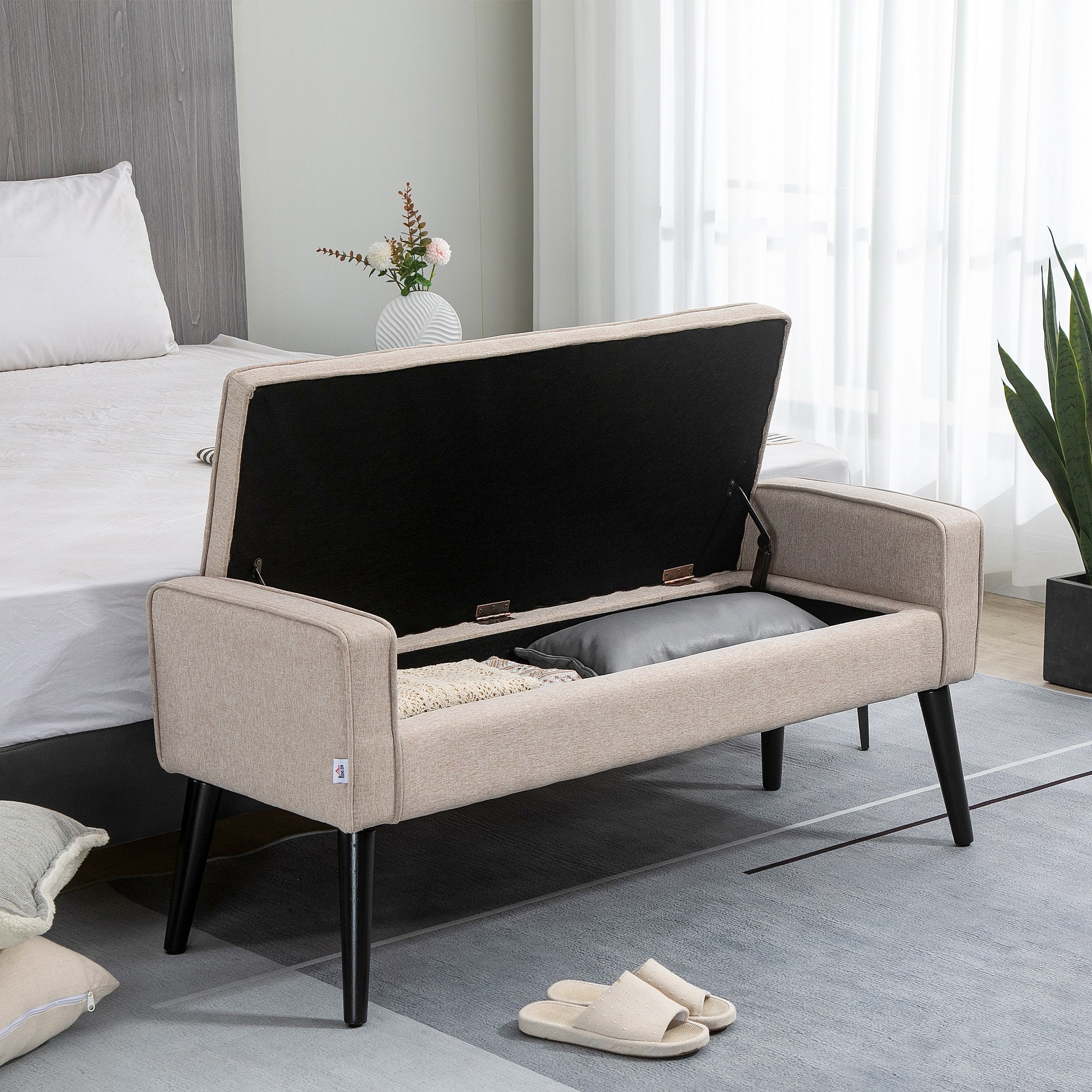 Banquette coffre de rangement 2 en 1 style contemporain pieds effilés bois d'hévéa noir aspect lin beige