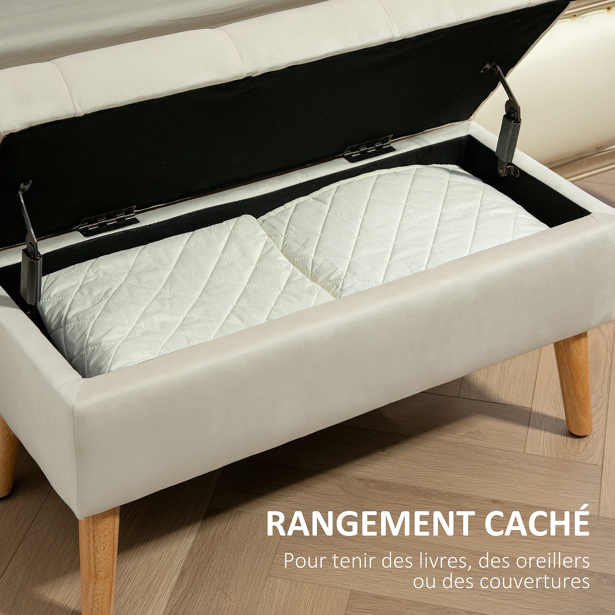 Banquette coffre design scandinave - piètement effilé bois assise effet capitonné velours crème