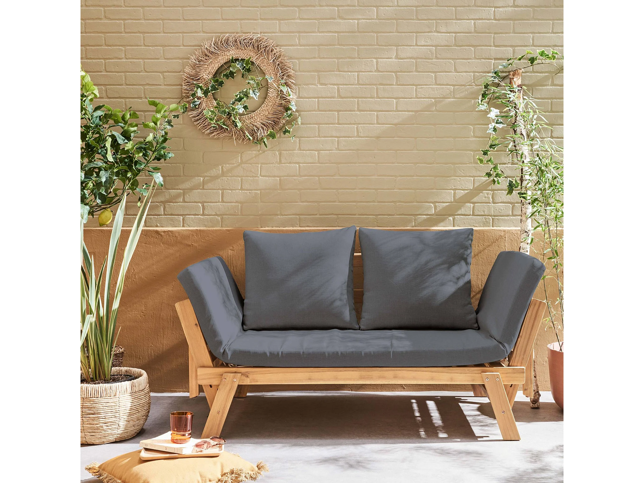 Banquette de jardin grise 2/3 places Jalance. accoudoirs modulables 155/200x72x74.5cm