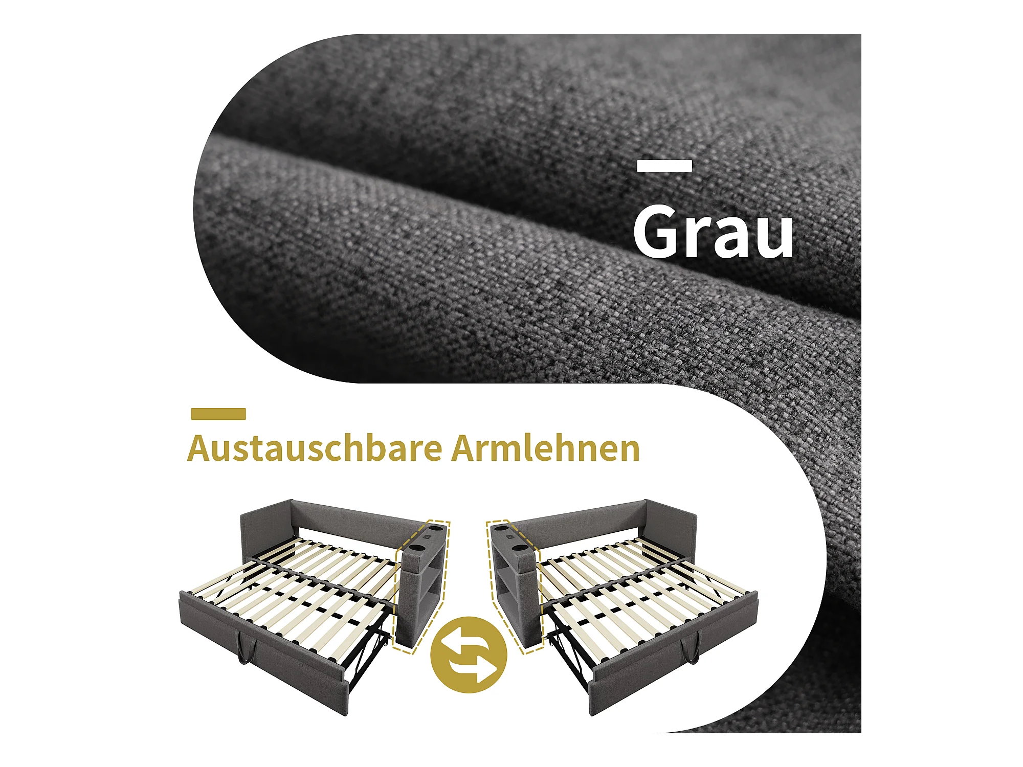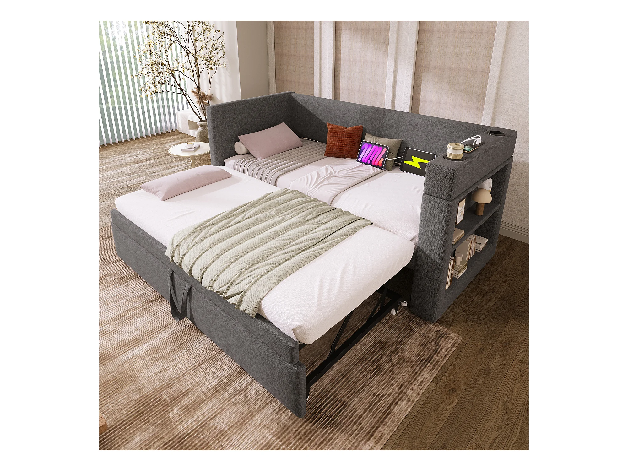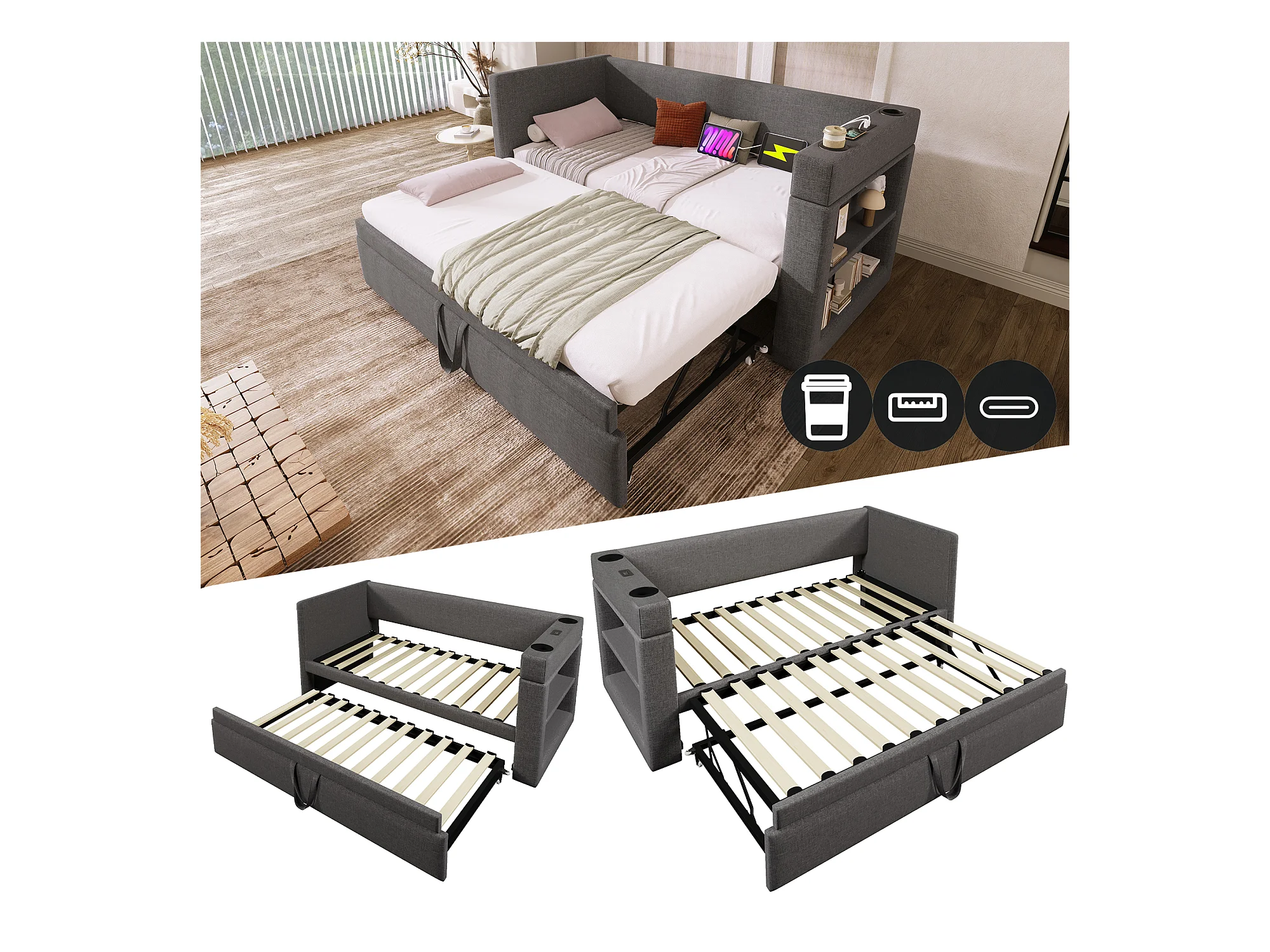 Banquette-lit - 2 x 90 x 190 cm - avec lit gigogne - accoudoirs avec USB Type-C + rangement - bois + coton + métal - gris