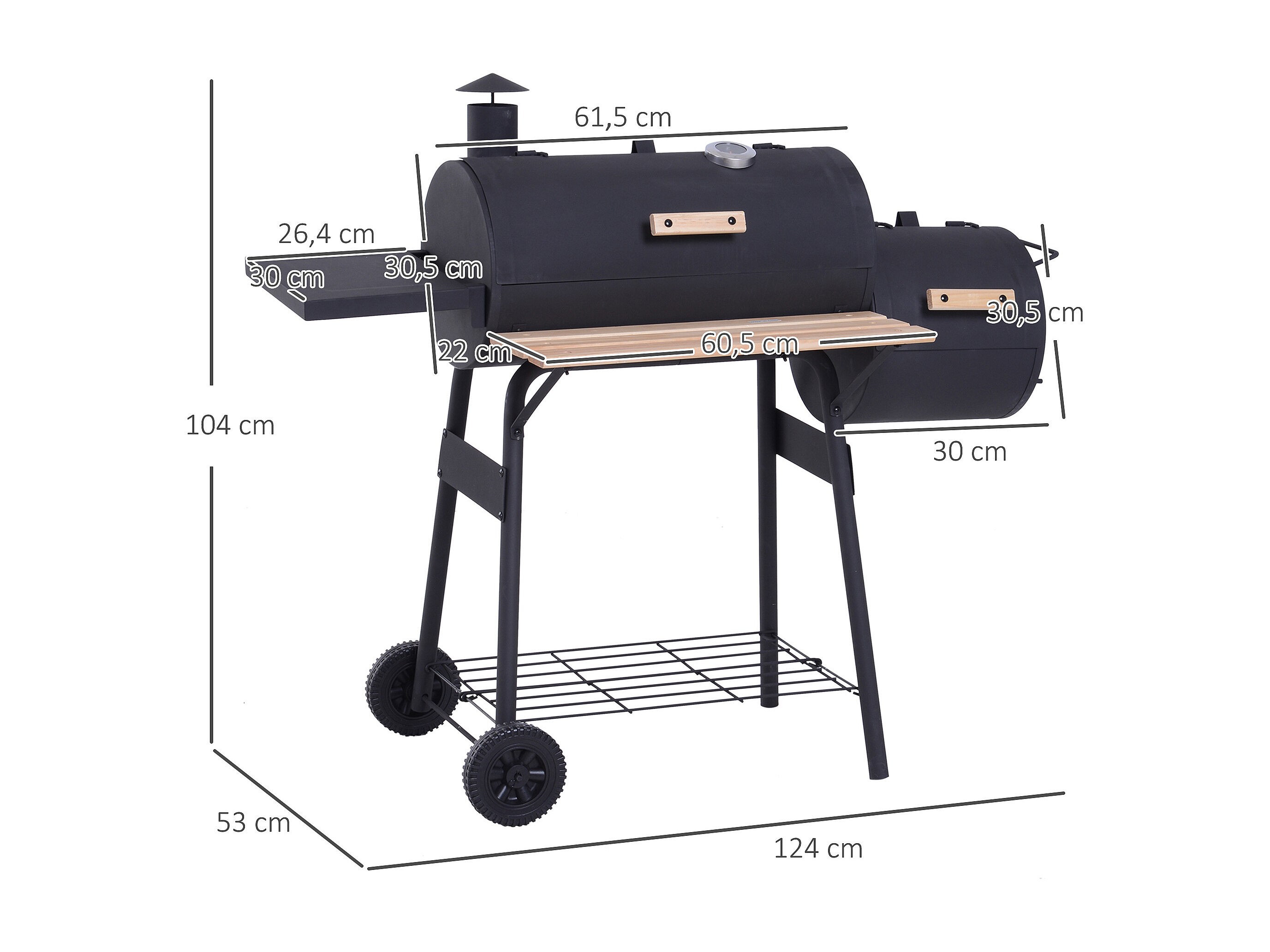 Barbecue à charbon fumoir BBQ grill smoker sur pied avec couvercle, roulettes, thermomètre, étagères acier laminé à froid noir