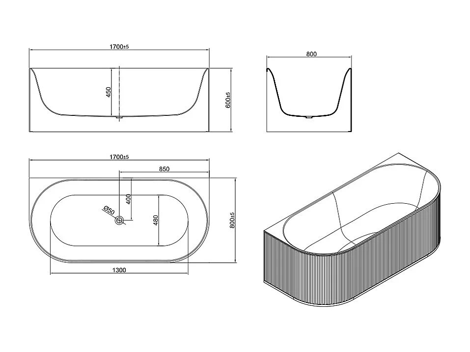 Baignoire semi îlot striée - 290L - 170 x 80 x 60 cm - Blanc mat - Acrylique - BARBORI