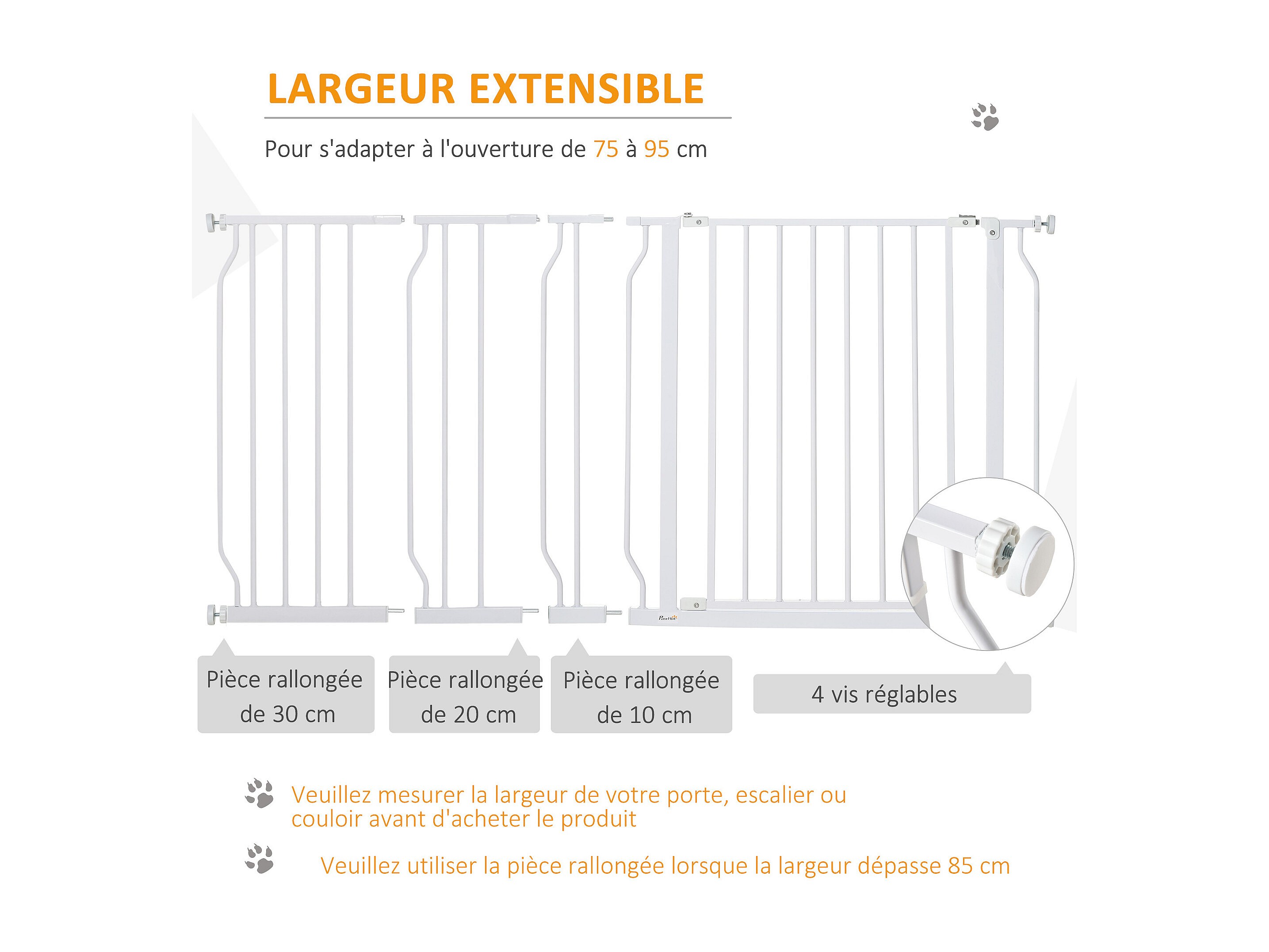Barrière de sécurité barrière pour animal domestique longueur réglable barrière escaliers couloirs portes sans perçage en acier et ABS dim. 75-115L x 76H cm blanc