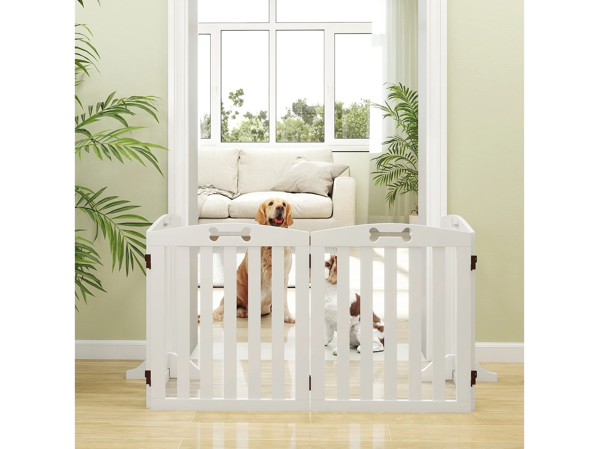 Barrière de sécurité chien pliable adaptable motif os - piètement support antidérapant - 207 x 30 x 61 cm - MDF blanc