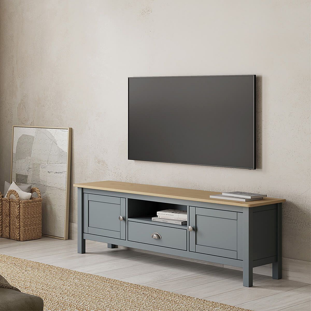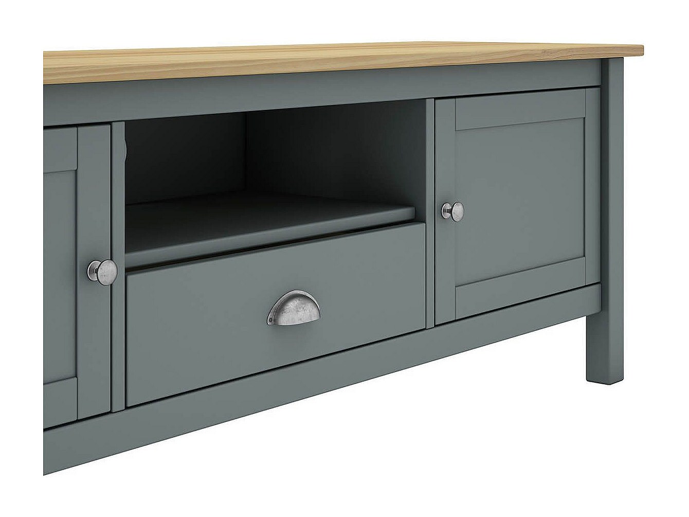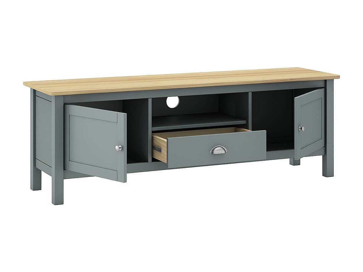 BASCO - Meuble TV 2 Portes 1 Tiroir en Pin Massif Naturel et Vert Céladon