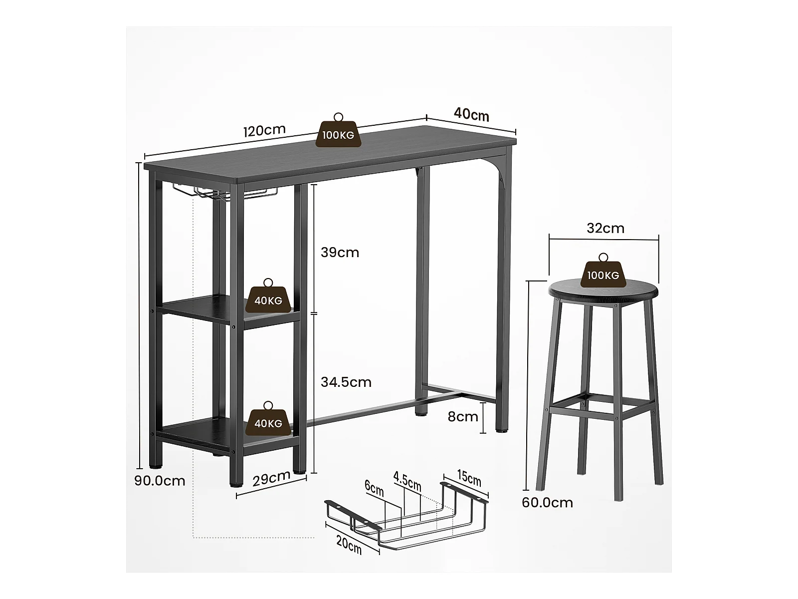 Table Haute avec Tabouret, avec Porte-Verre Porte-Bouteilles, Table de Bar avec Tabouret 2 Personnes Compact, Brun Rustique