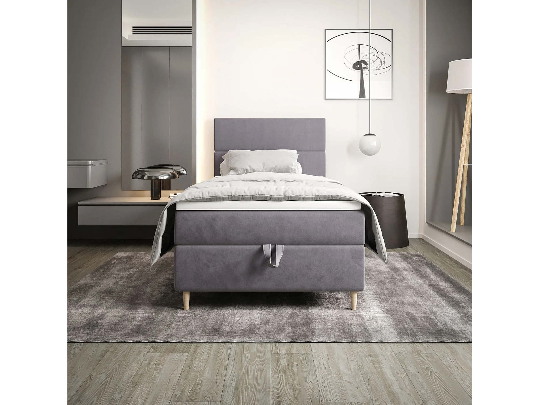 BEDANTE Lit boxspring FLO 80x200 Itaka 50 Gris clair Lit Coffre Lit simple Lit d'hôtel Surmatelas Matelas Chambre Rangement