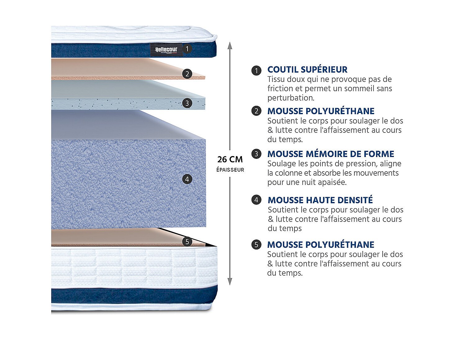 BELLECOUR LITERIE | Ensemble CHENONCEAU 180x200 cm | Matelas Mémoire de forme + Sommier Bois