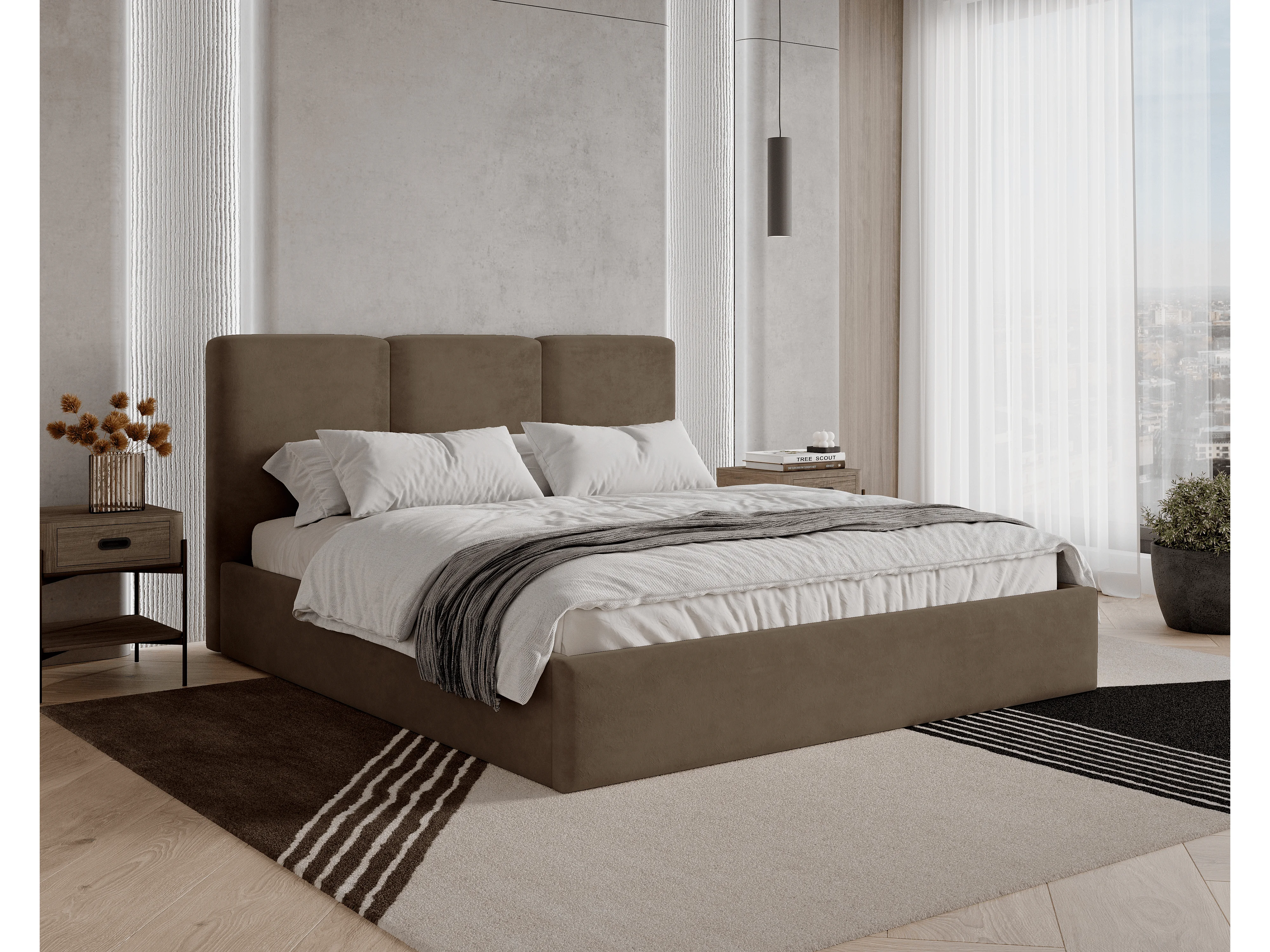 BESILIO Lit tapissé avec coffre de rangement 160x200 Mira – lit fin et minimaliste avec cadre en métal – Marron