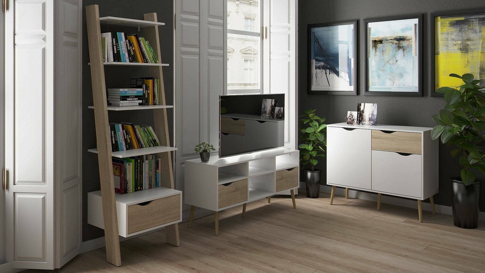 Bibliothèque Apiro, Etagère de bureau, Porte-livre mobile, Librairie, 207x166 h84 cm, Blanc et chêne