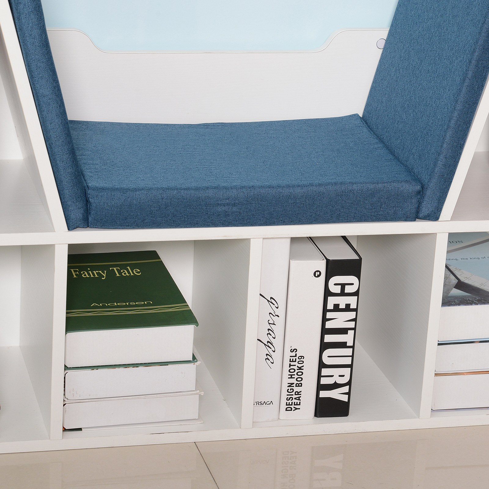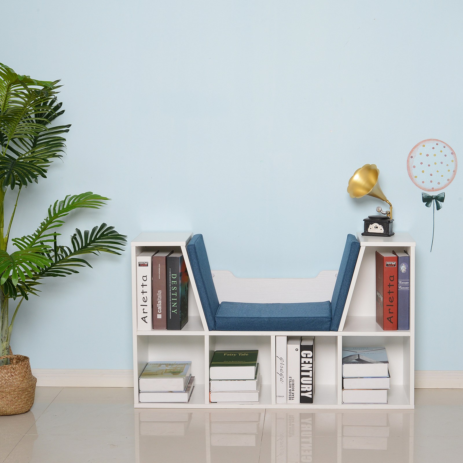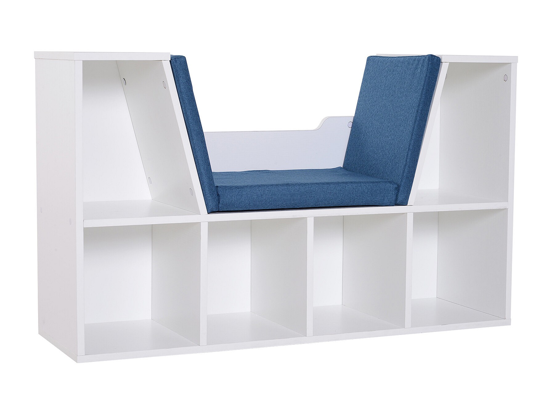 Bibliothèque banc 2 en 1 design contemporain 6 casiers 3 coussins fournis 102L x 30l x 61H cm blanc bleu