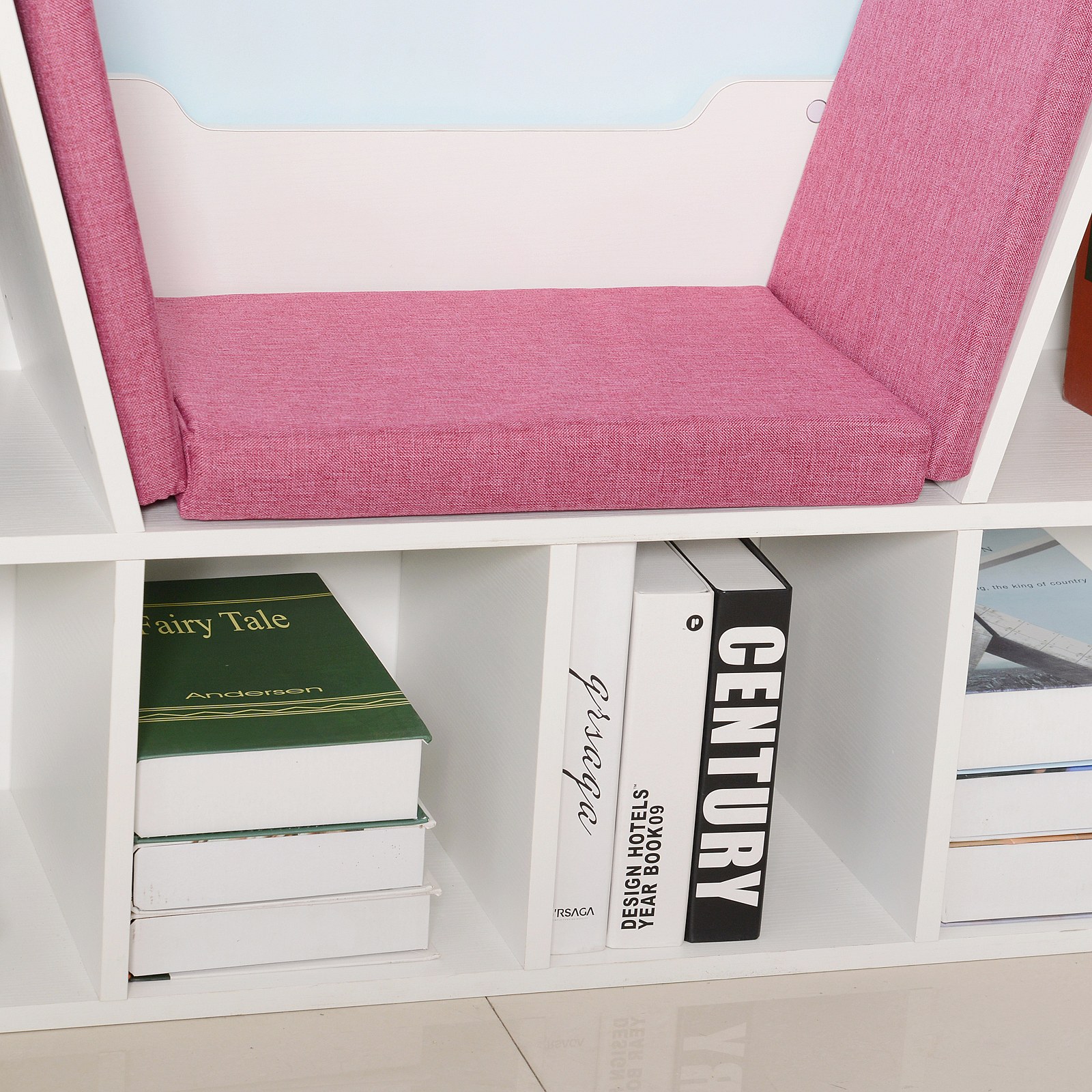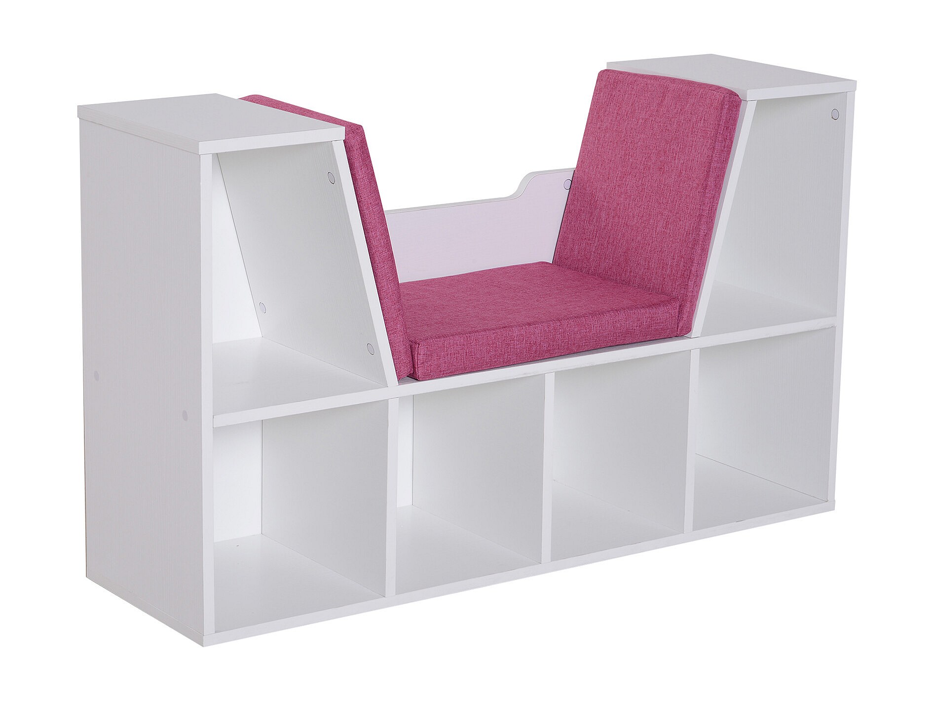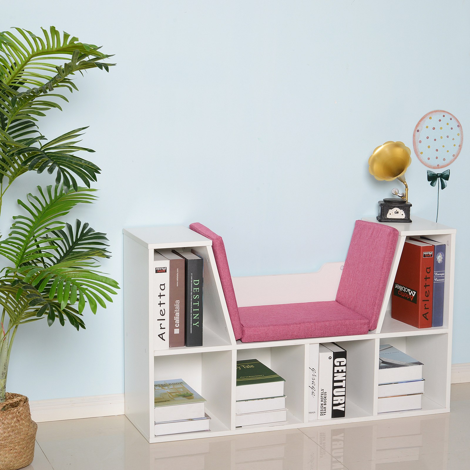 Bibliothèque banc 2 en 1 design contemporain 6 casiers 3 coussins fournis 102L x 30l x 61H cm blanc rose