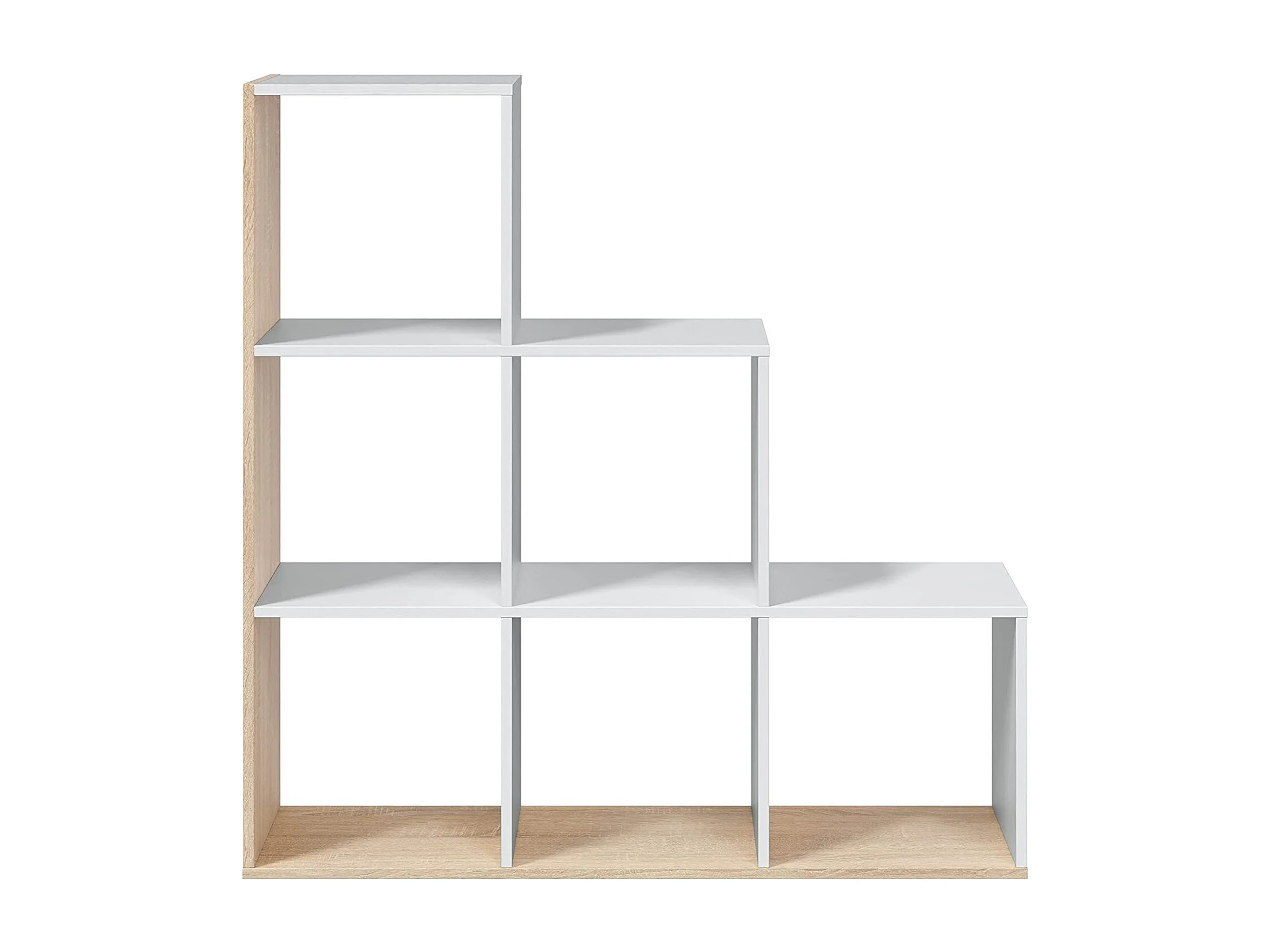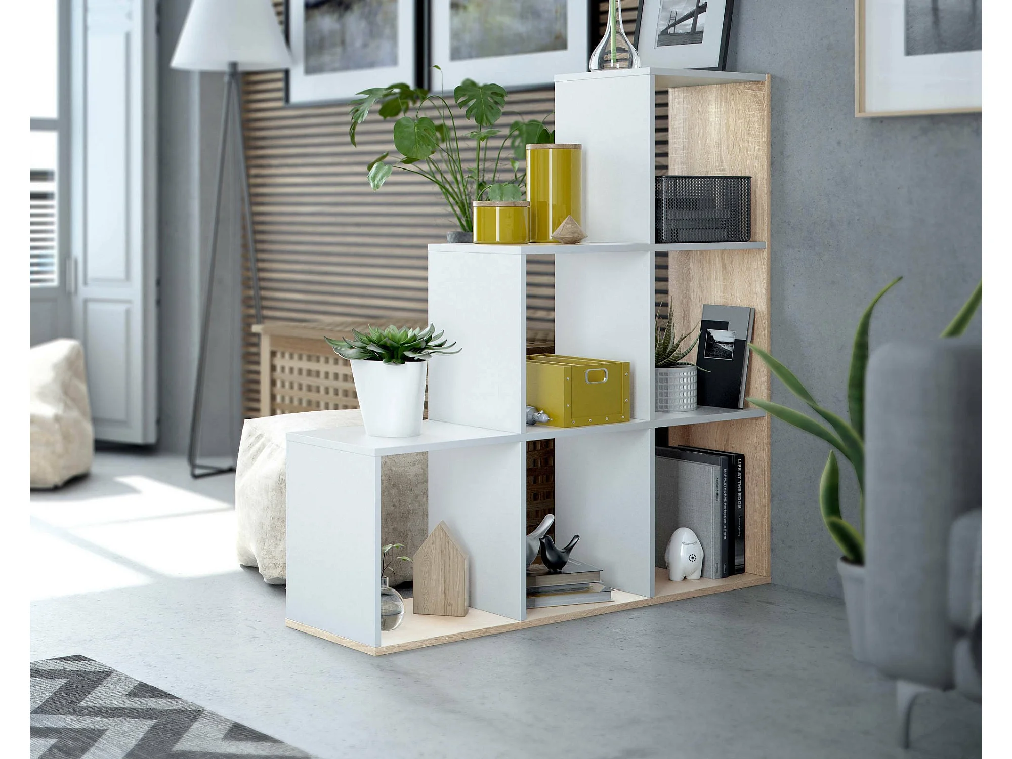 Bibliothèque Dbarth, Bibliothèque double face avec 6 compartiments, Etagère de séparation de bureau, 108x28h110 cm, Blanc et Chêne