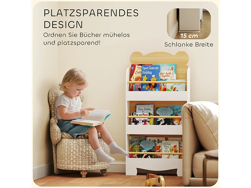 Bibliothèque enfant avec 3 étagères, bois, design ours, pour chambre d'enfant, blanc (55x15x110 cm)