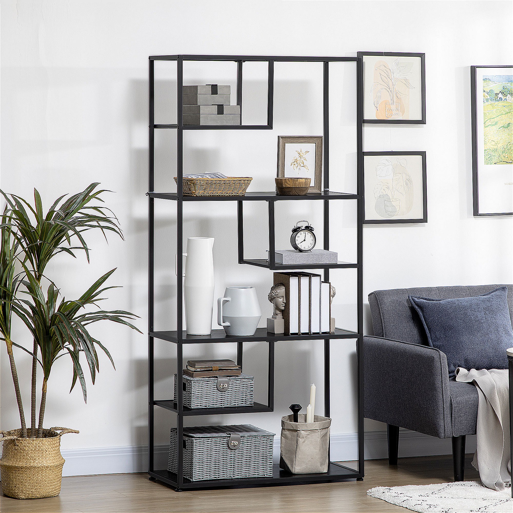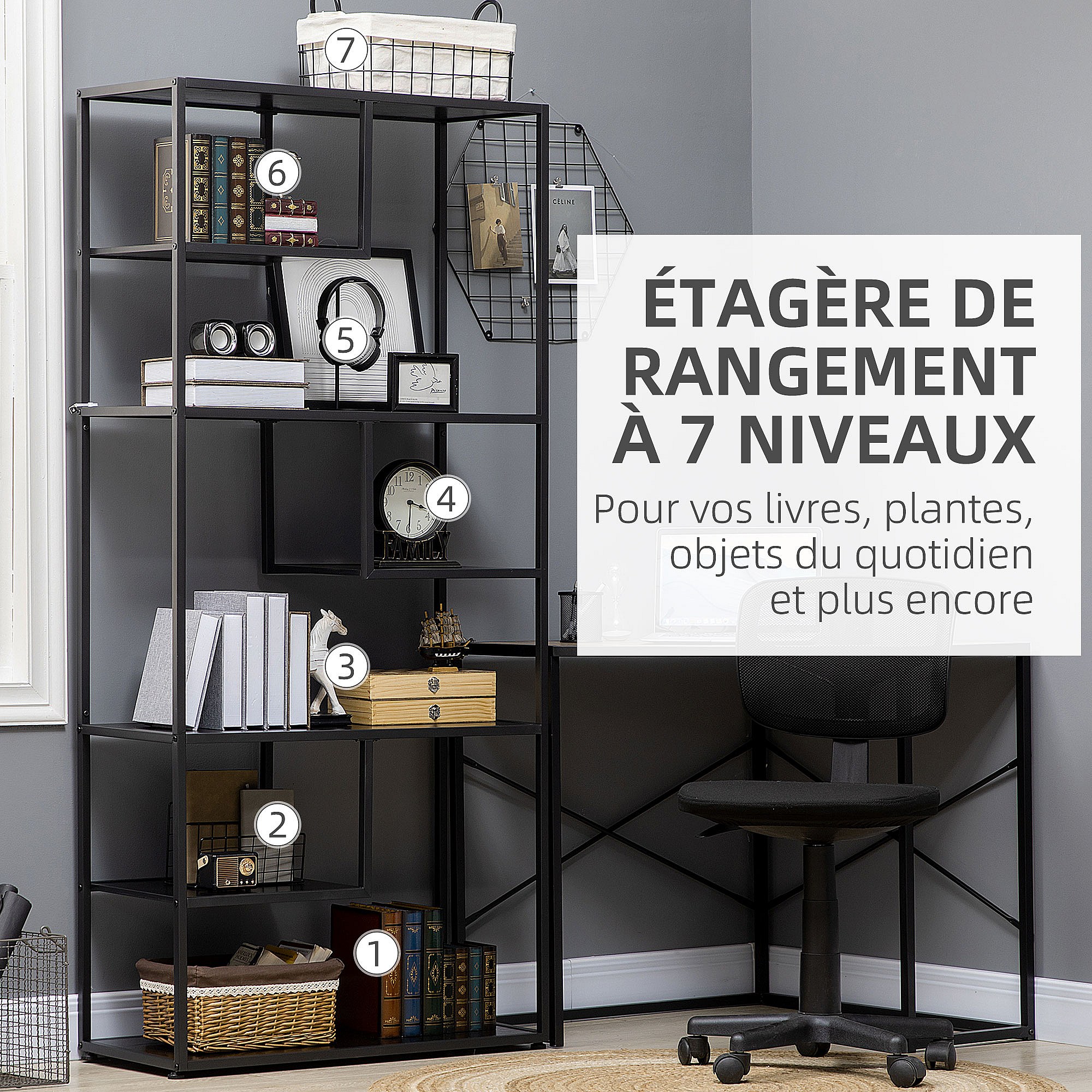 Bibliothèque étagère de rangement à 7 niveaux style industriel acier bois noir