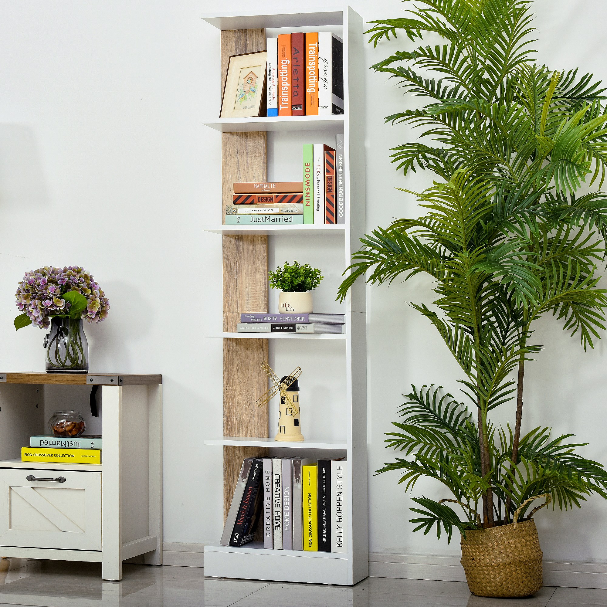 Bibliothèque Étagère de Rangement avec 5 Compartiments Ouverts Design Simple Moderne Idéale pour Salon Chambre Bureau 45 x 21 x 170 cm Blanc et Chêne