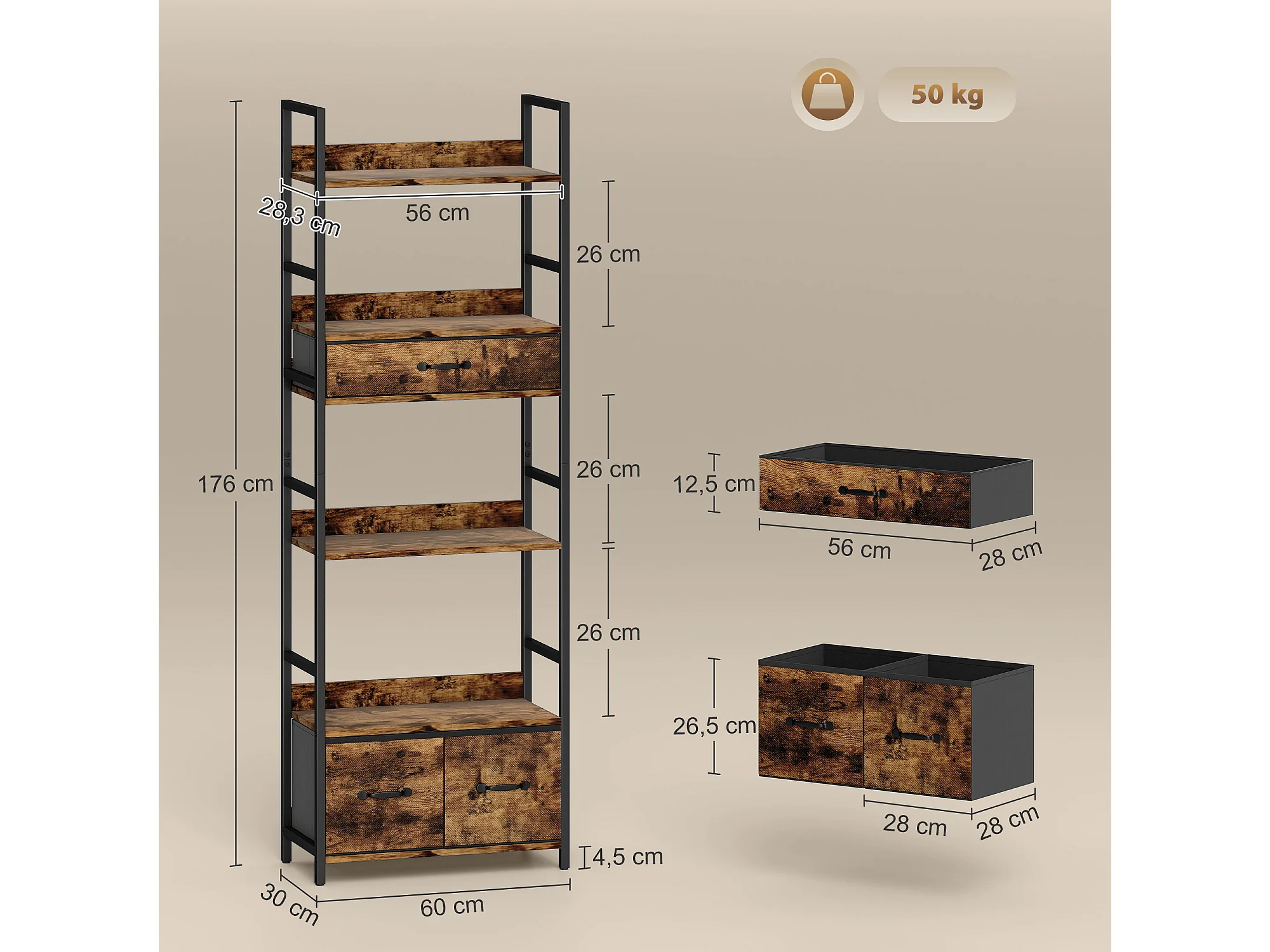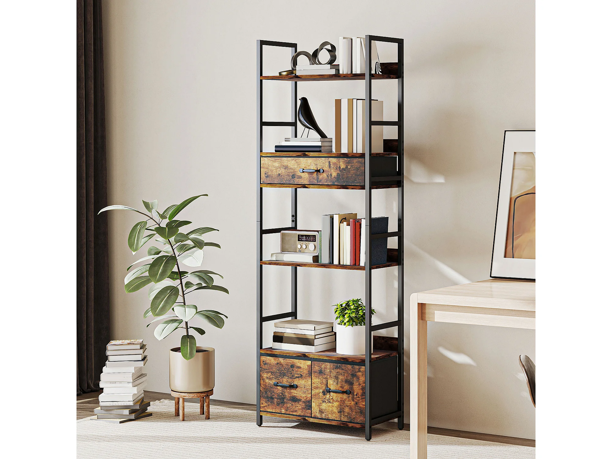 Bibliothèque étagère style industriel - 4 étagères, 3 tiroirs - dim. 60x30x176cm - métal noir effet bois vieilli