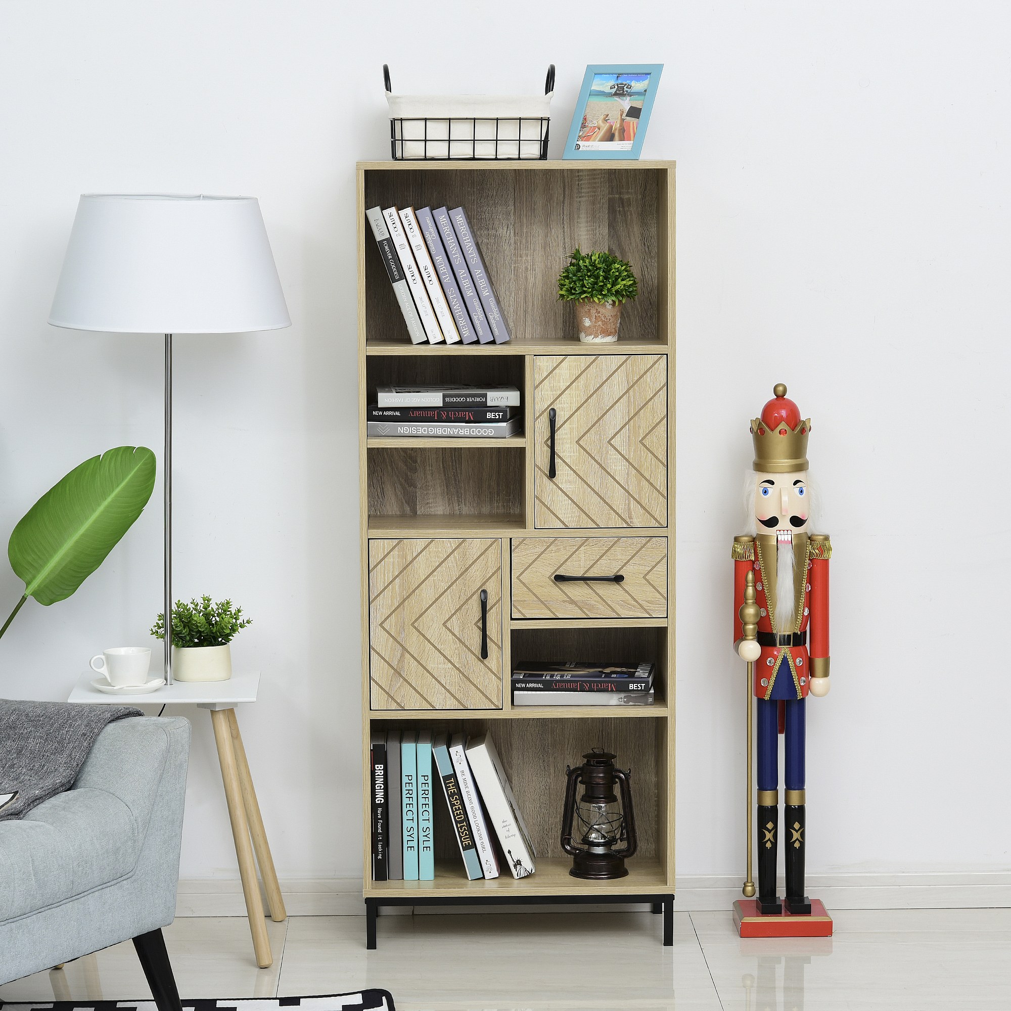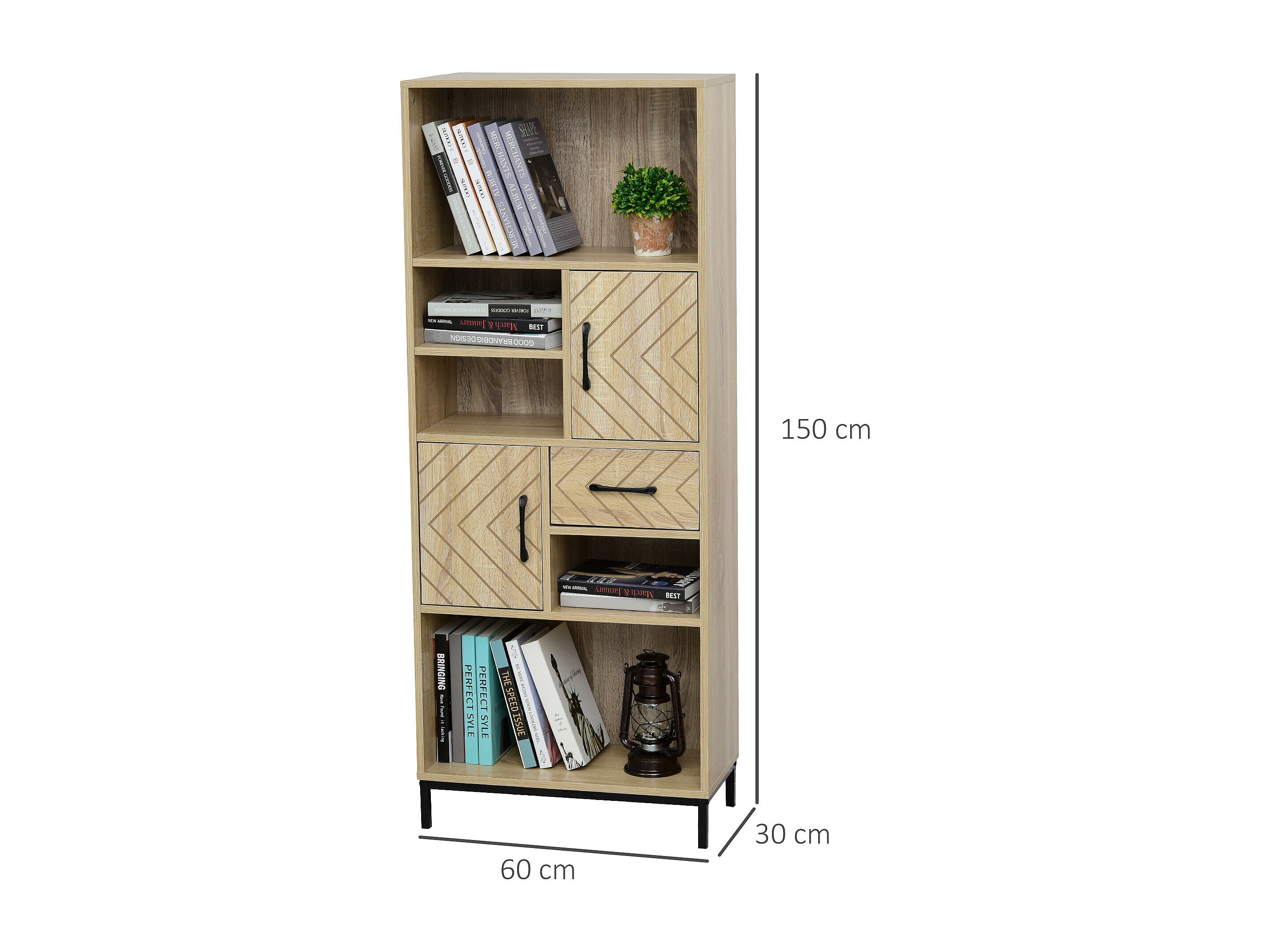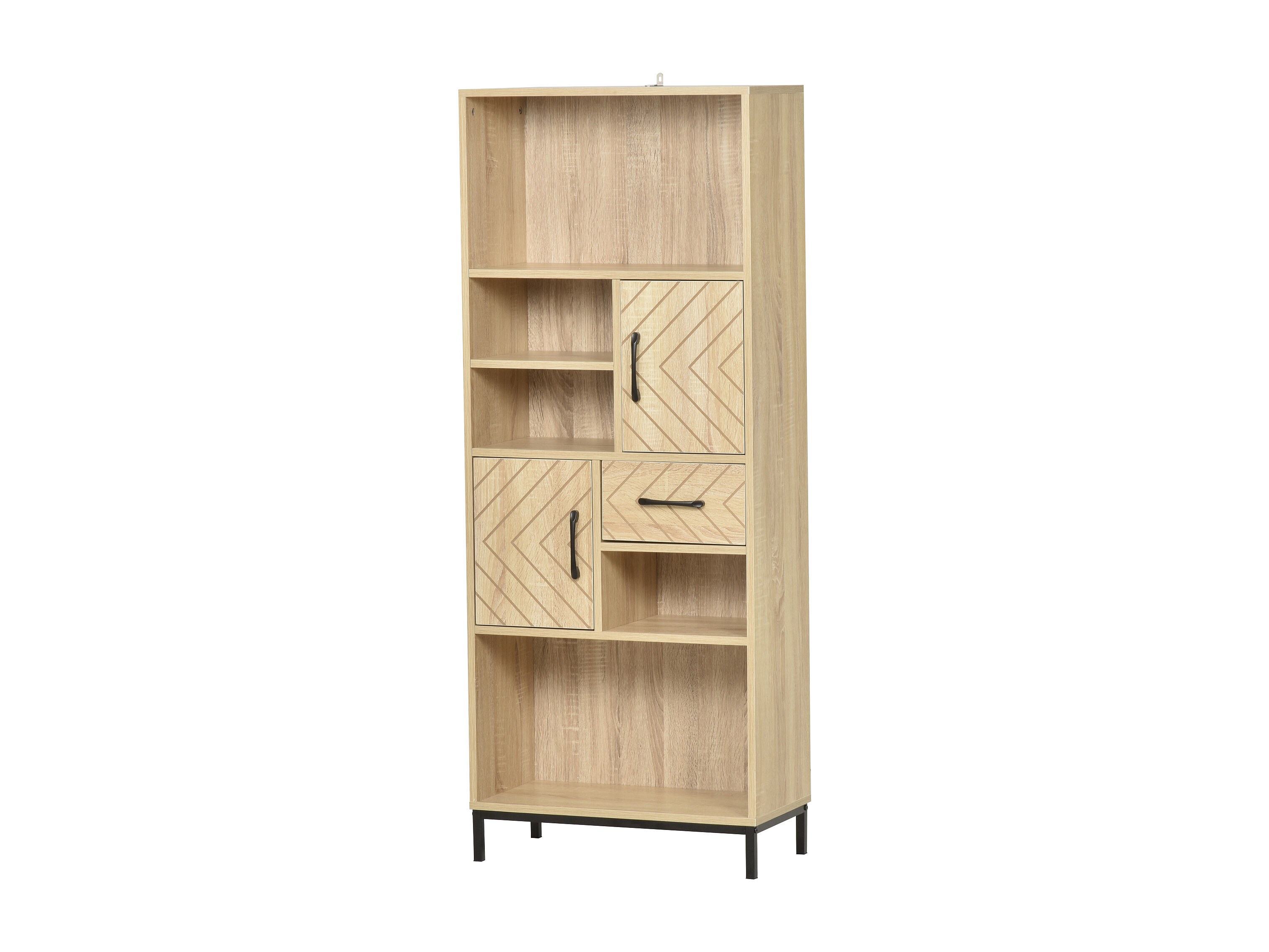 Biblliothèque 2 étagères 3 niches 2 placards + tiroir panneaux particules MDF chêne clair motif graphique métal noir