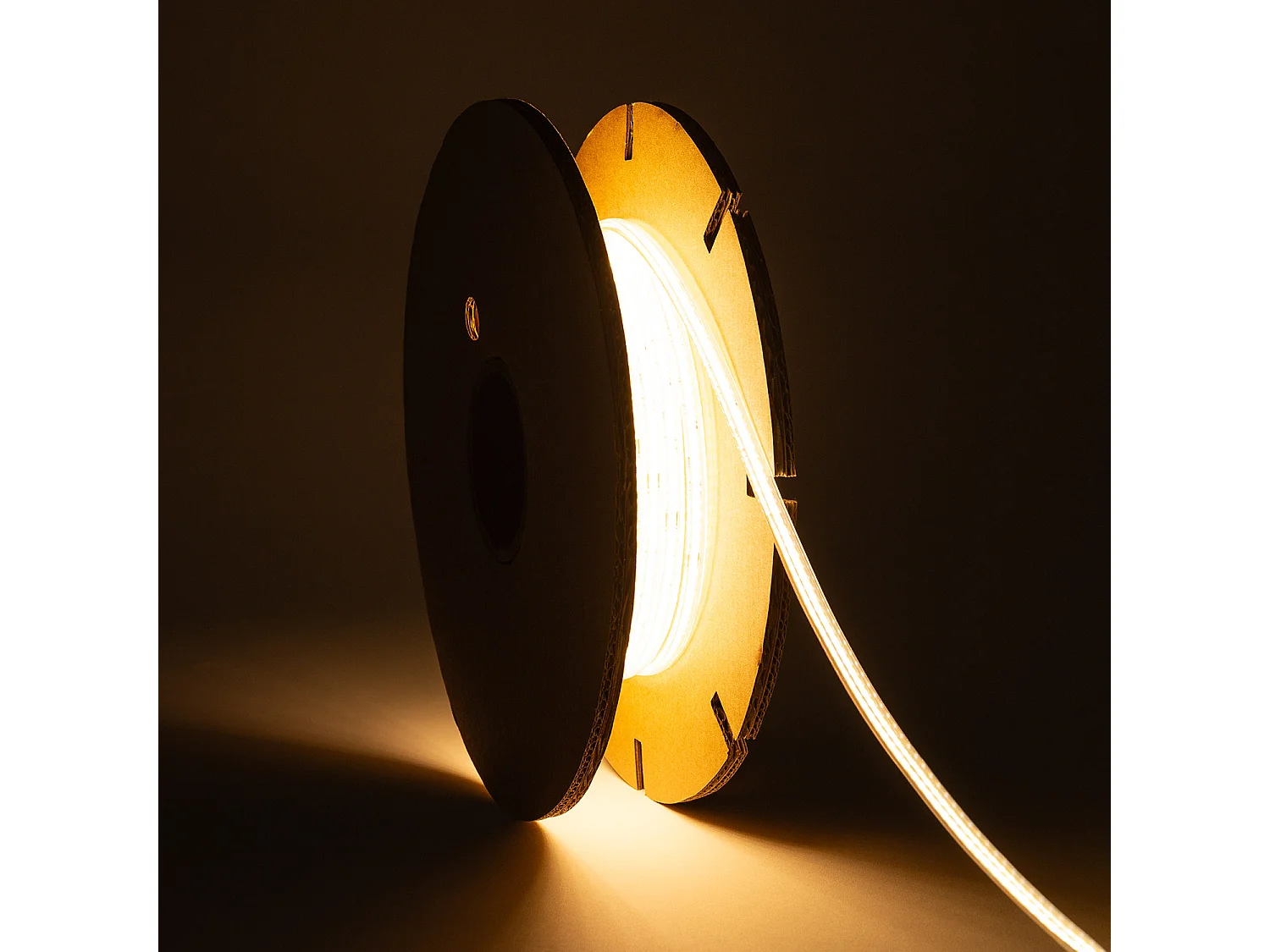 Ruban LED Dimmable 220V COB Auto-redressement 480 LED/m BOBINE 20m 12W/m 900lm/m Super Étroite Largeur 6.5mm Coupe 10cm IP65 2700K Blanc chaud