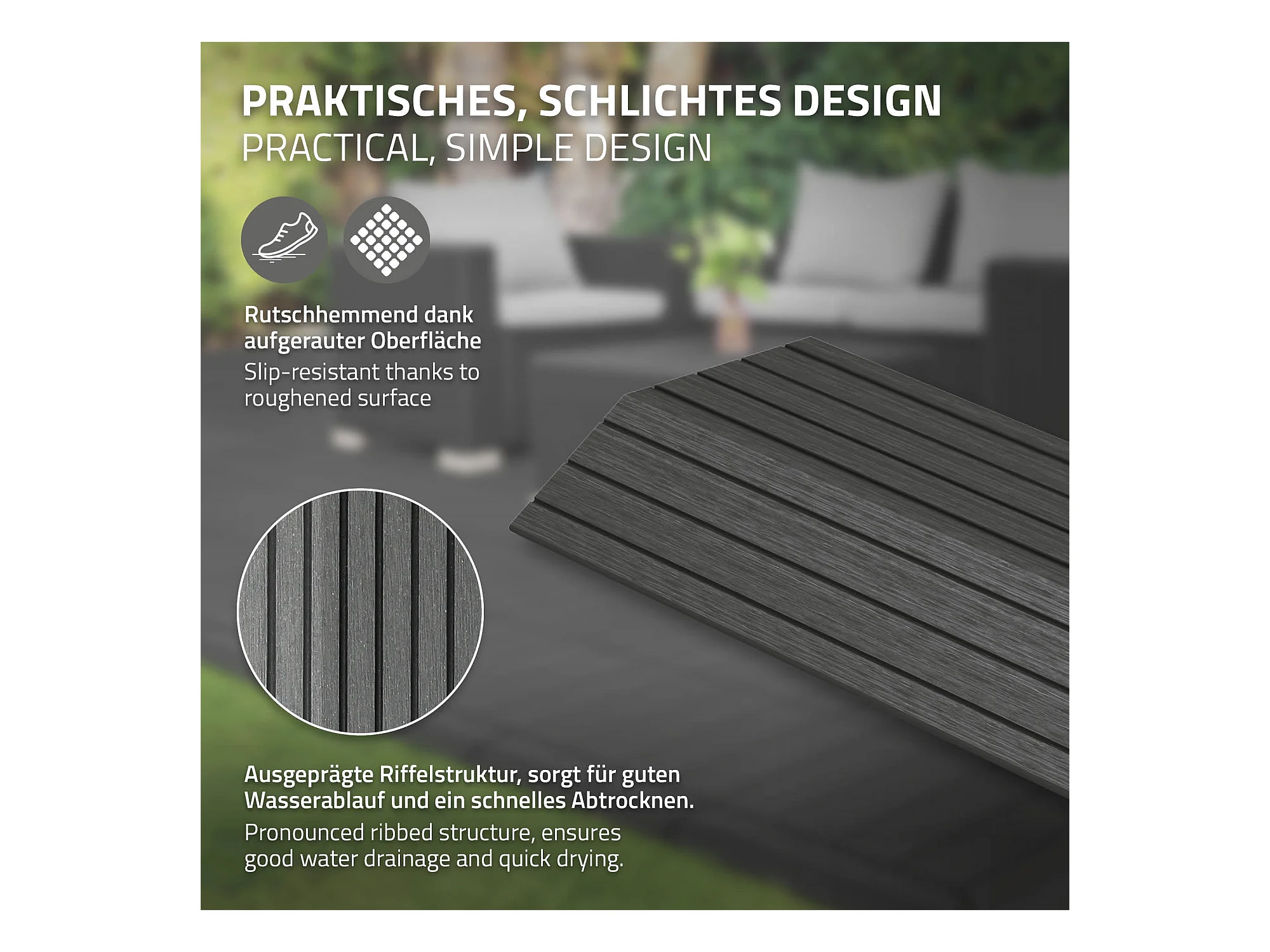 Bordure de finition angle droit 38x2x7,5cm anthracite Plinthe d'angle striée aspect de bois drainage et structure de support système d'encliquetage