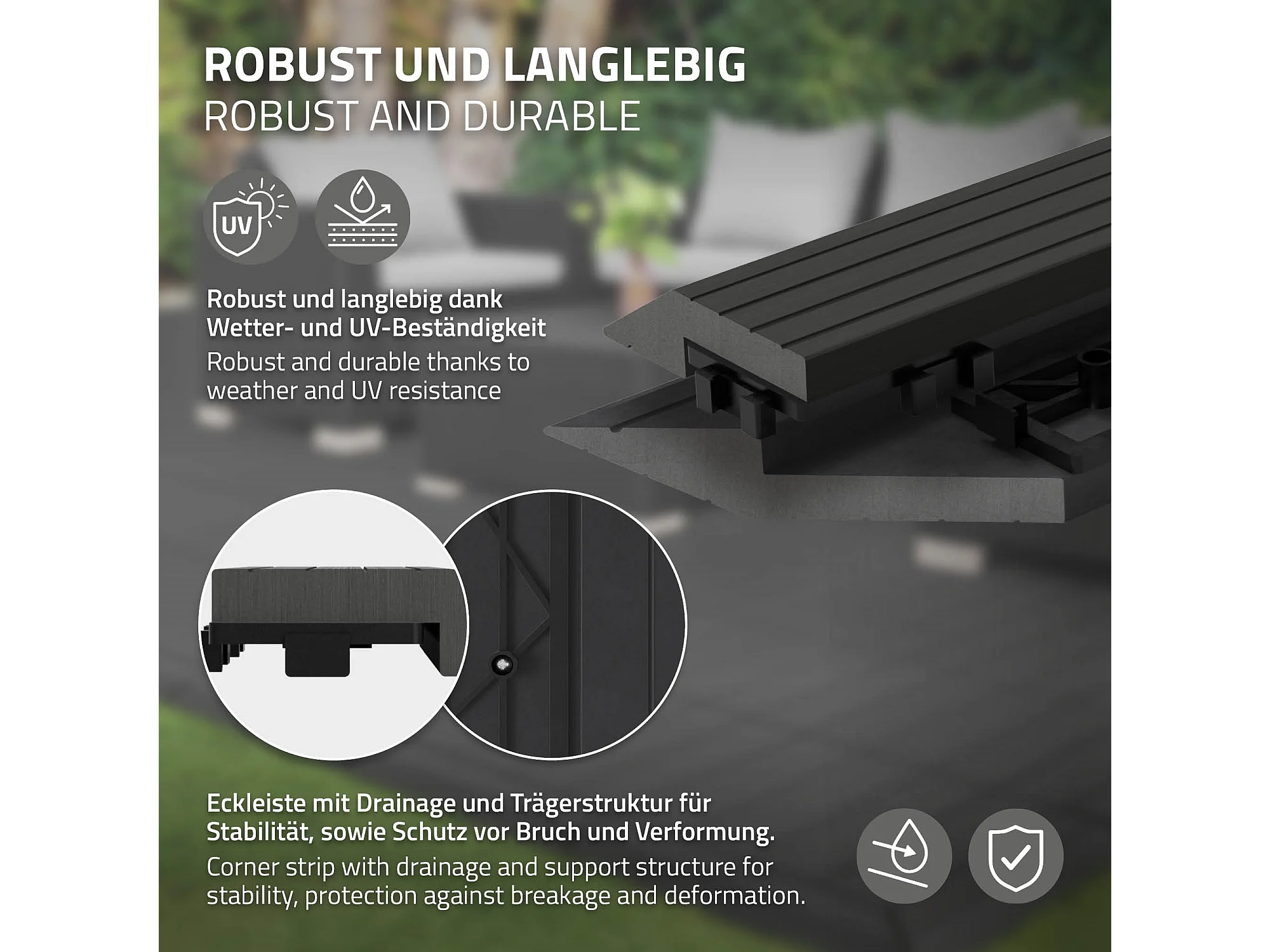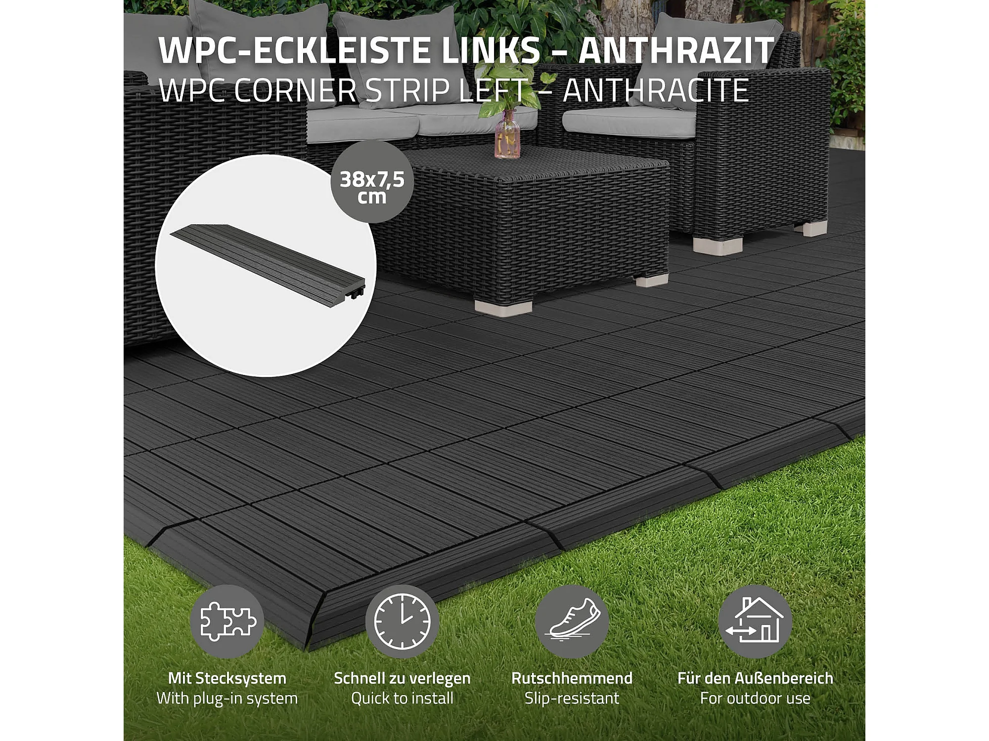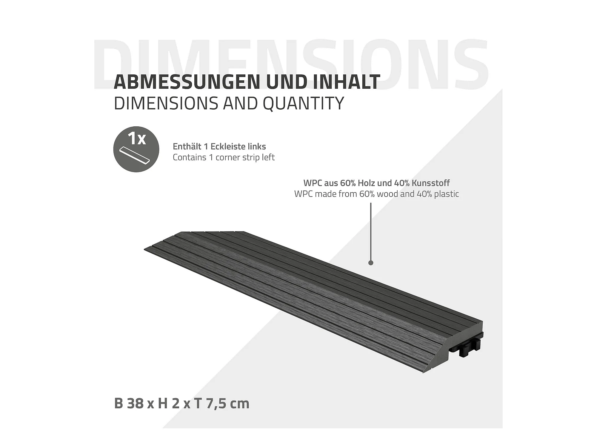 Bordure de finition coin gauche 38x2x7,5cm anthracite Plinthe d'angle striée aspect de bois drainage et structure de support système d'encliquetage