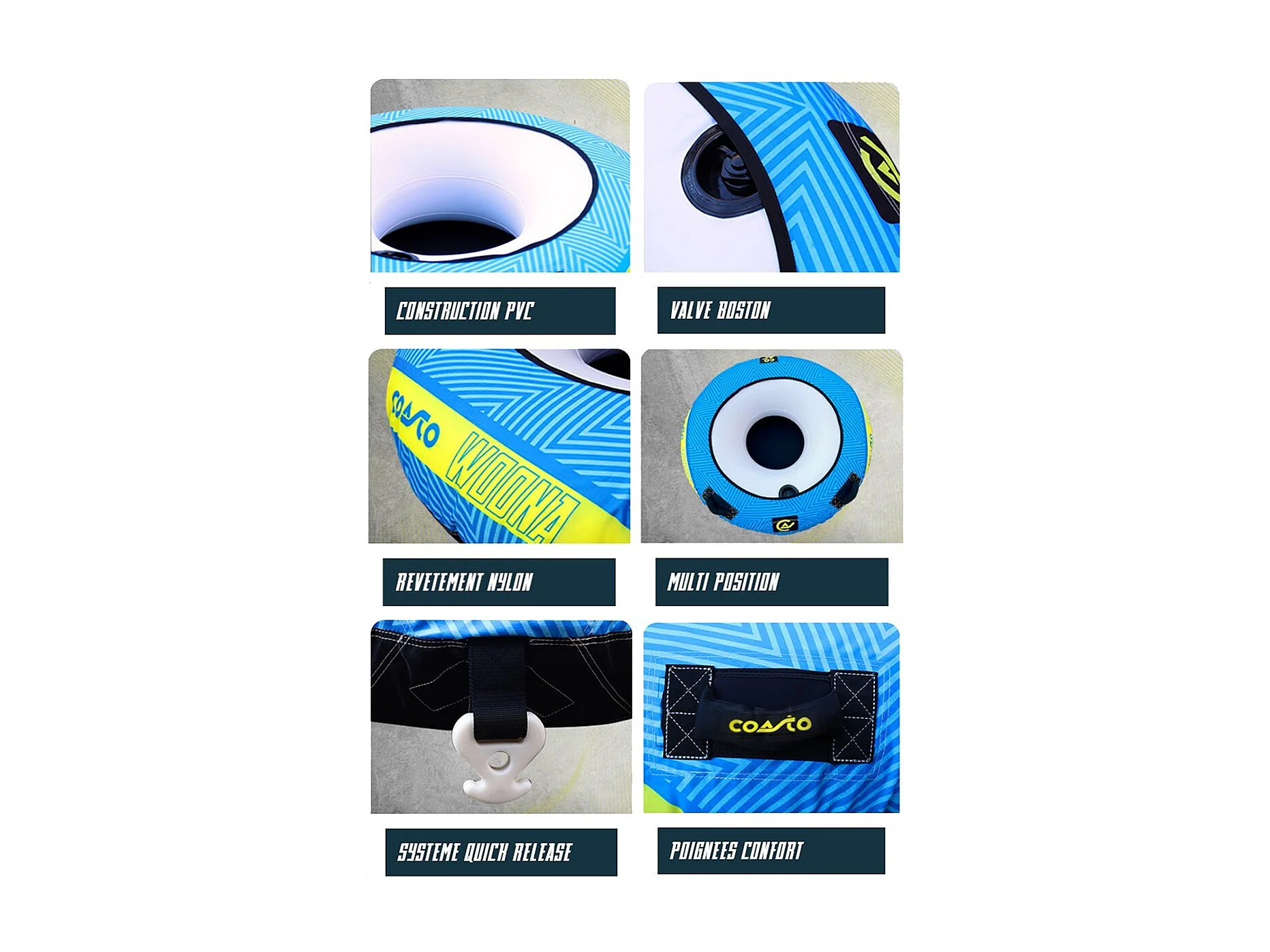 Bouée tractée Coasto Woona - 137 cm - Charge max.70 kg - 2 poignées Néoprène - Nylon 420 D - Construction PVC 26G - 1 Place