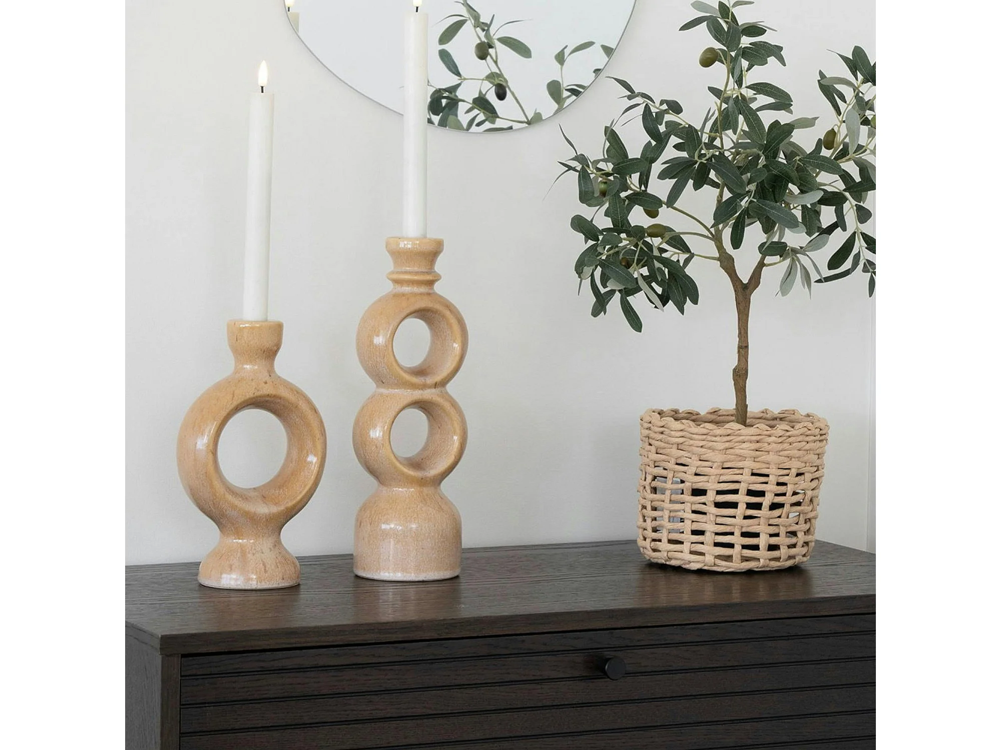Bougeoir déco en céramique - 2 anneaux, finition beige brun