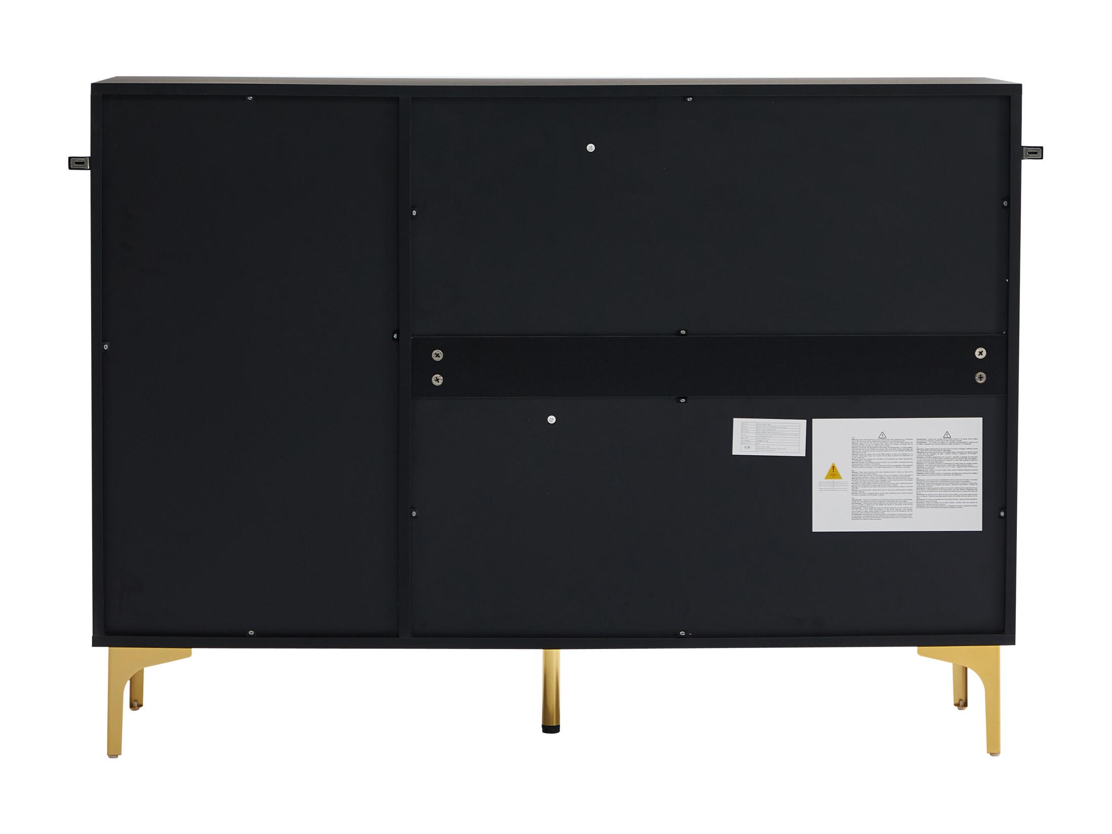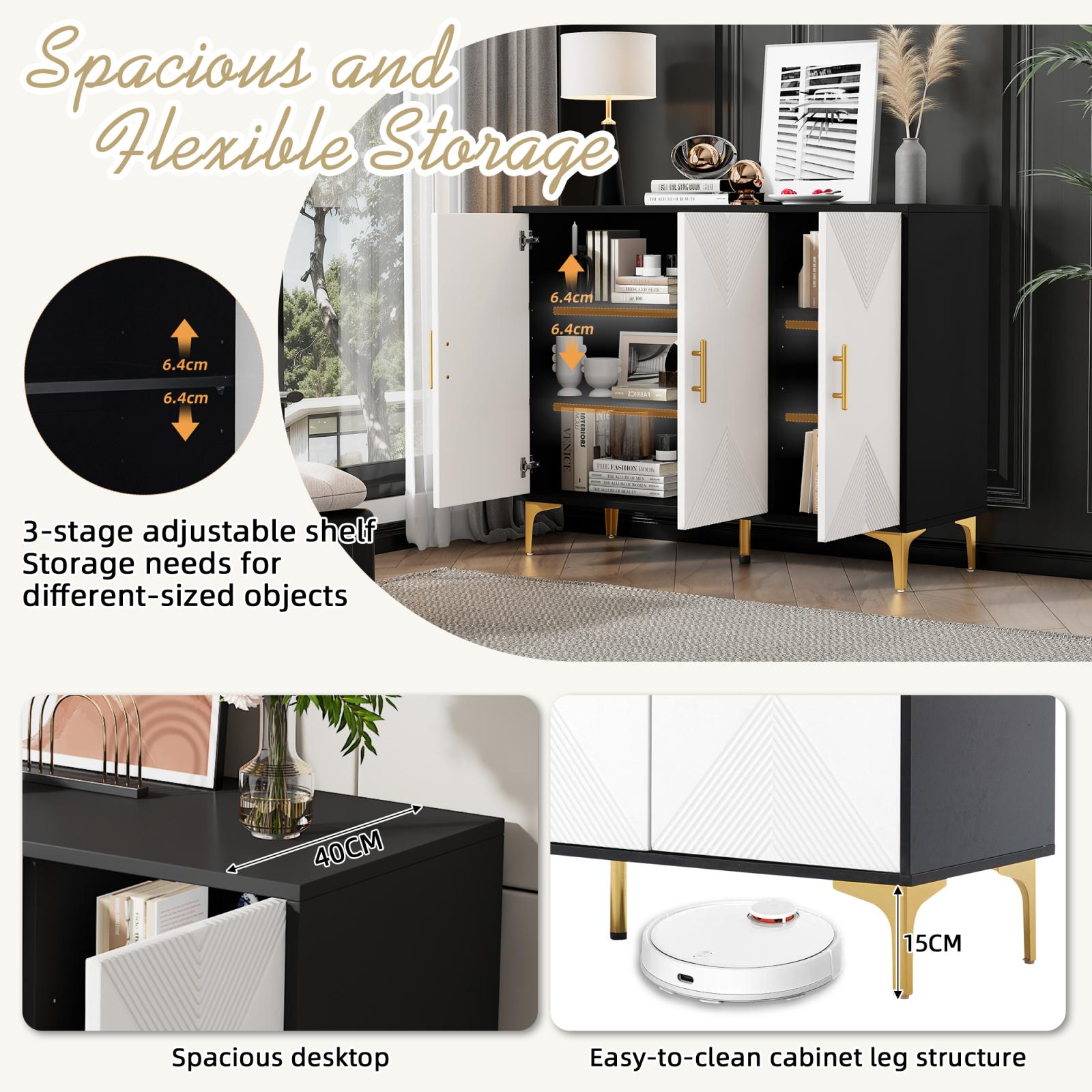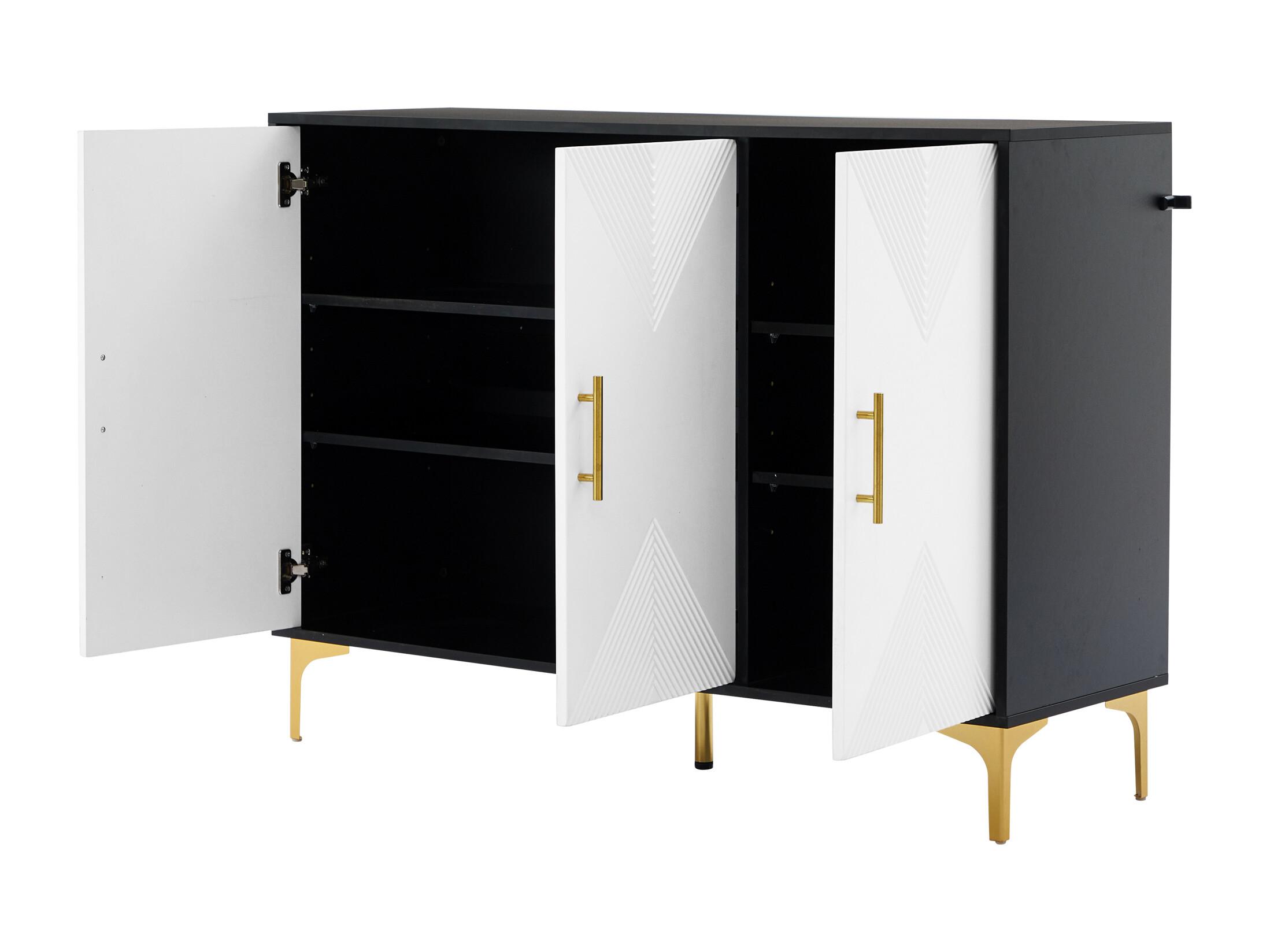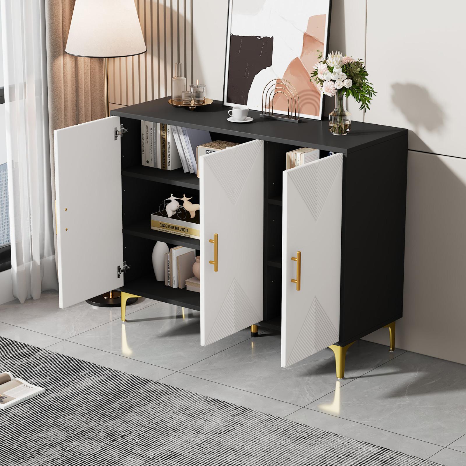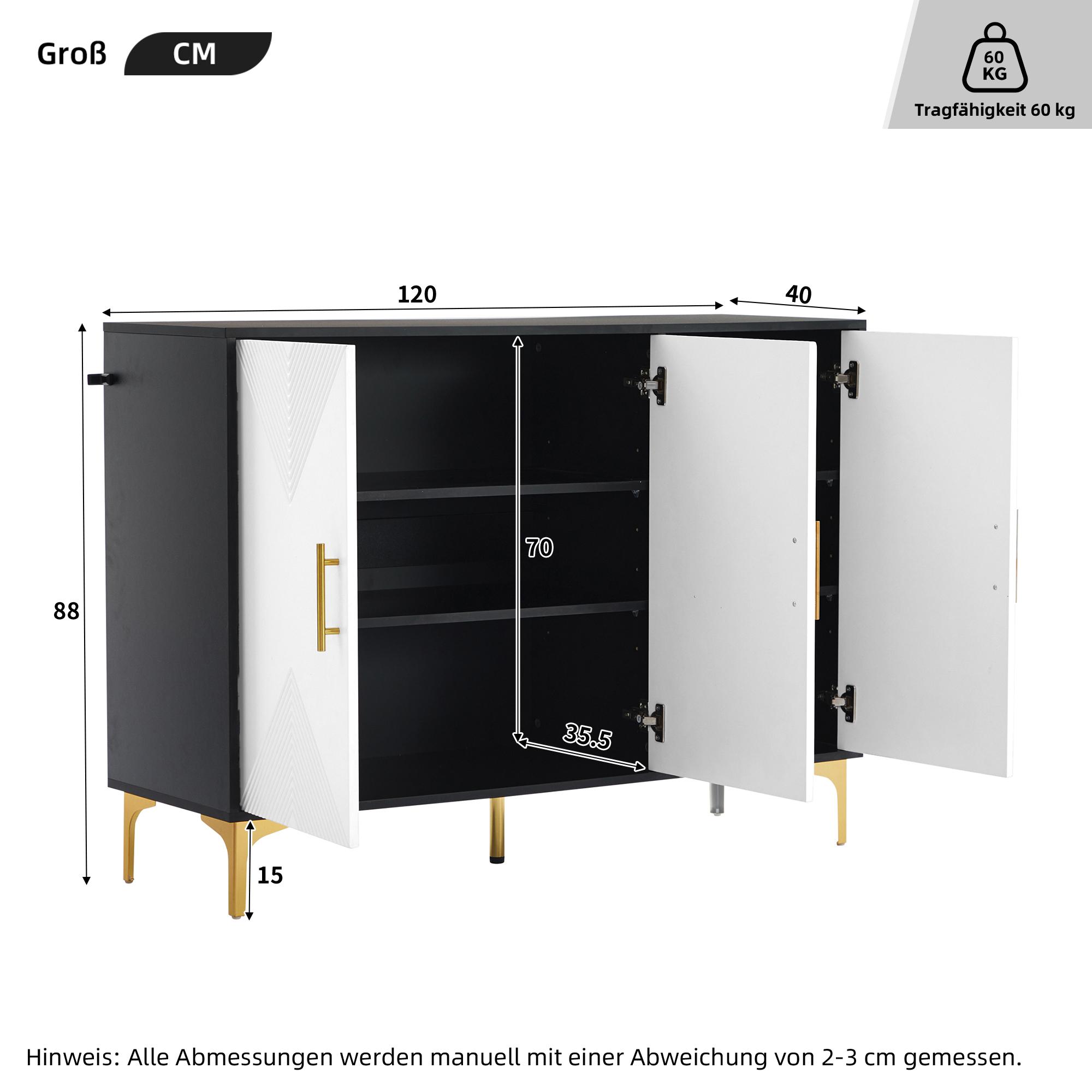 Buffet 120 x 40 x 88 cm, blanc et noir, avec poignées, portes à rayures, pour salon, salle à manger