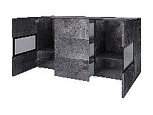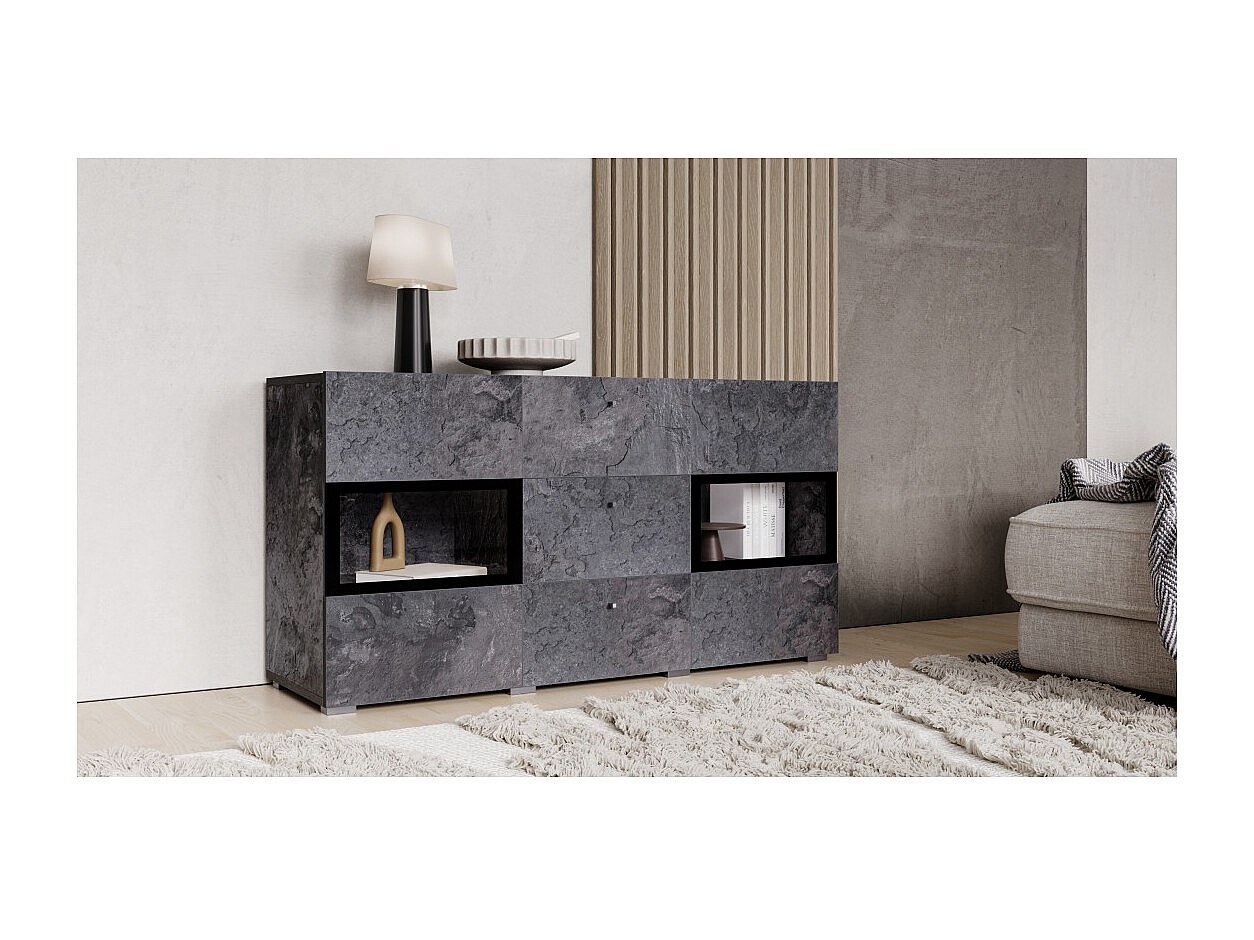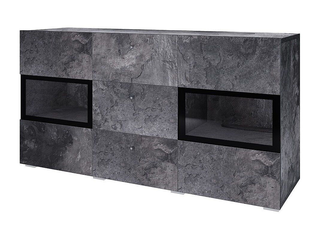 Buffet 130 cm RAMOS – Gris effet ardoise et noir – 2 portes vitrées + 3 tiroirs – Sans LED