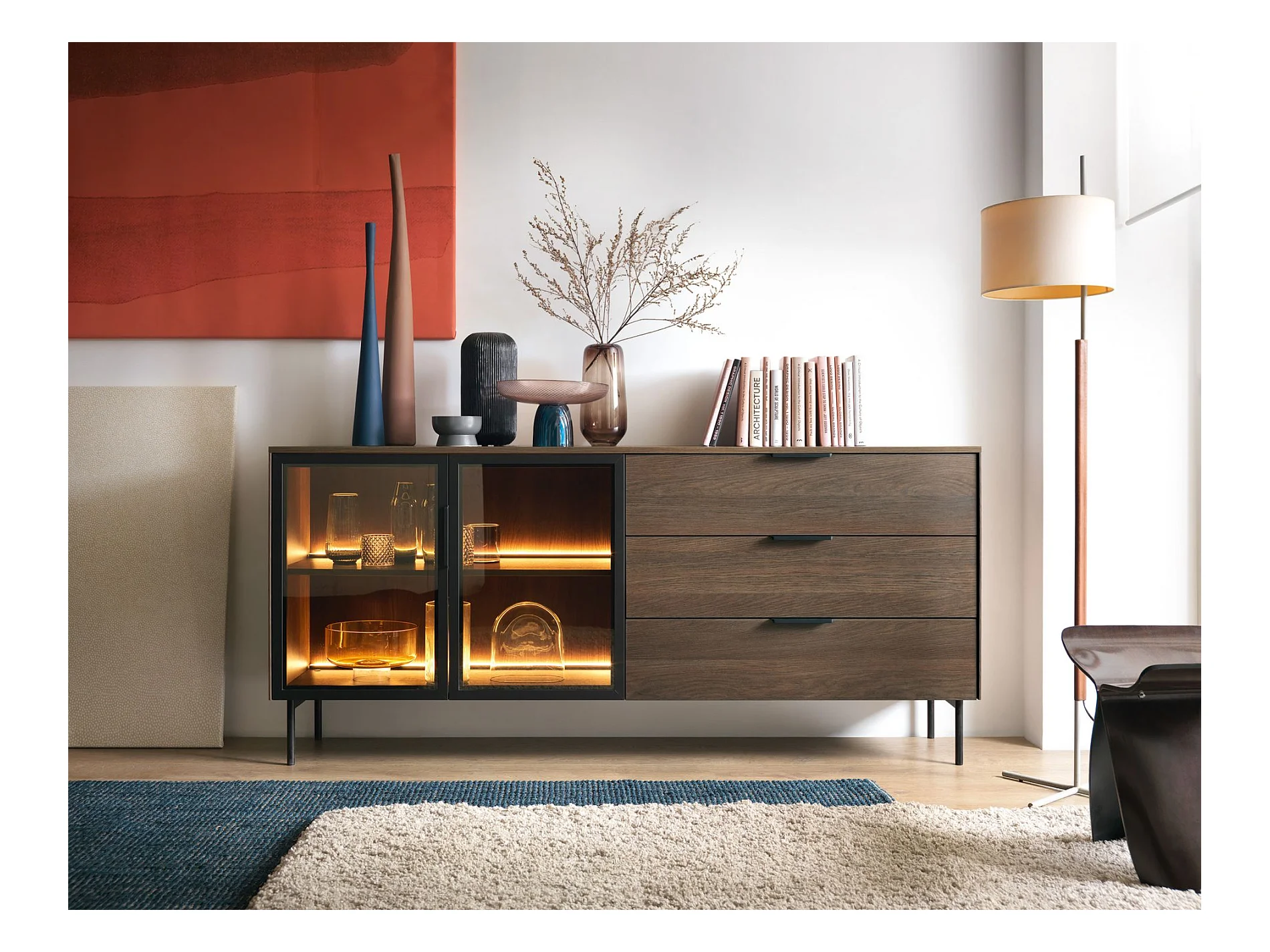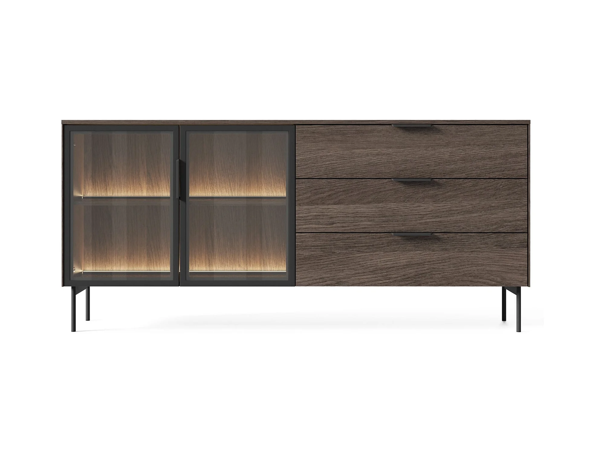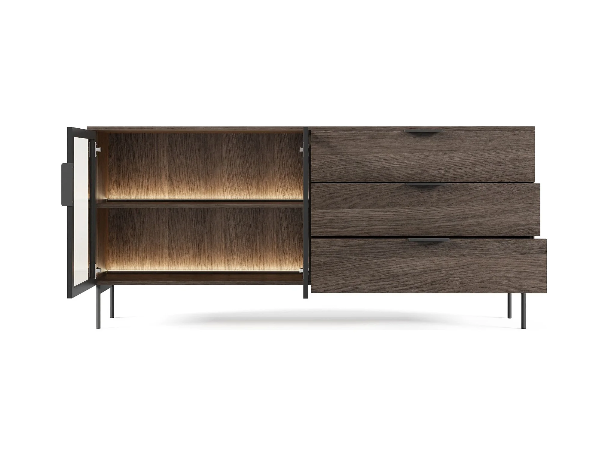 Buffet 2 portes vitrées, 3 tiroirs avec LED – 181 cm – chêne Dunin – SELSEY LUMI