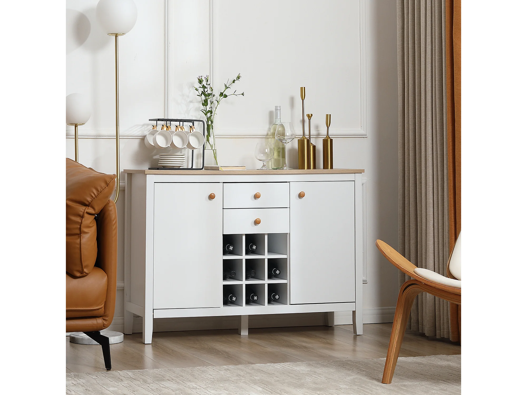 Buffet 2 tiroirs 2 portes étagères réglables range-bouteilles 9 bouteilles blanc effet bois