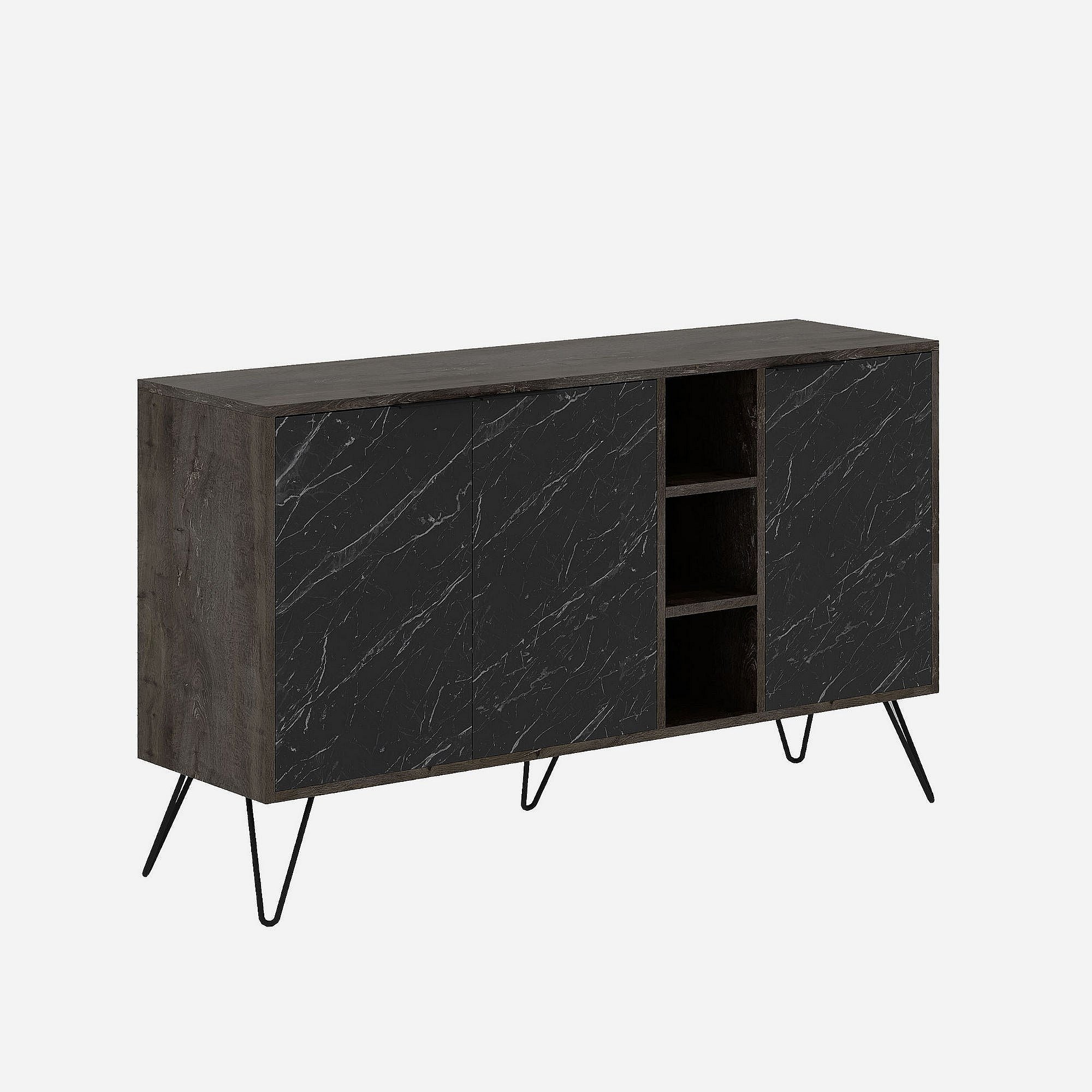 Buffet 3 portes pieds épingle Ginda L142cm Effet Marbre Noir et Bois foncé