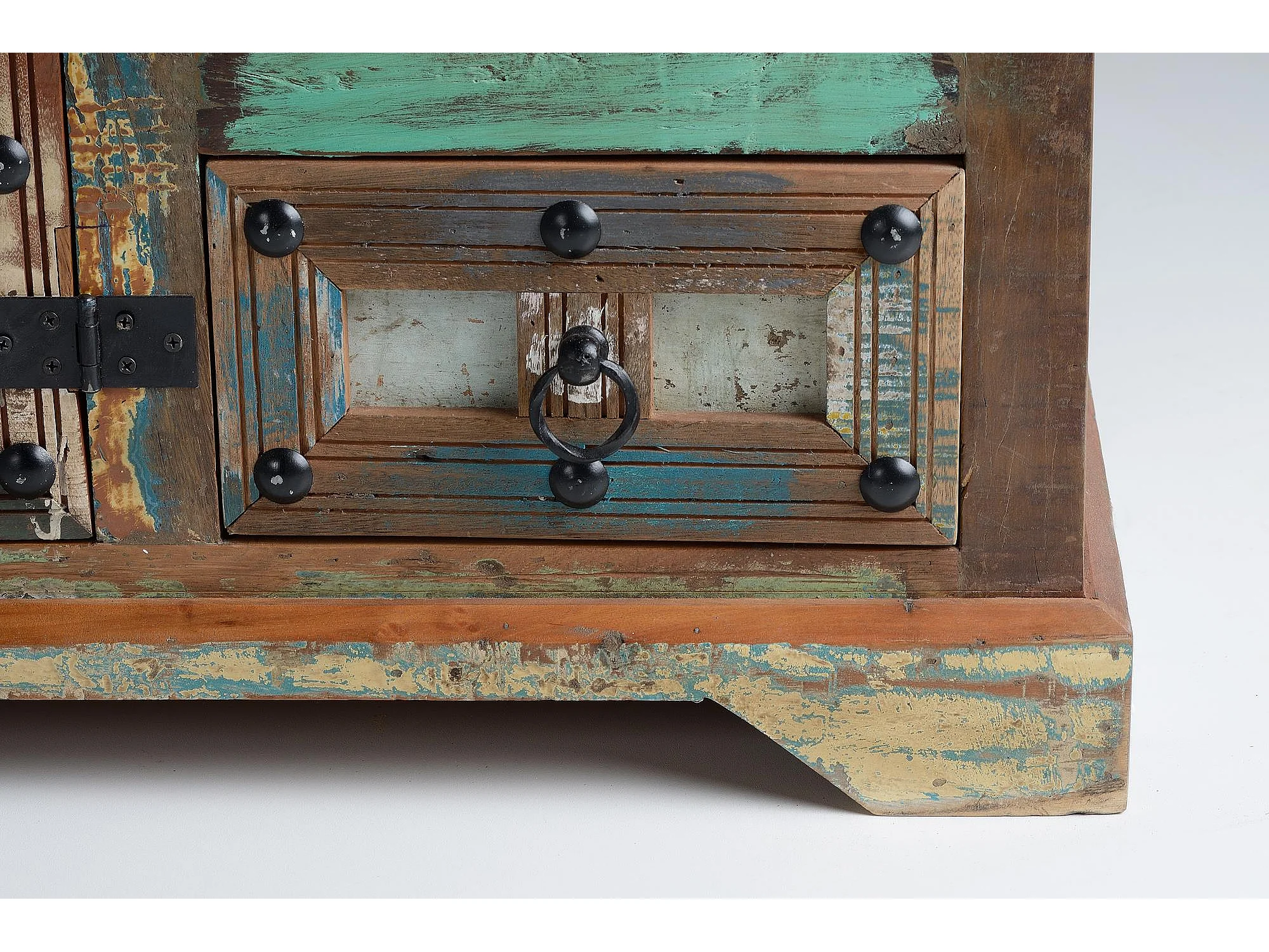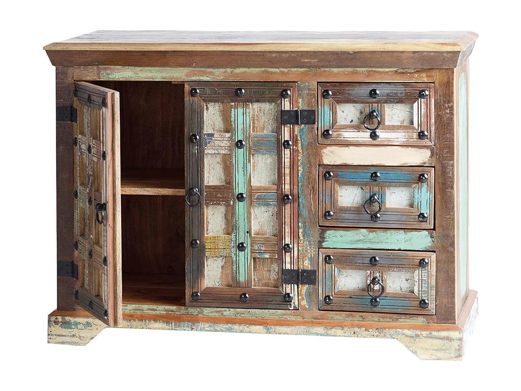 Buffet en bois recyclé et détails métalliques multicolores