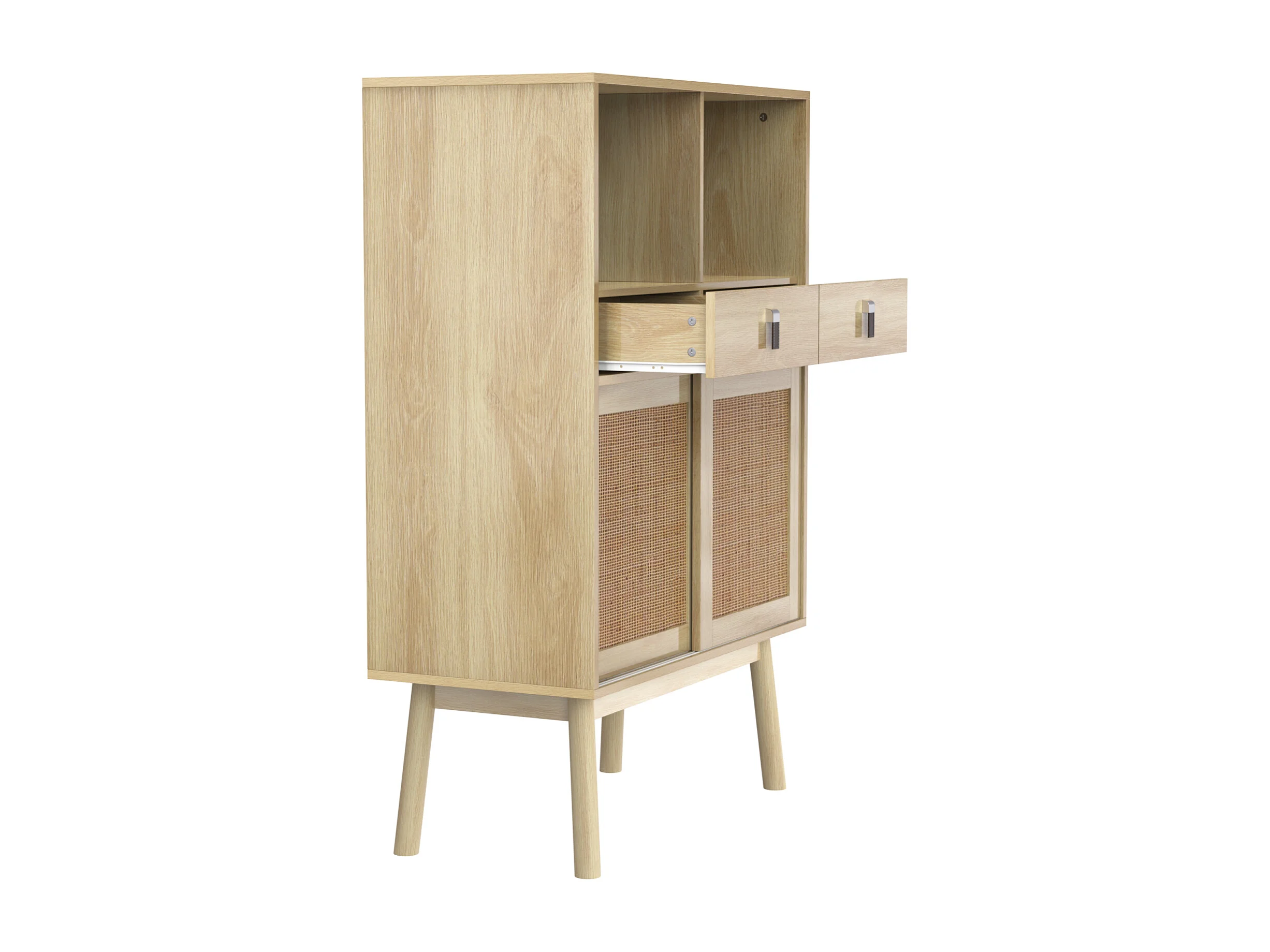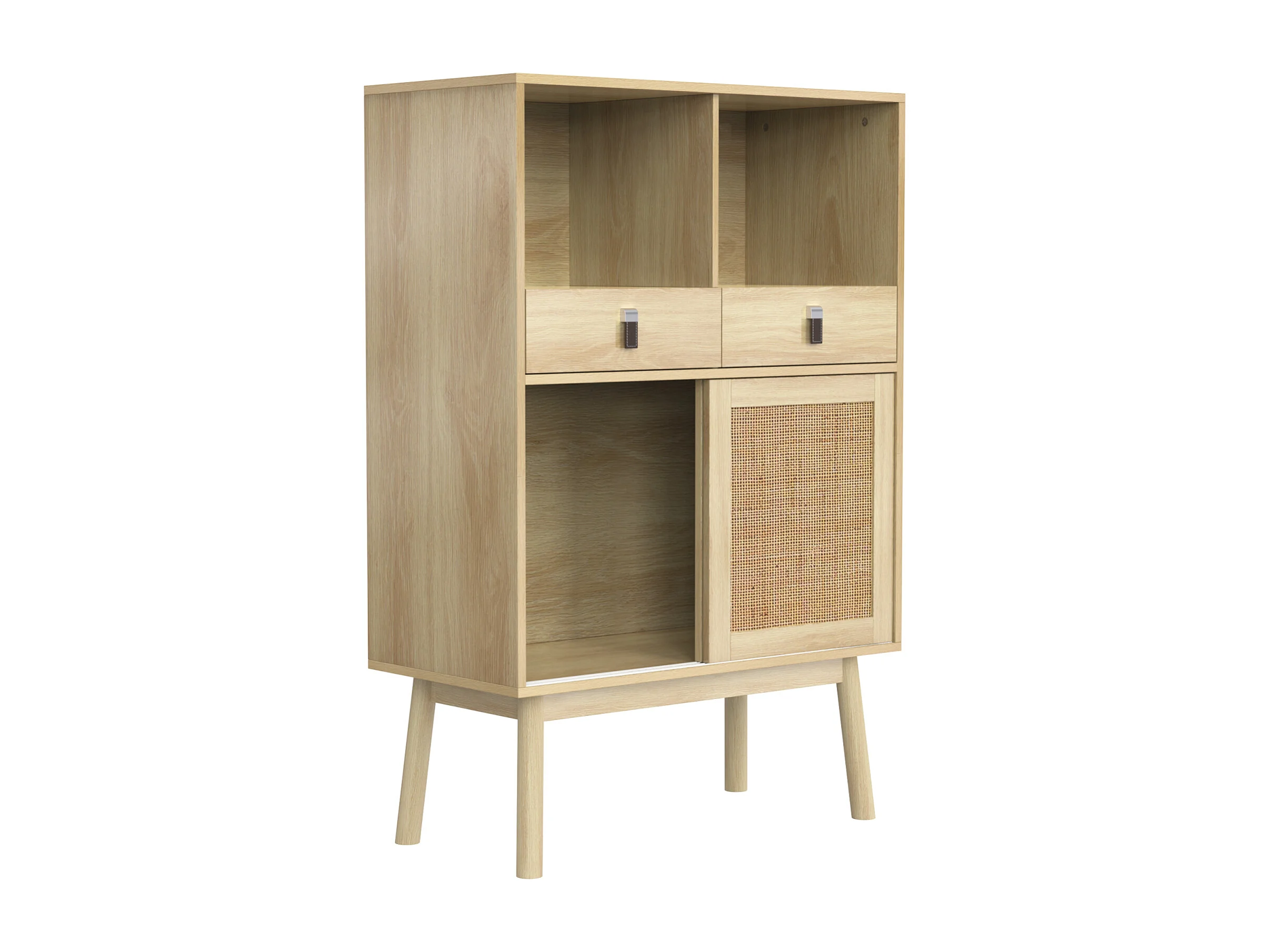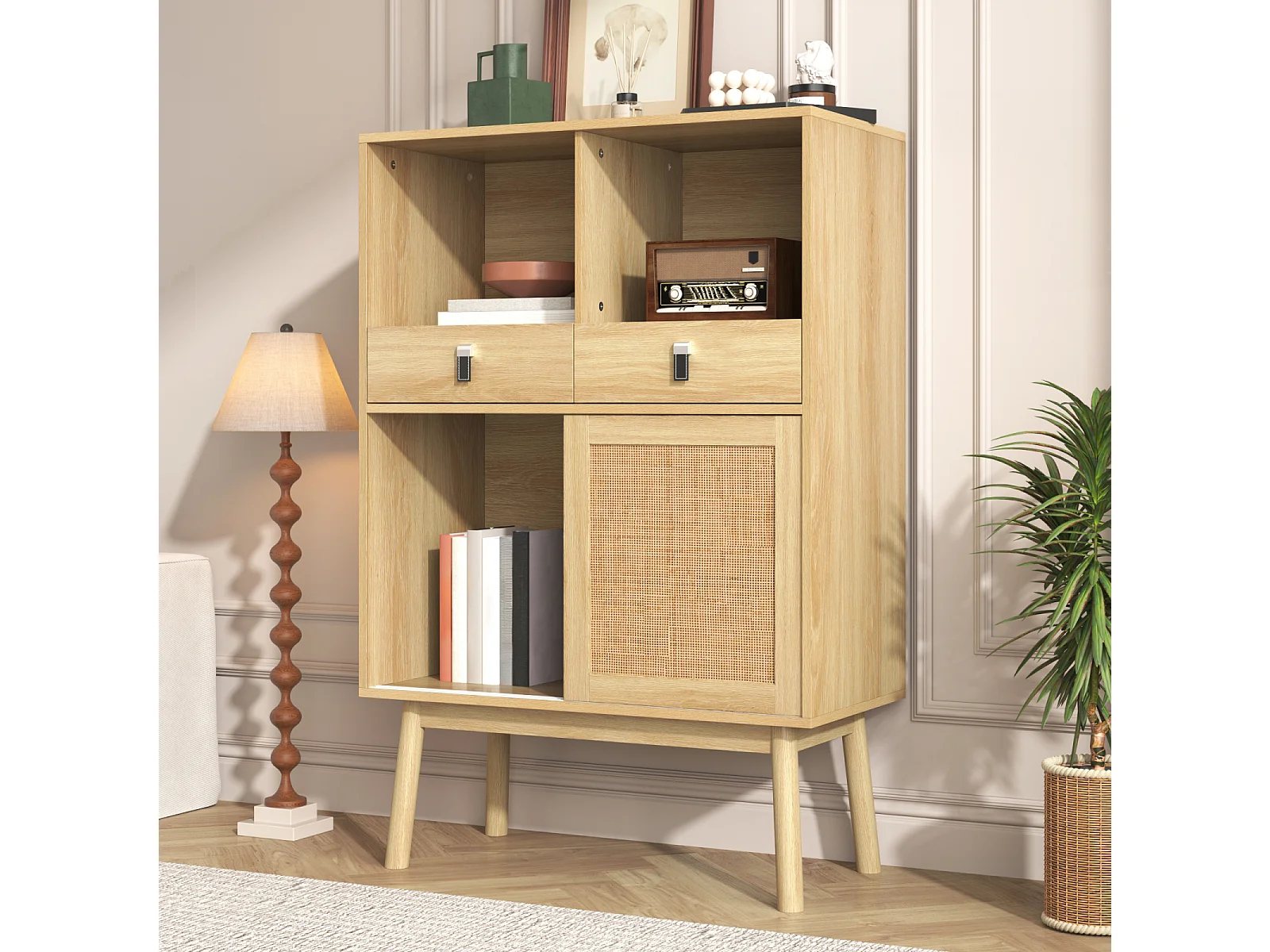 Buffet 80x39,5x120 cm, véritable tressage en rotin, deux tiroirs, deux portes et deux compartiments ouverts, pieds de table de 28 cm de hauteur