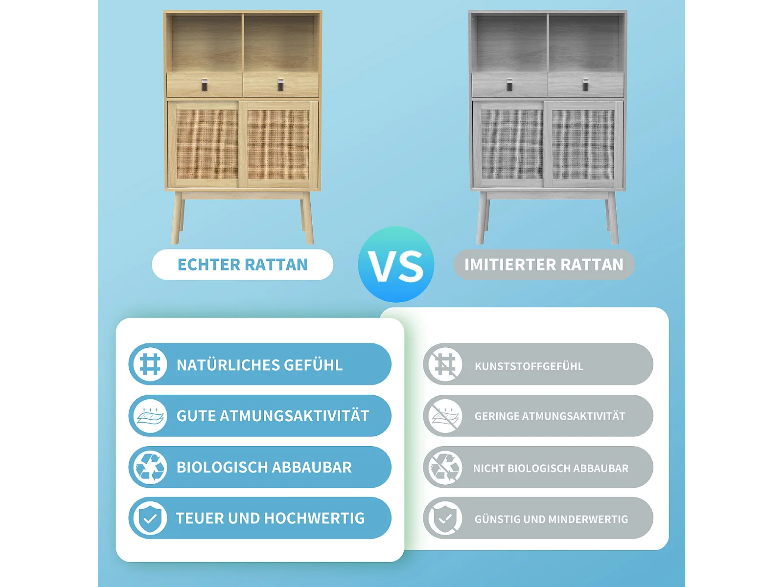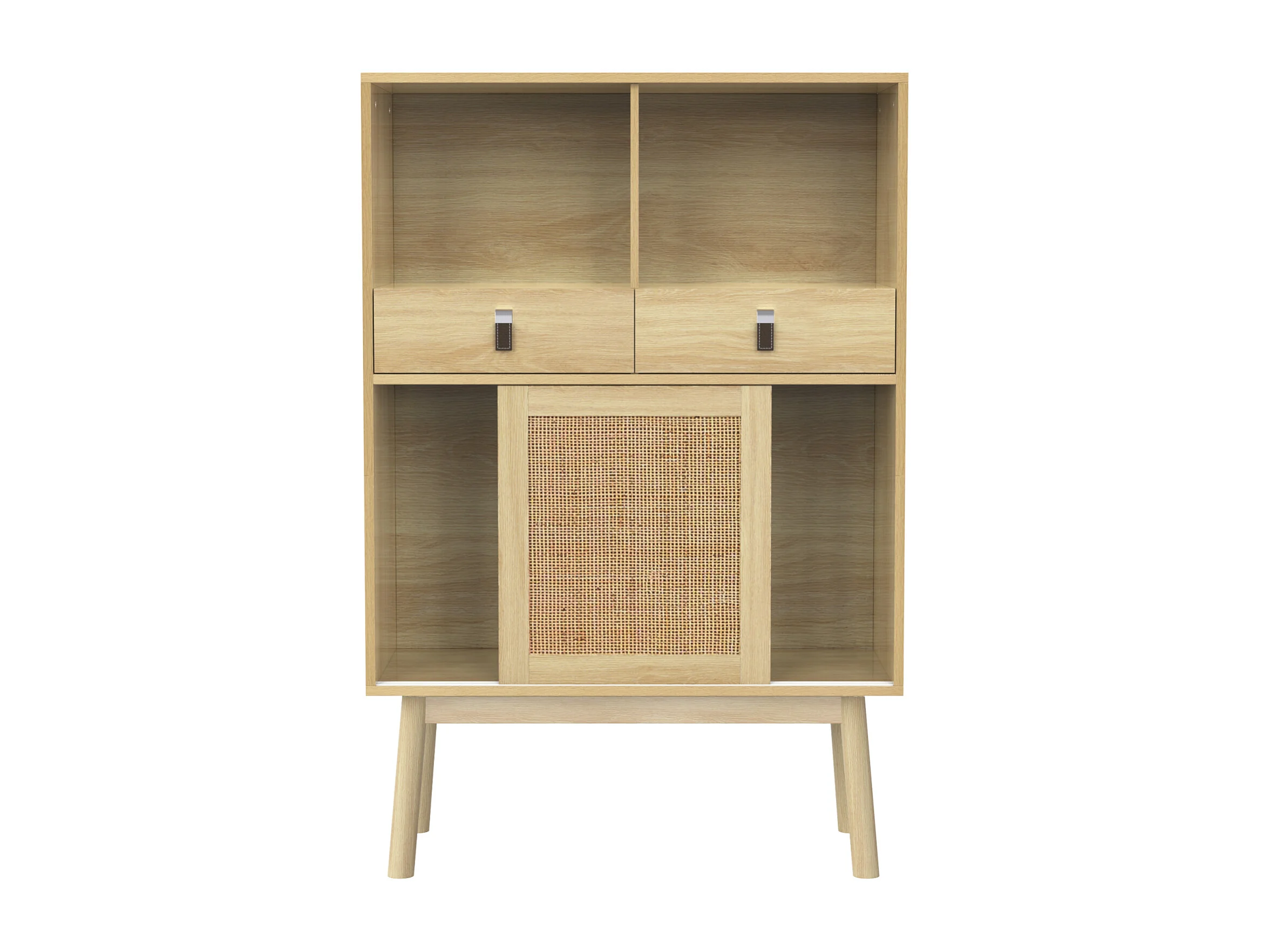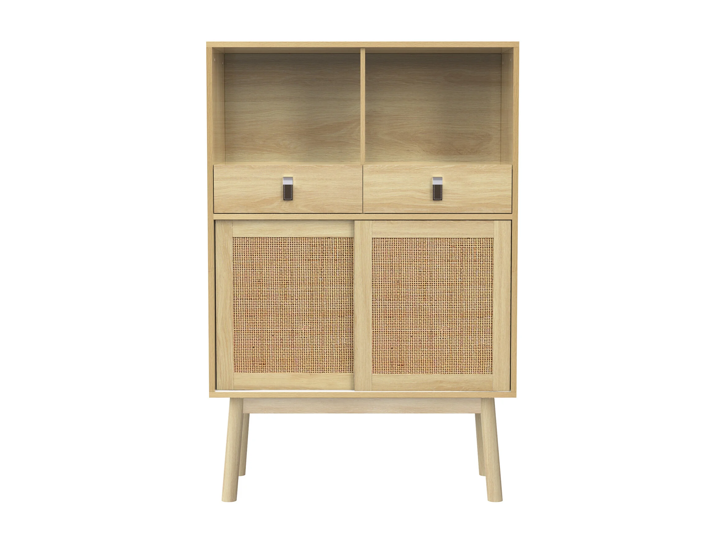 Buffet 80x39,5x120 cm, véritable tressage en rotin, deux tiroirs, deux portes et deux compartiments ouverts, pieds de table de 28 cm de hauteur