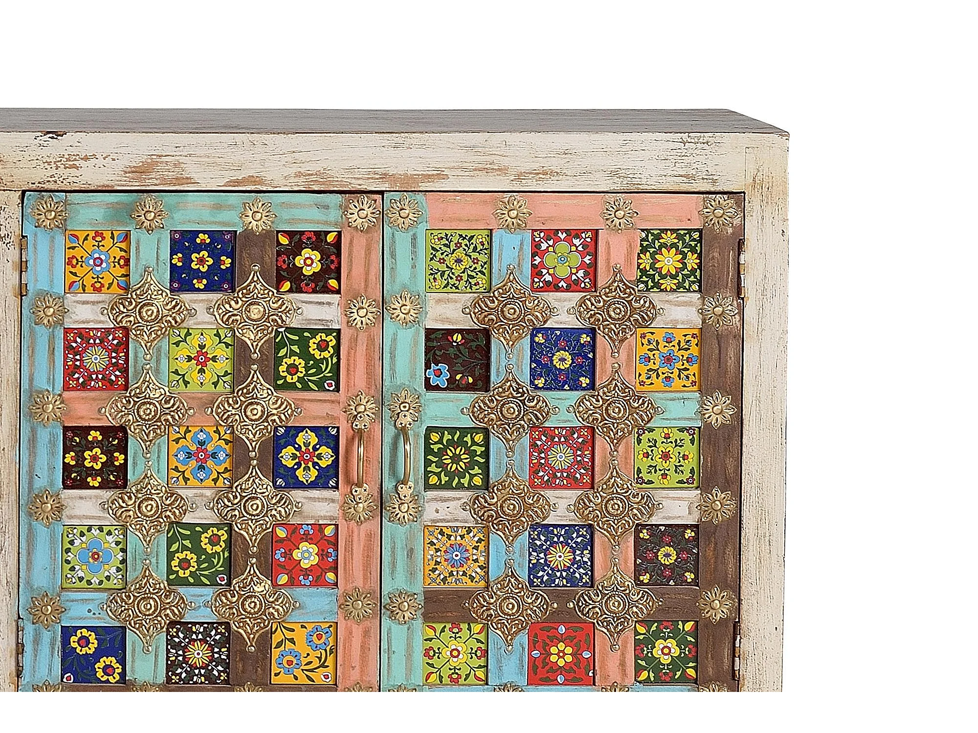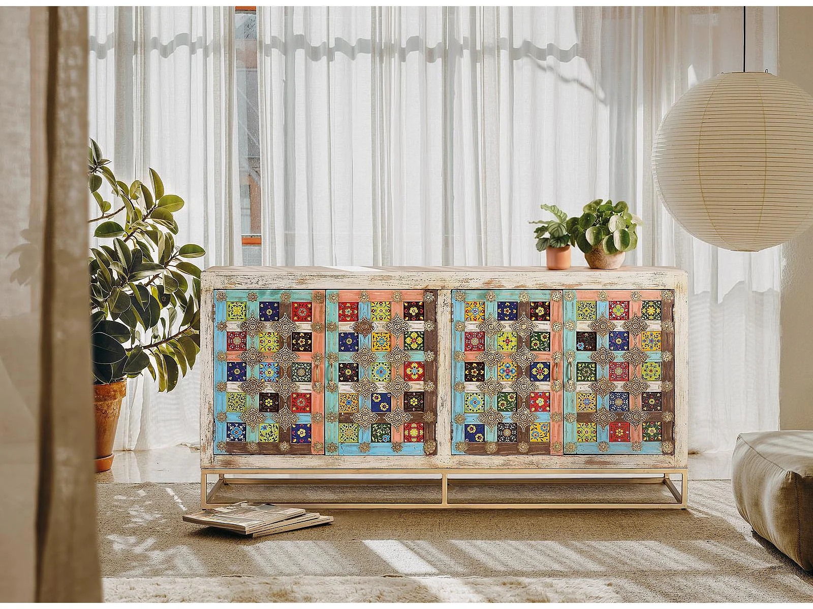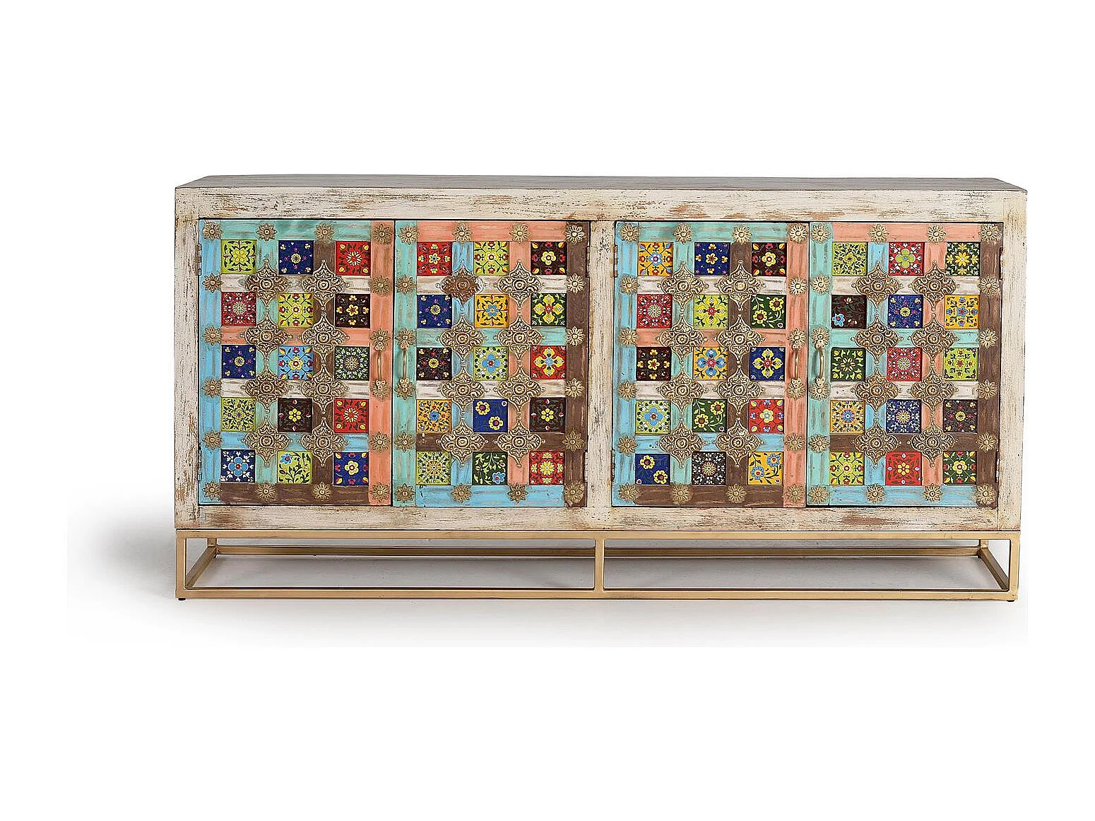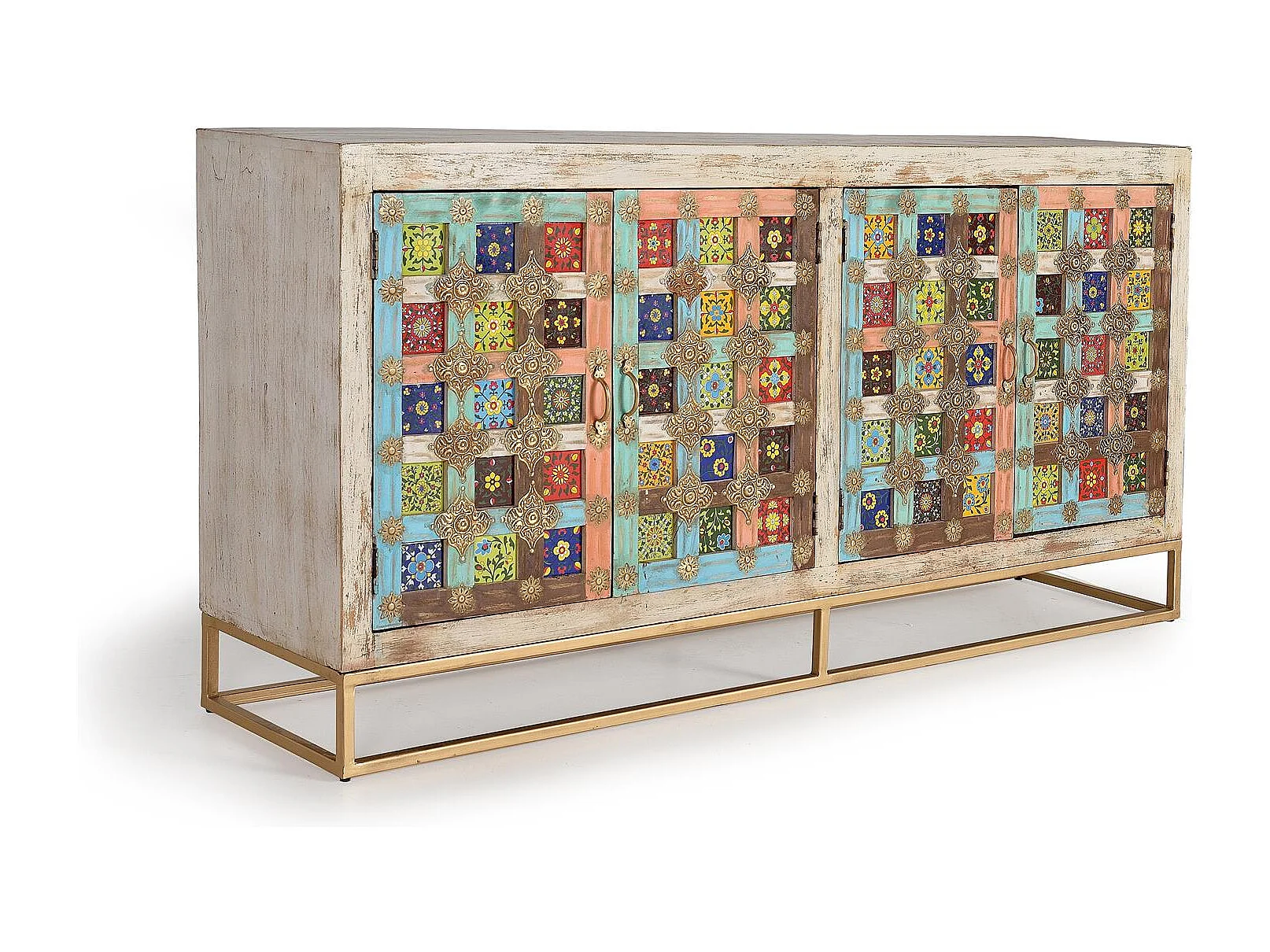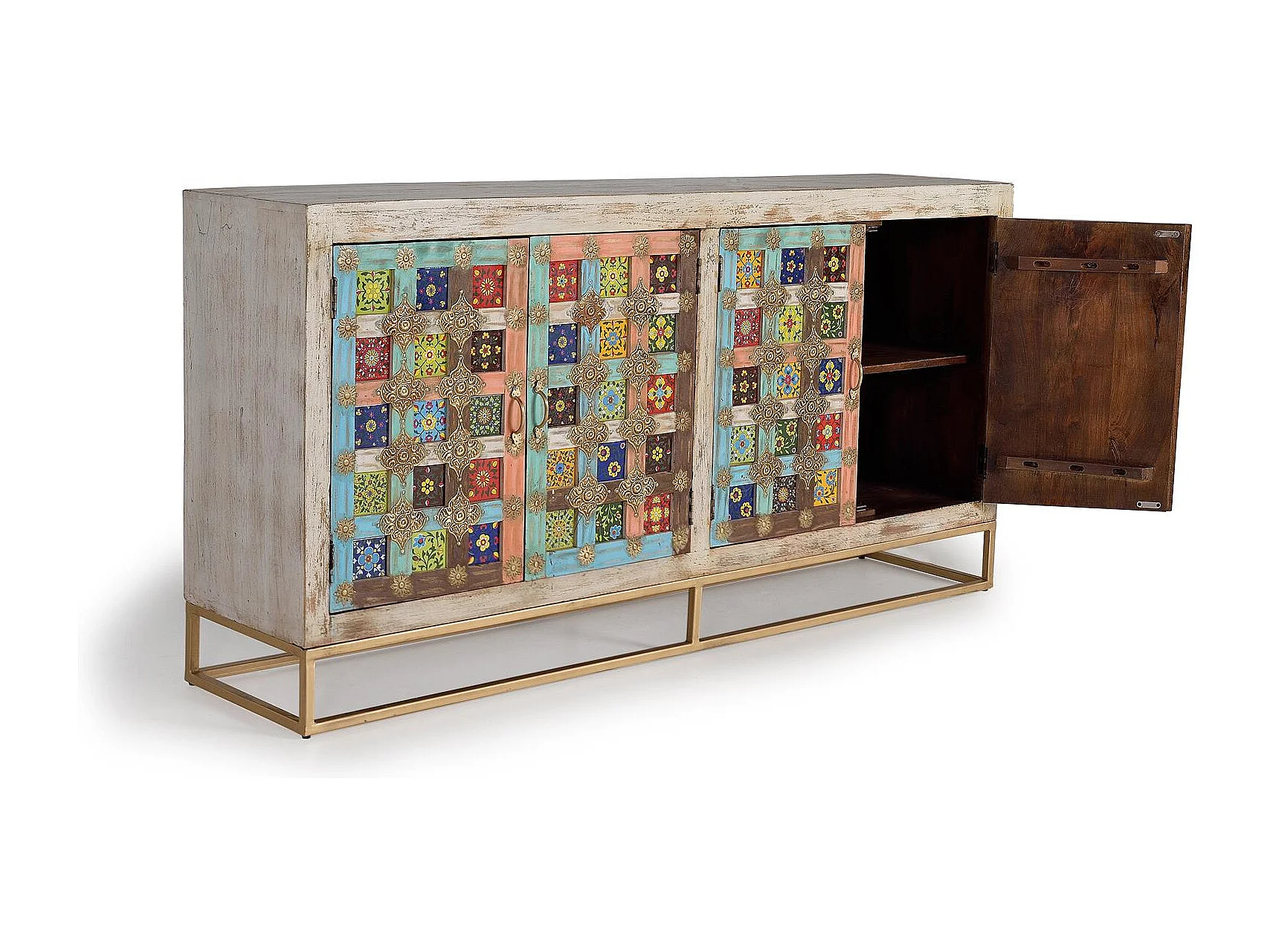 Buffet en bois de manguier avec details en maiolique et pieds en métal