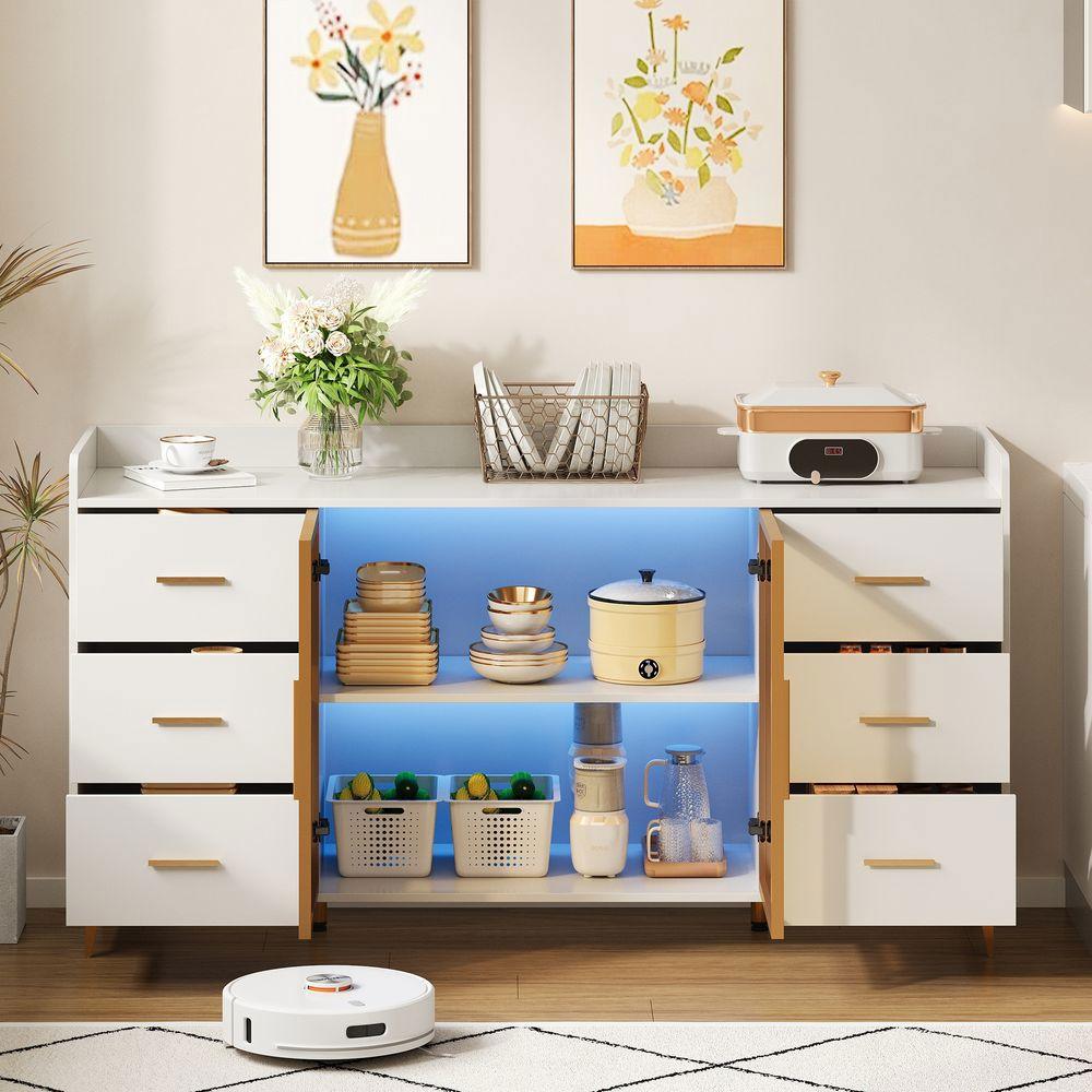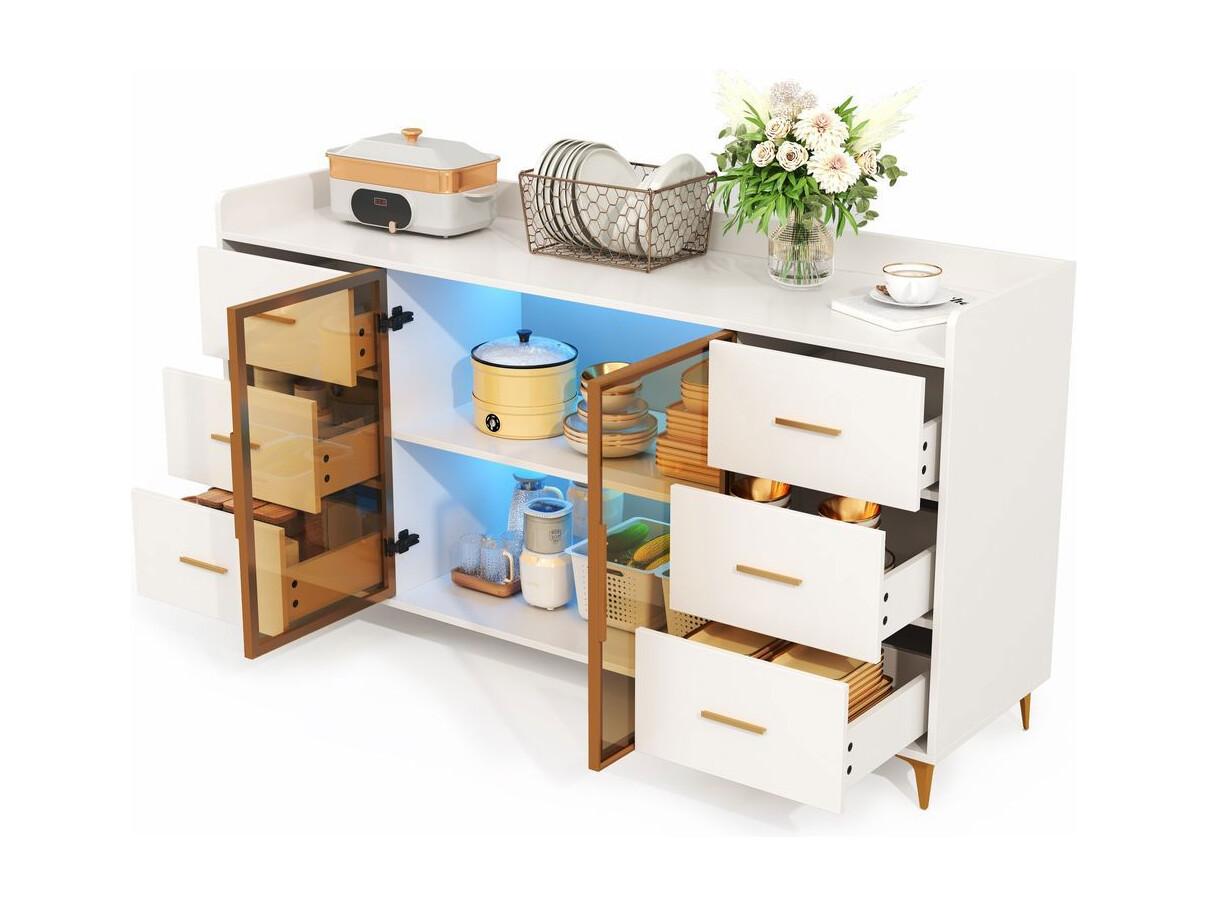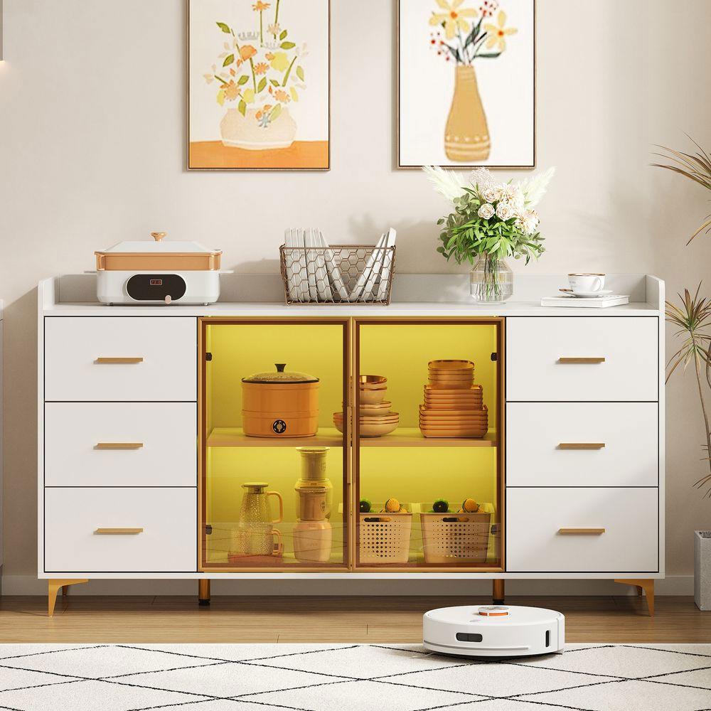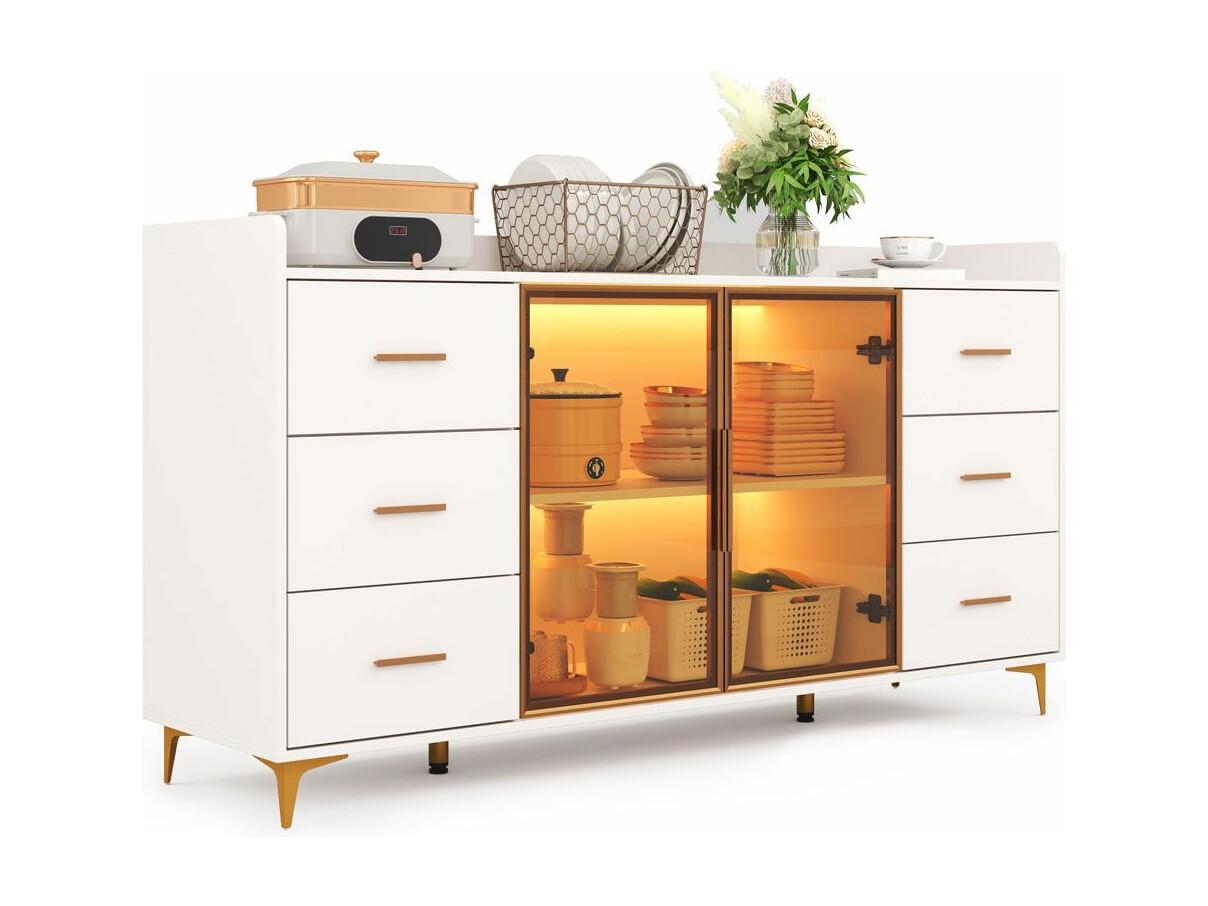 Buffet armoire cuisine moderne blanc 6 tiroirs portes verre éclairage LED télécommandé ambiance poignées métal doré adapté cuisine salon chambre