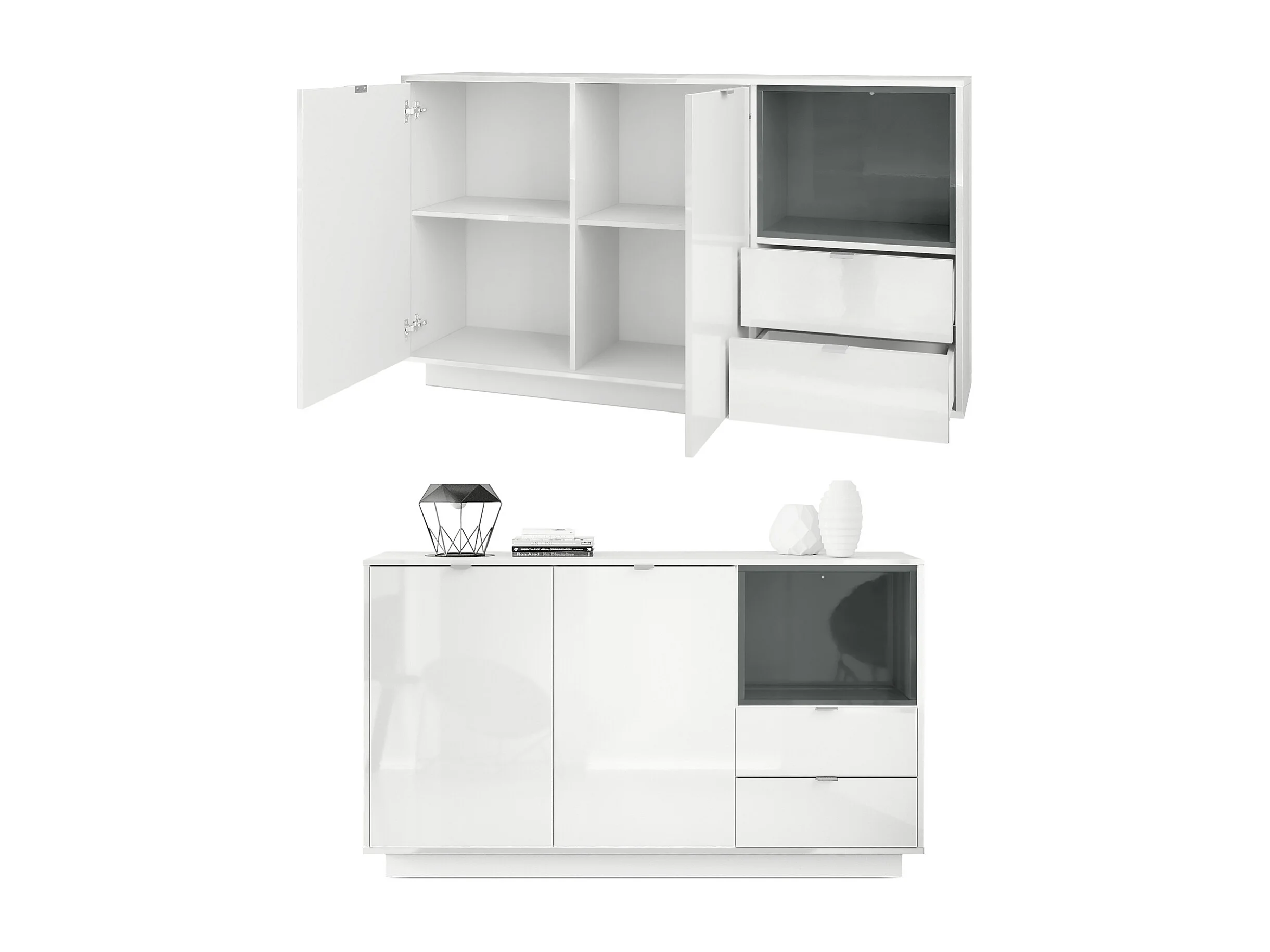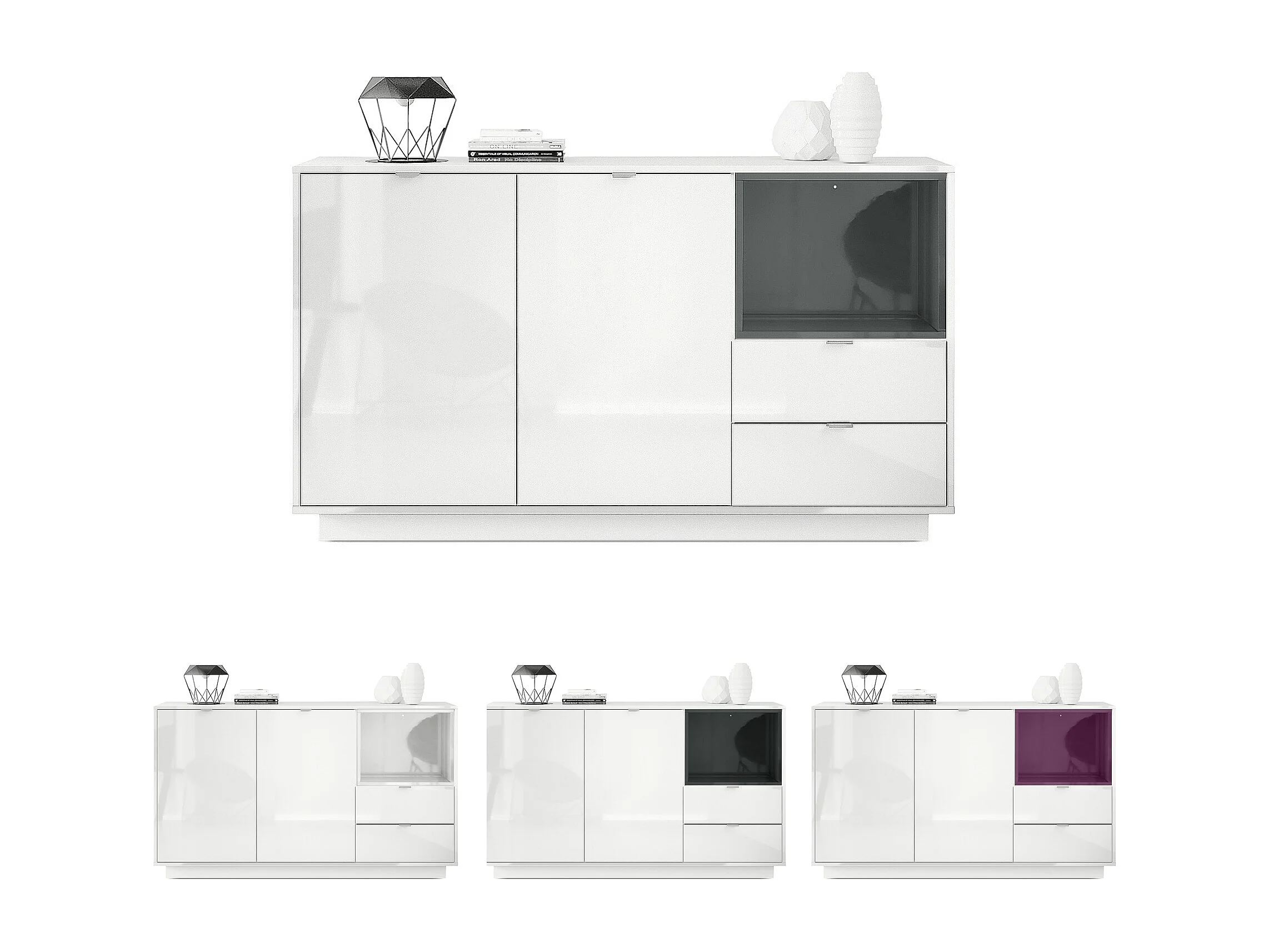 Buffet Armoire Metro, Corps en Blanc haute brillance / Façades en Blanc haute brillance avec une insertion en Chêne Nature, incl. L'éclairage LED