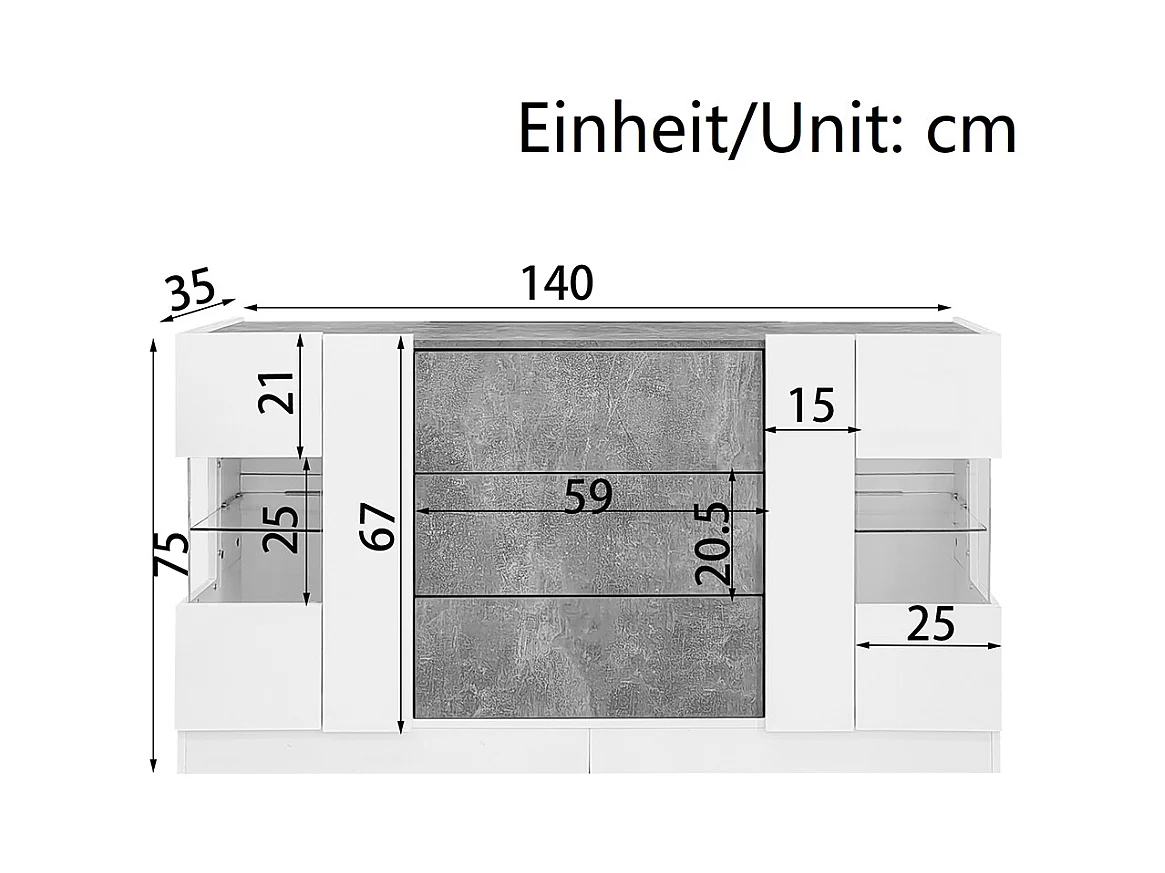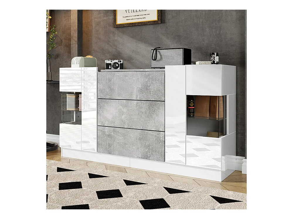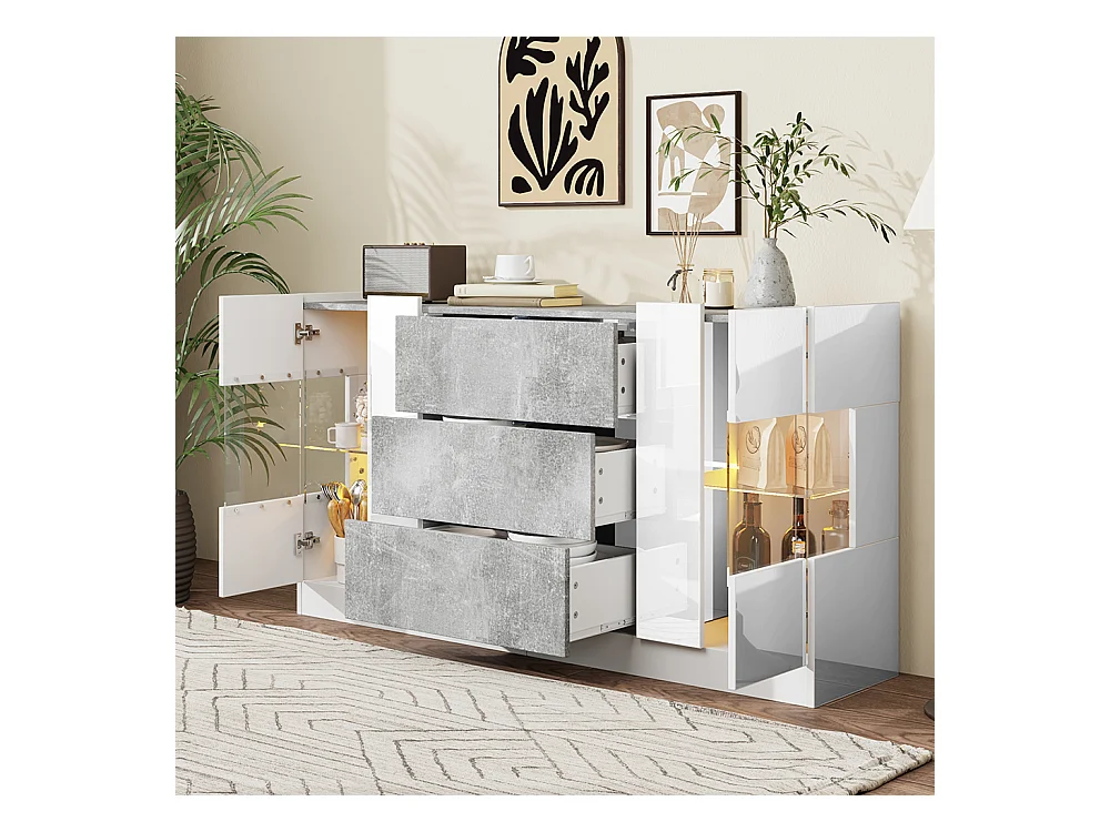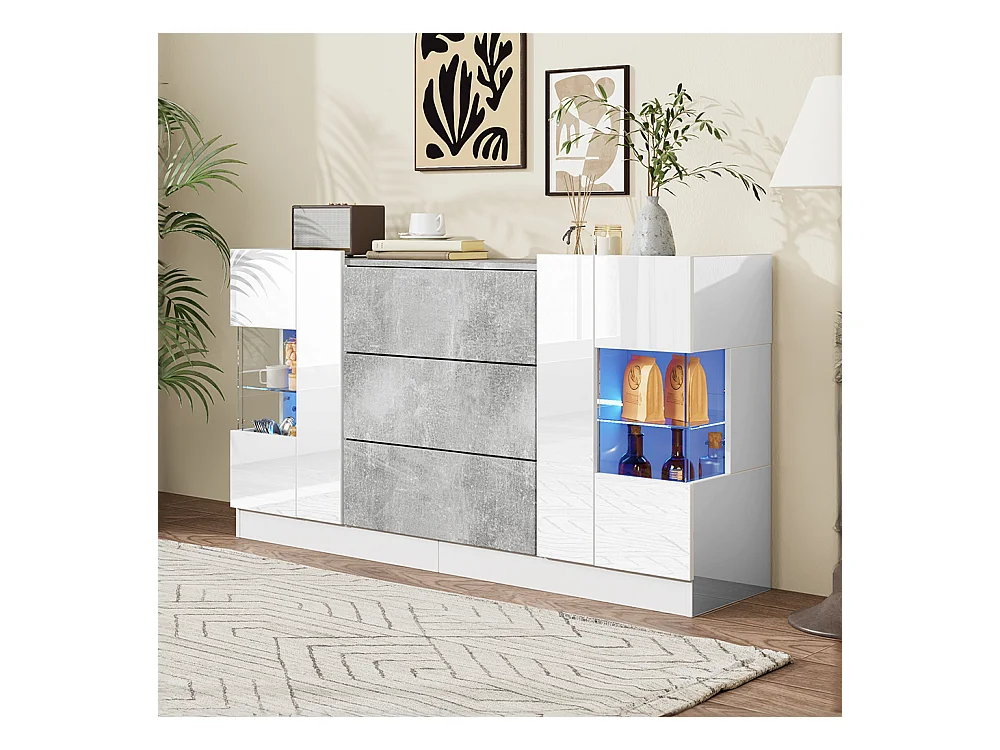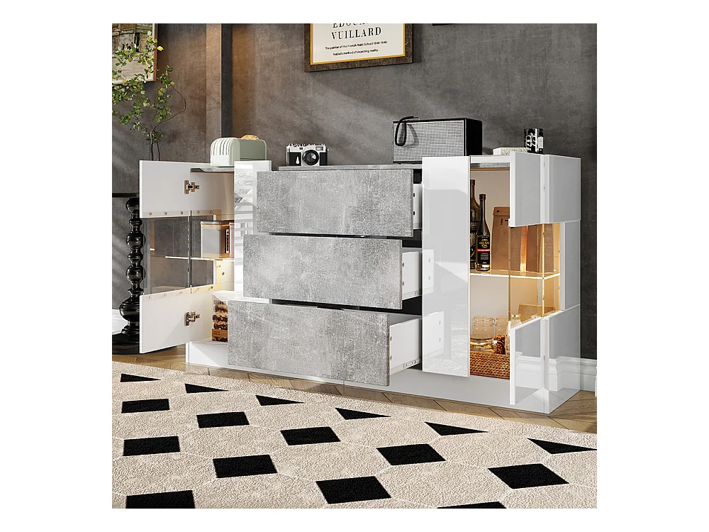 Buffet avec 2 portes et 3 tiroirs Façades blanches brillantes et aspect marbre gris éclairage LED avec 16 couleurs Blanc+Marbre