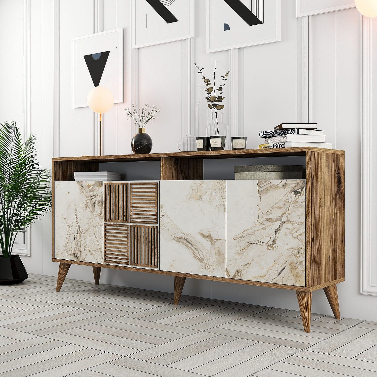 Buffet bas 4 portes et 2 tiroirs Kaltes L160cm Bois et Effet marbre Blanc
